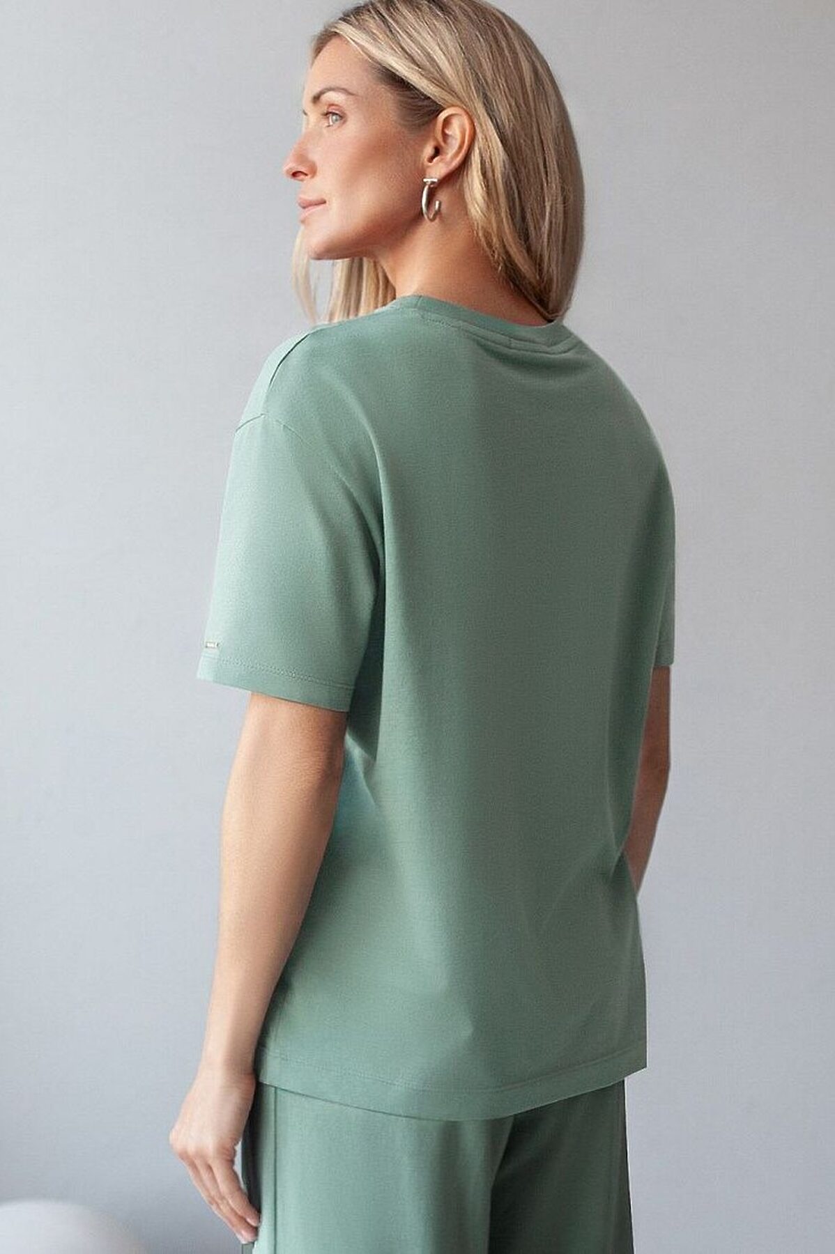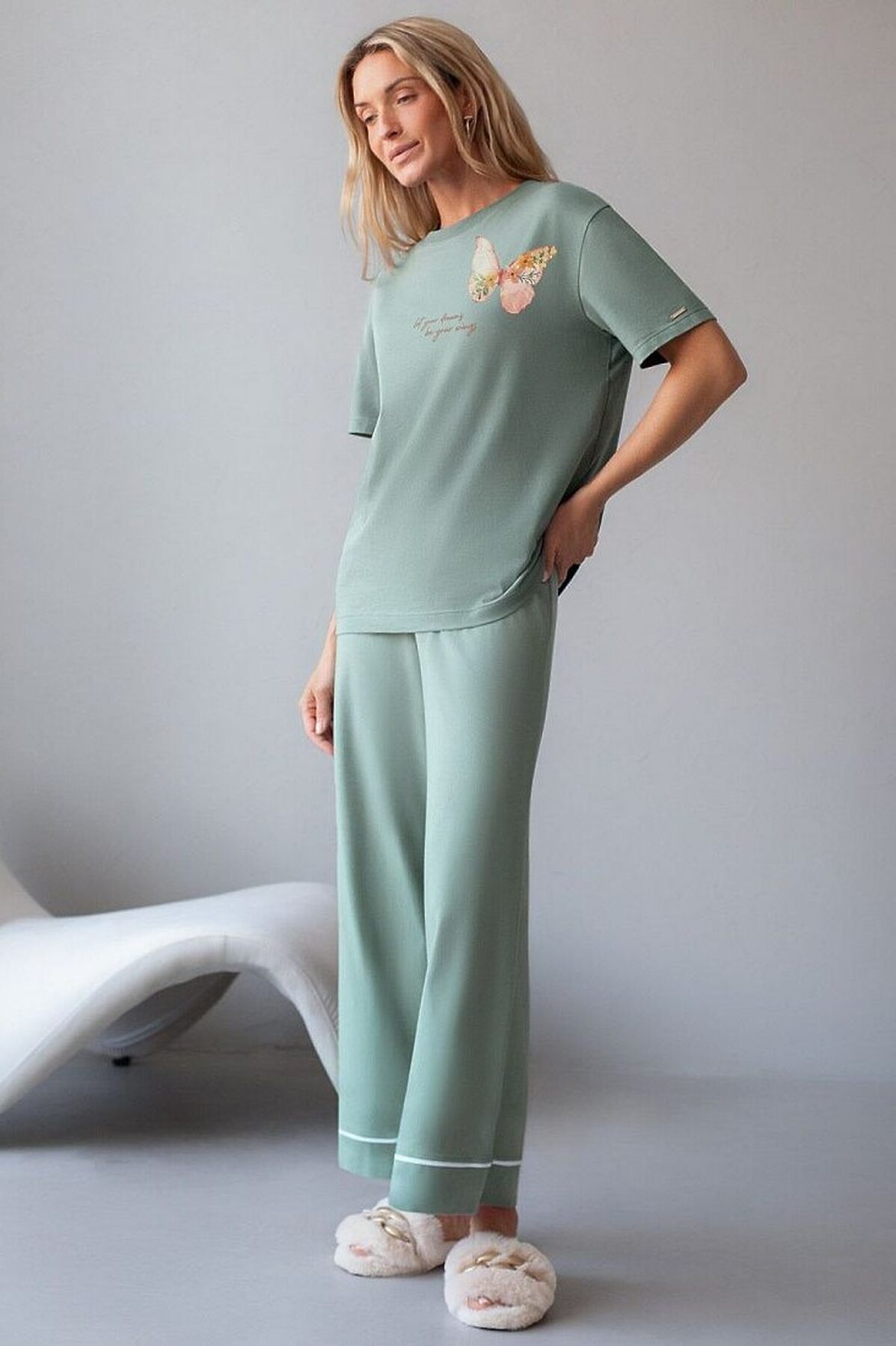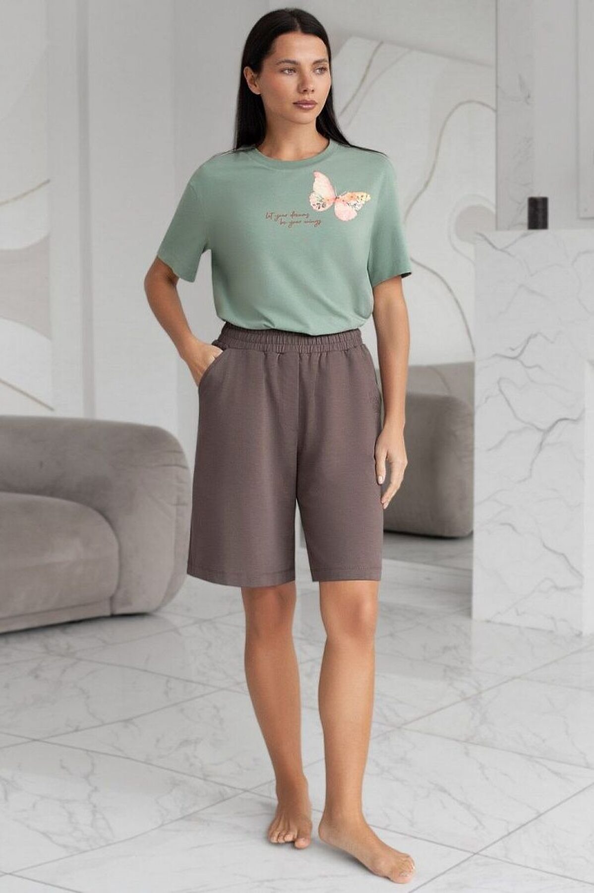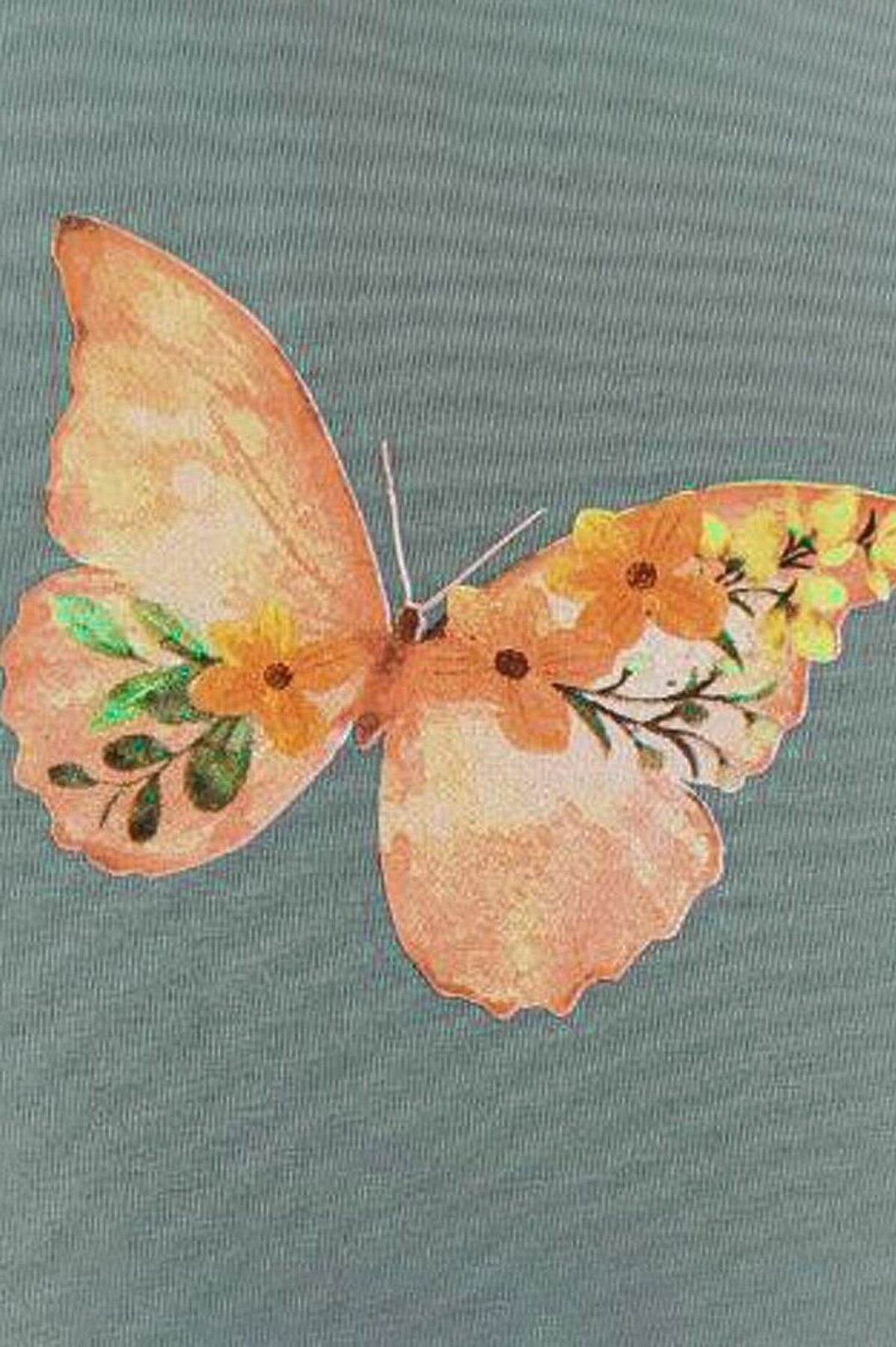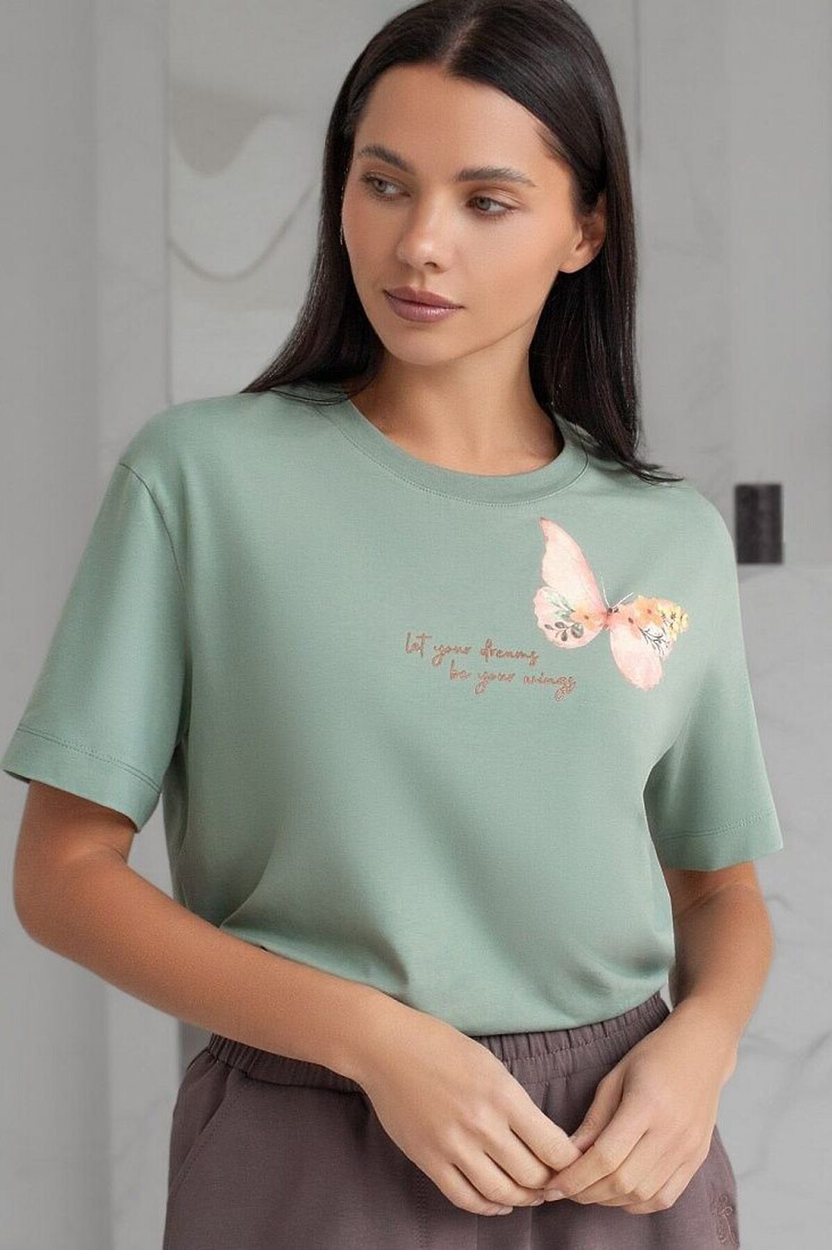 Футболка светло-оливкового цвета изготовлена из премиального хлопка с эластаном, она обеспечивает невероятное ощущение уюта и легкости. Натуральный материал сохраняет форму и цвет после множества стирок, обеспечивая долговечность изделия, а его высокая воздухопроницаемость создает ощущение свежести даже в течение долгого дня. Особое внимание привлекает стильный принт в виде бабочки с минималистичной надписью. Перевод надписи: Let your dreams be your wings - Пусть твои мечты станут твоими крыльями. Принт выполнен красками с устойчивым покрытием, который добавляет изделию оригинальности и позволяет выразить индивидуальность. Свободный крой футболки дарит удобство и не стесняет движений, что делает ее идеальной для повседневной носки или активного отдыха, подчеркивает современный взгляд на моду. На рукаве металлический логотип бренда. Подойдет девушкам и женщинам на любую фигуру, вы будете чувствовать себя в ней уверенно и комфортно. Отлично впишется в гардероб благодаря универсальному дизайну, который легк