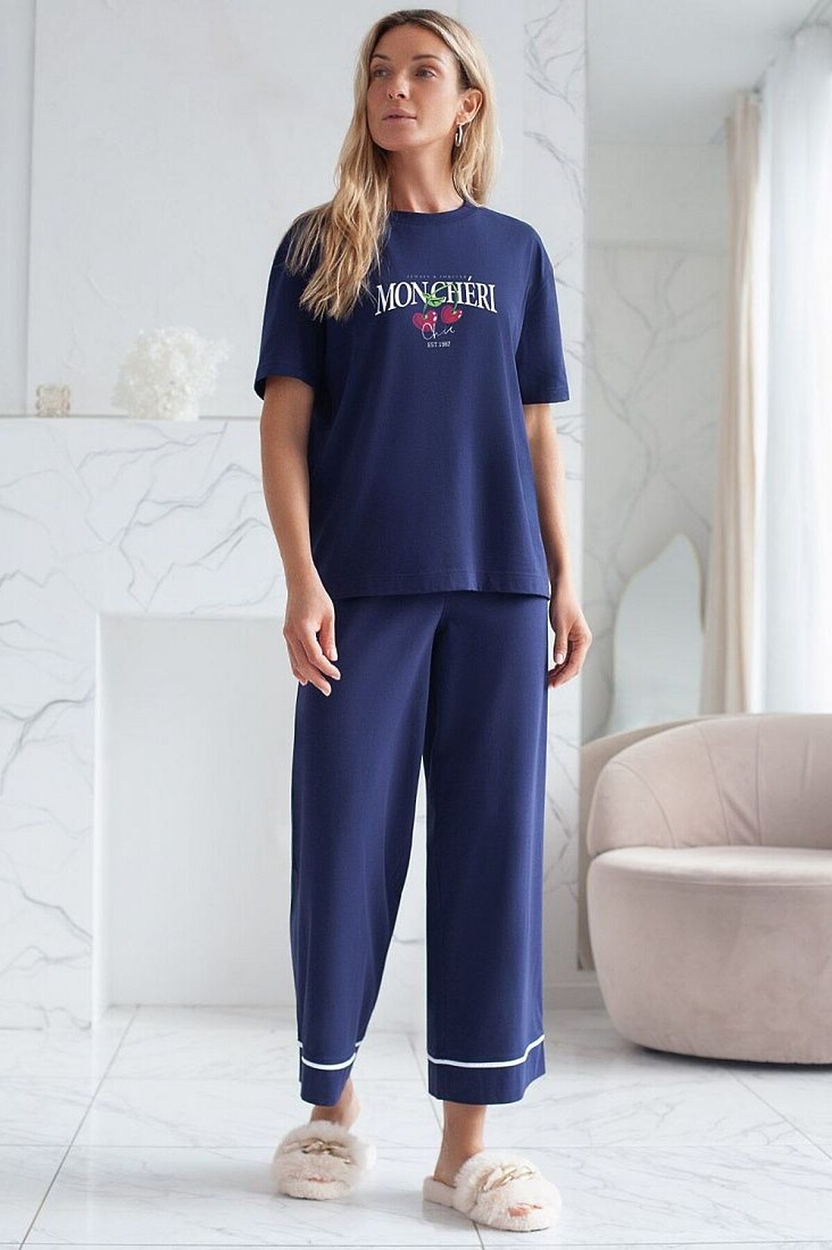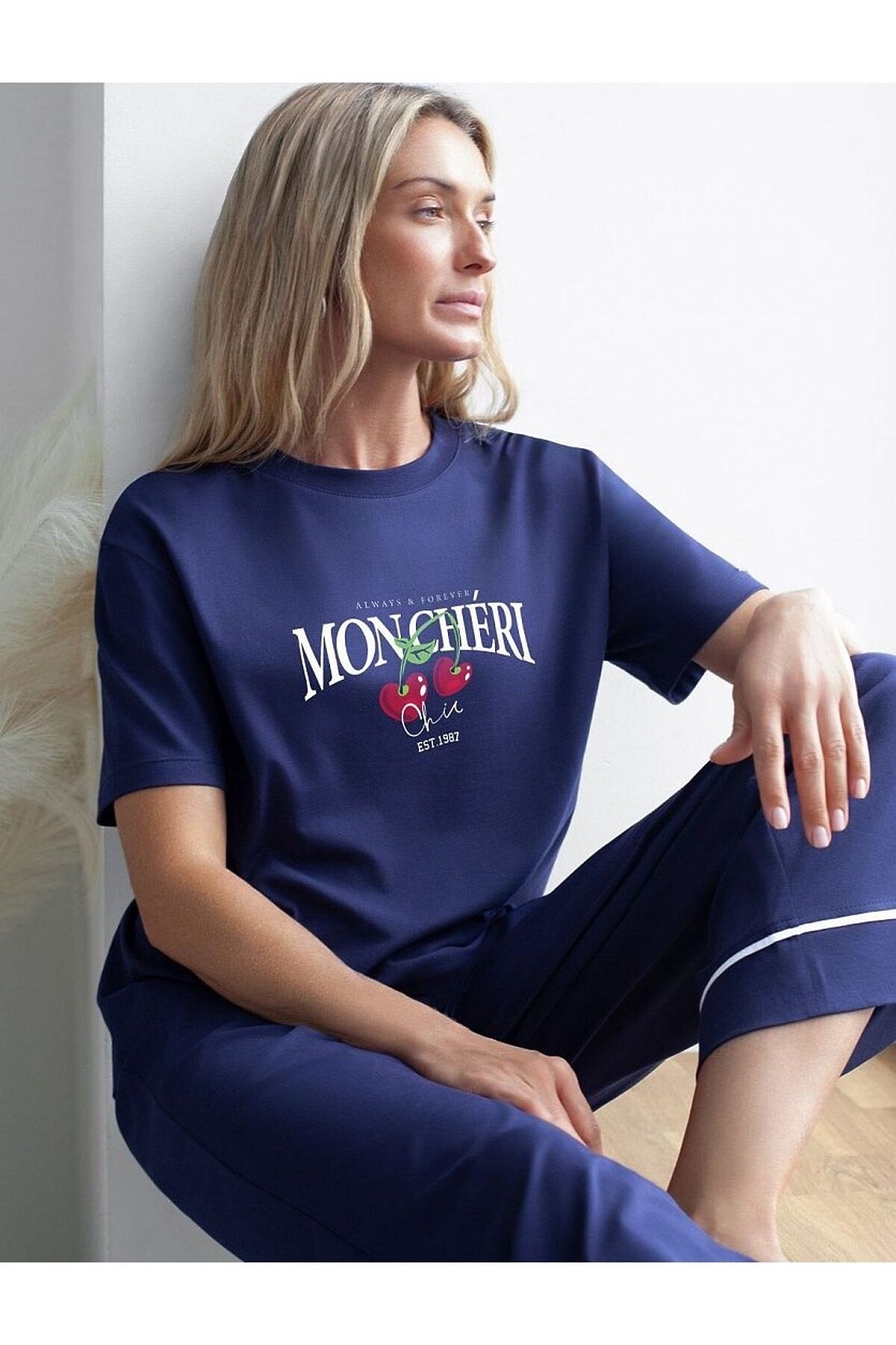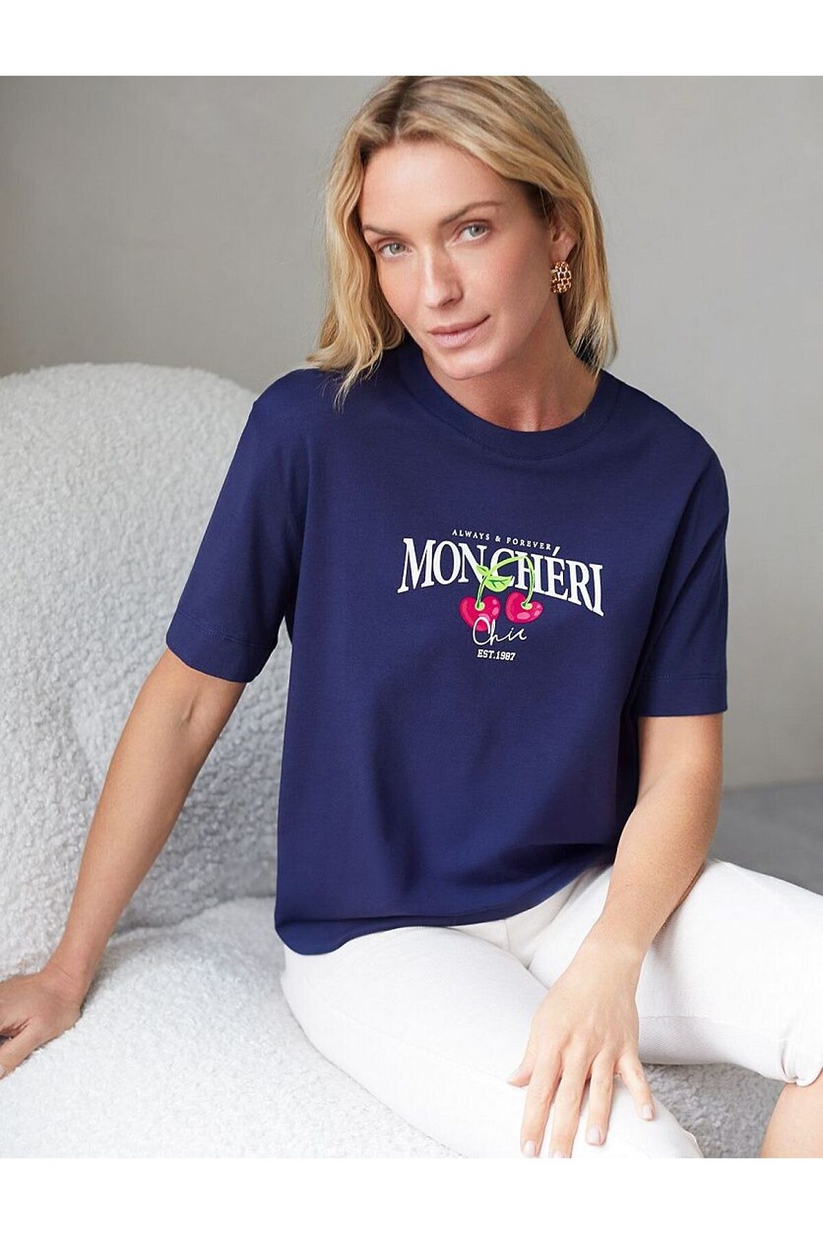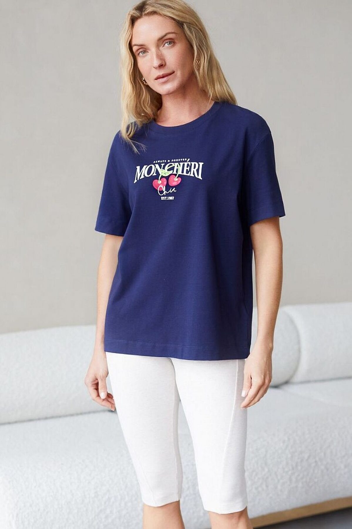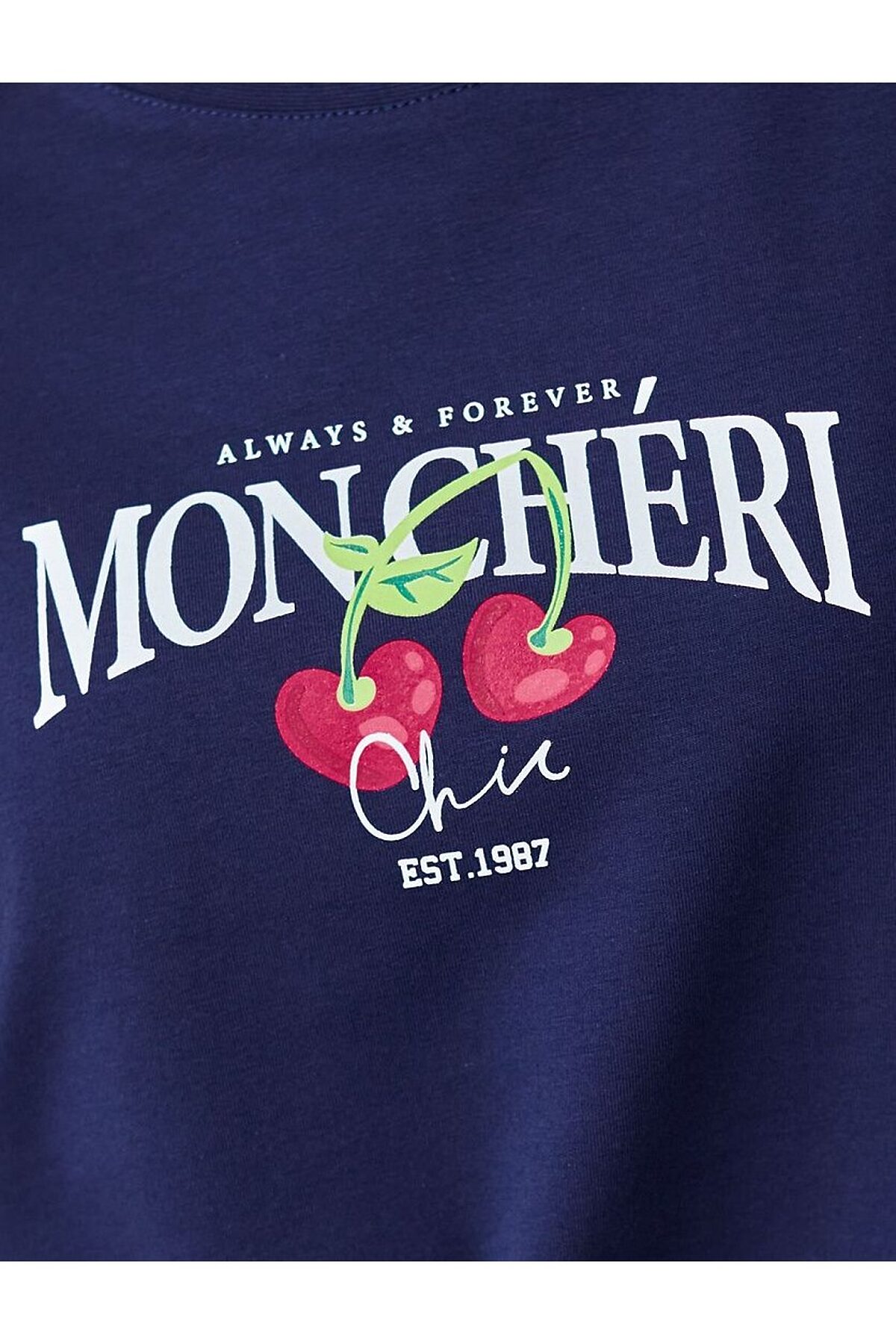 Футболка темно-синего цвета изготовлена из премиального хлопка с эластаном, она обеспечивает невероятное ощущение уюта и легкости. Натуральный материал сохраняет форму и цвет после множества стирок, обеспечивая долговечность изделия, а его высокая воздухопроницаемость создает ощущение свежести даже в течение долгого дня. Особое внимание привлекает стильный принт в виде ягод вишни с минималистичной надписью. Перевод надписи: Always and Forever Moncheri - Всегда и Навсегда Мончери. Принт выполнен красками с устойчивым покрытием, который добавляет изделию оригинальности и позволяет выразить индивидуальность. Свободный крой футболки дарит удобство и не стесняет движений, что делает ее идеальной для повседневной носки или активного отдыха, подчеркивает современный взгляд на моду. На рукаве металлический логотип бренда. Подойдет девушкам и женщинам на любую фигуру, вы будете чувствовать себя в ней уверенно и комфортно. Отлично впишется в гардероб благодаря универсальному дизайну, который легко сочетать с джинса