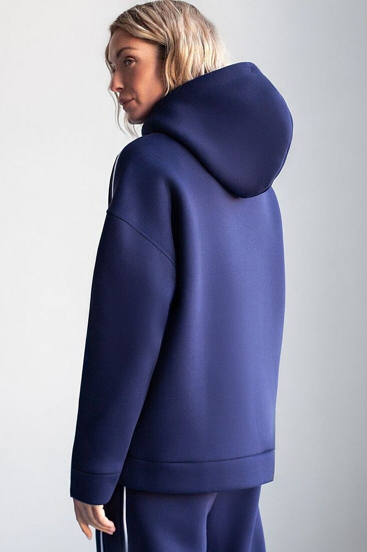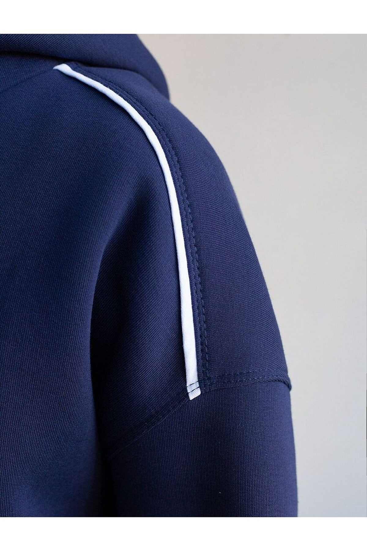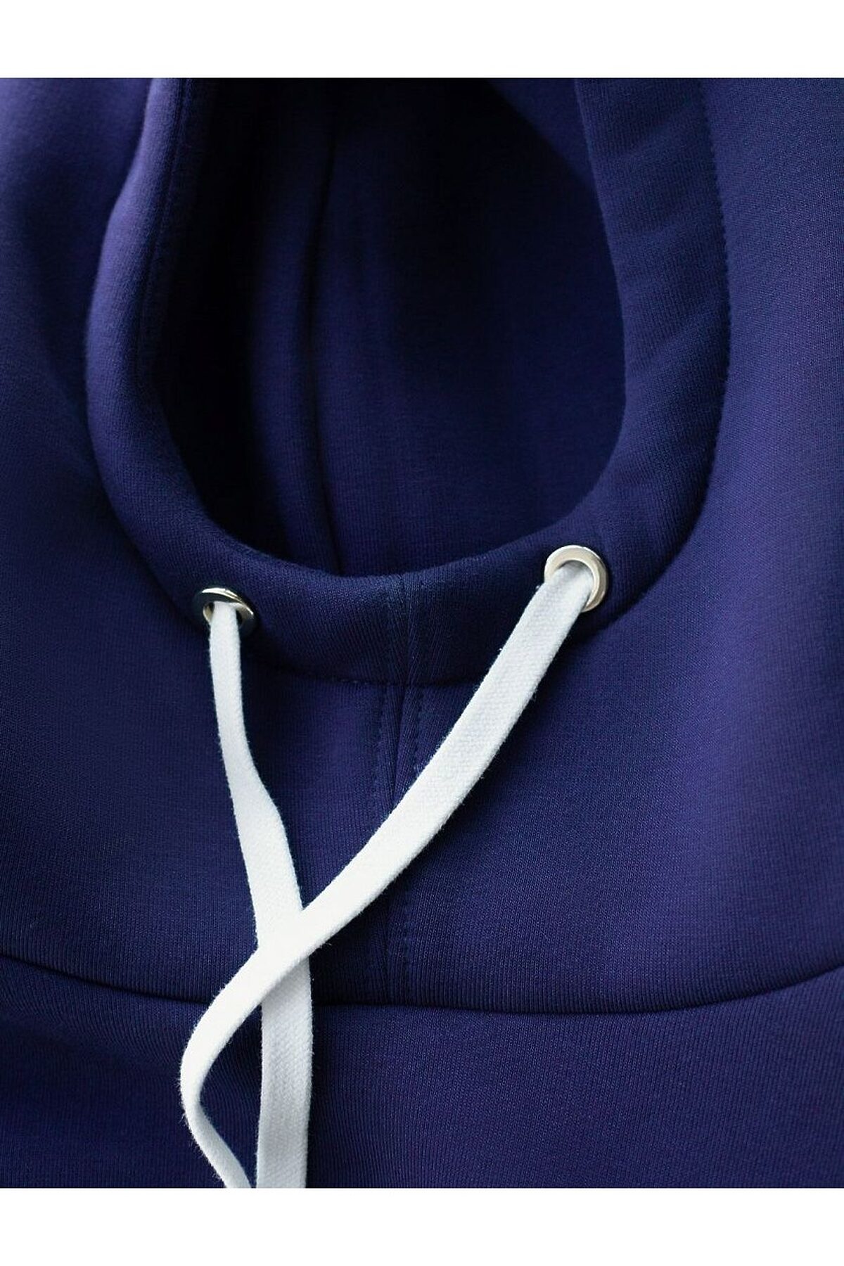 Уютное худи темно-синего цвета с цельнокроенным капюшоном и спущенной линией плеча создано для комфорта в холодную погоду. Модель выполнена из премиального футера трехнитки с мягким начесом, что обеспечивает дополнительное тепло и приятные ощущения при носке. Глубокий капюшон дополнен шнуром для регулировки объема, что обеспечивает отличную защиту от ветра и холода, а серебристая фурнитура добавляет стильный акцент к современному худи. Элементы дизайна — минималистичная вышивка с логотипом бренда и тонкие онтрастные лампасы — делают худи более выразительным без перегруженности деталями, сохраняя эстетичность и современный вид. Эластичные манжеты на рукавах обеспечивают дополнительную защиту от продувания, способствуя сохранению тепла внутри. Натуральный хлопок гарантирует дышащий эффект, позволяя сохранять оптимальный микроклимат тела даже при длительном ношении. Благодаря эластану в составе повседневное худи подходит для активного отдыха, вы будете чувствовать себя свободно в любой ситуации. Представлены бол