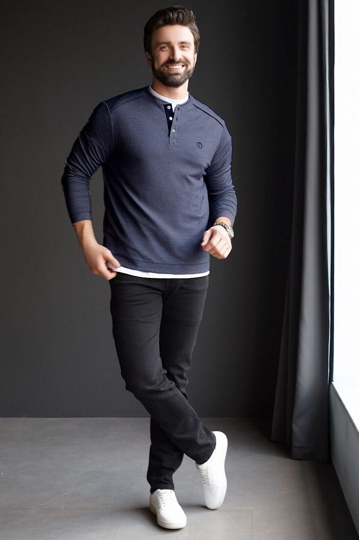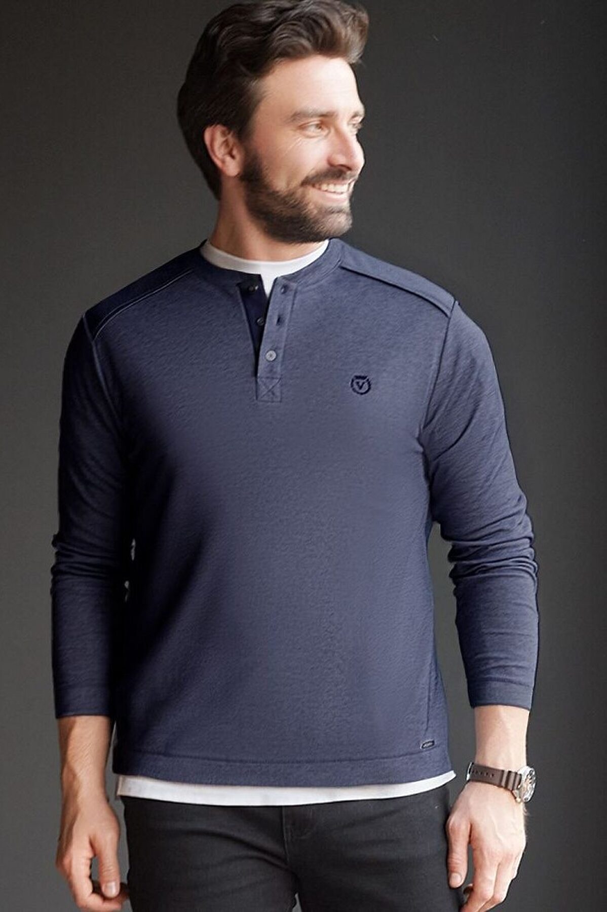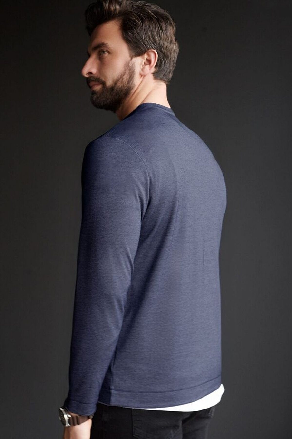 Джемпер хенли темно-синего цвета из полотна пике, состоящий из двух оттенков нити, создающем эффект меланж. Мягкая и дышащая ткань обеспечивает комфорт в течение всего дня, позволяя коже дышать и поддерживать оптимальную воздухопроницаемость. Материал тянется, обеспечивает долговечность и сохраняет презентабельный внешний вид даже после многократных стирок. Контрастная планка и пуговицы в благородном матовом металле поддерживают стиль old money, а аккуратная нашивка на груди в виде логотипа бренда подчеркивает статусность. По бокам аккуратные разрезы для свободы движений и дополнительного удобства. Джемпер подходит для любых ситуаций — от деловых встреч до повседневных прогулок. Такая вещь станет универсальным решением для тех, кто ценит удобство и элегантность в одежде. Лаконичный дизайн легко сочетается с джинсами или брюками, что позволяет создавать разные образы.