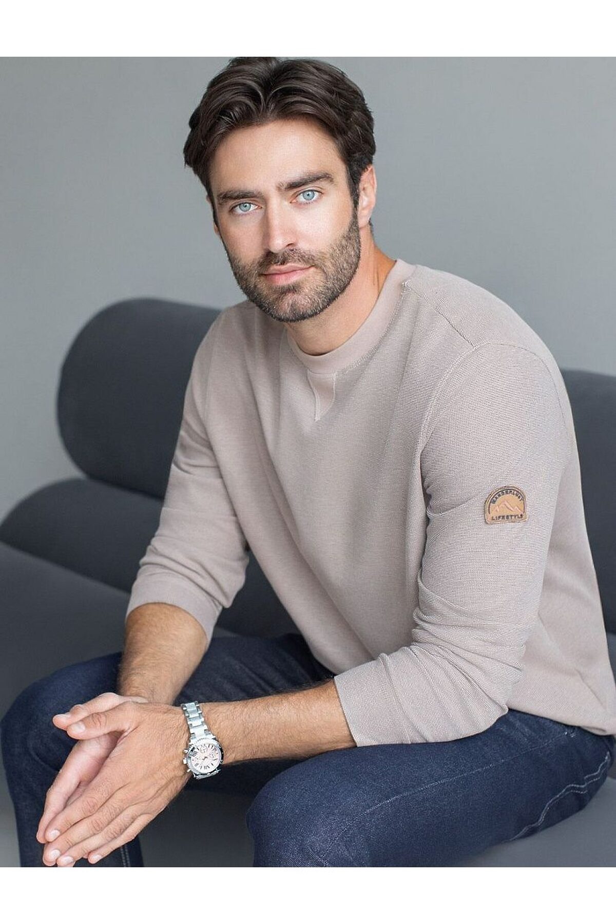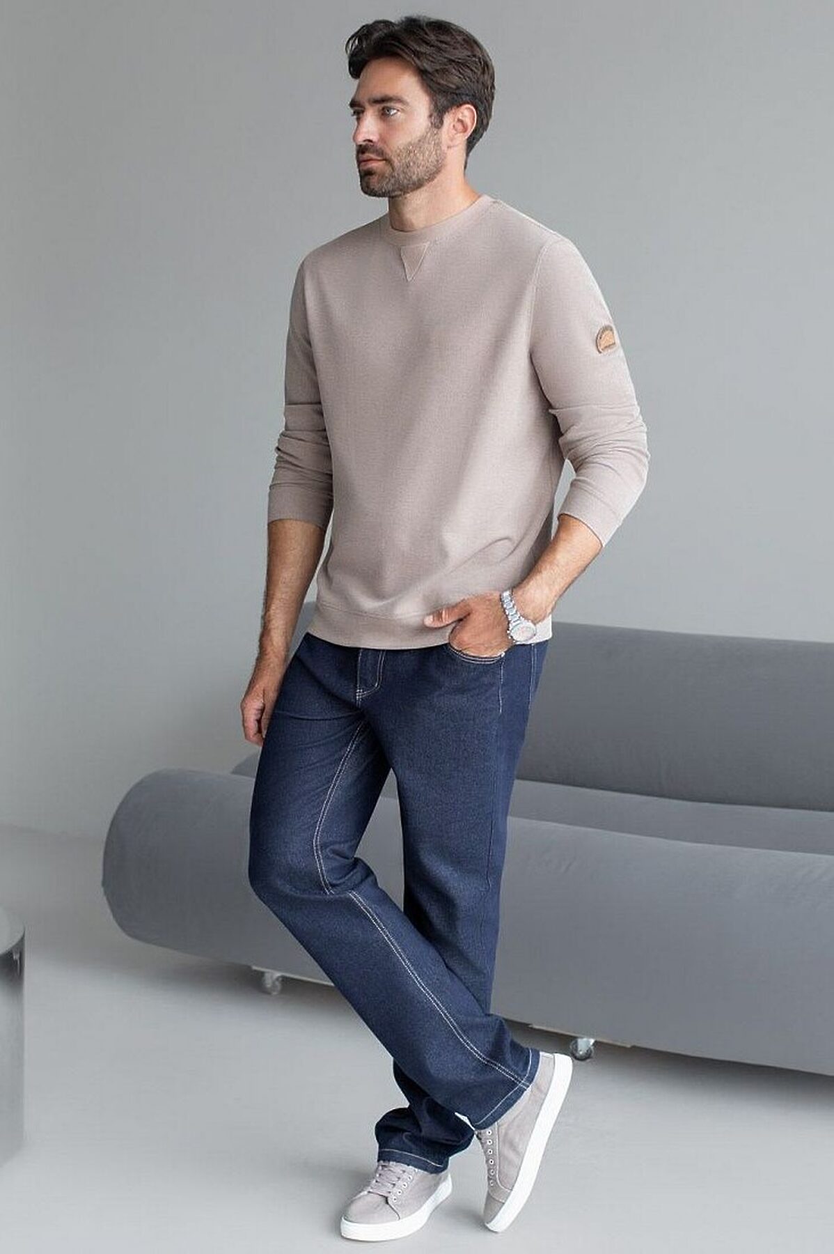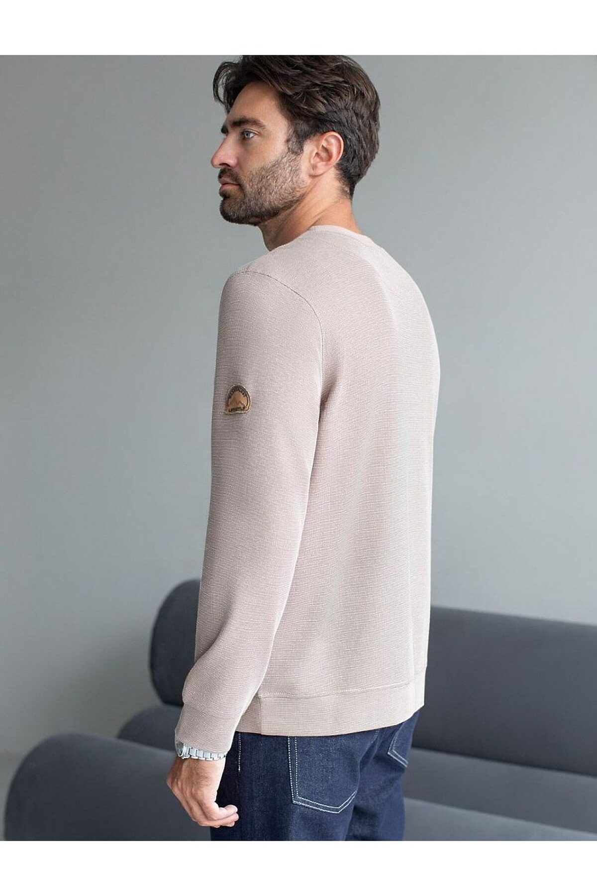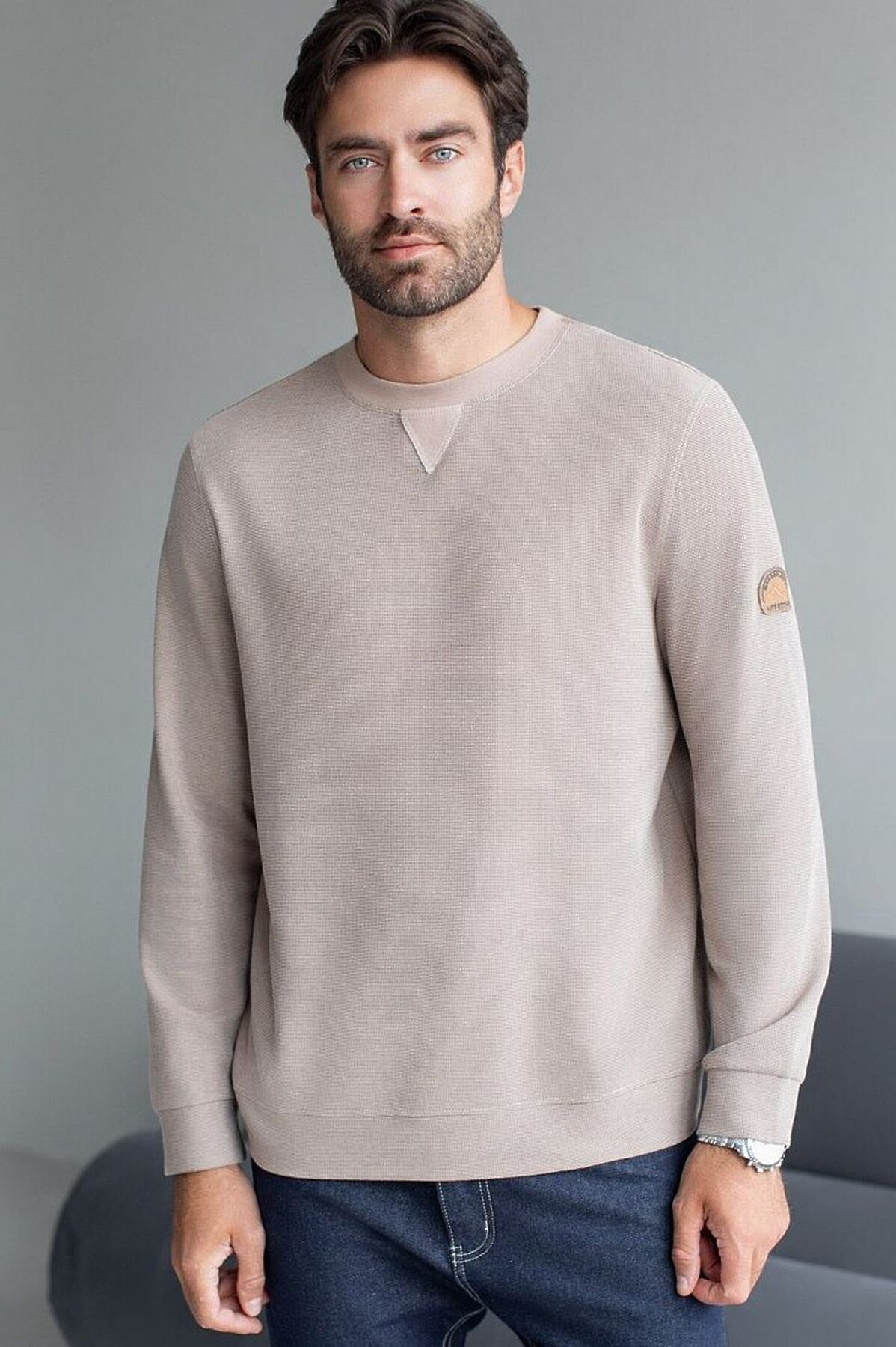 Легкий и невероятно комфортный джемпер коричневого цвета создан для повседневного образа. Мягкий фактурный эластичный трикотаж приятно ощущается на теле, не сковывает движения и отлично подходит для носки в любое время года. Полуприлегающий крой обеспечивает свободу и удобство, позволяя выглядеть стильно и чувствовать себя уверенно каждый день. Круглый ворот украшен декоративной нашивкой в виде перевернутого треугольника, добавляющей оригинальности.. Манжеты на рукавах и по низу аккуратно оформлены, что придает завершенность внешнему виду и способствует сохранению формы джемпера после длительной носки и многочисленных стирок. На груди нашивка из экокожи в виде логотипа бренда, подчеркивающая индивидуальность каждого мужчины. Свободный фасон делает этот повседневный джемпер универсальным решением для разных типов фигуры. Эластичность материала гарантирует отличную посадку без ощущения стеснения. Джемпер легко сочетается с различными элементами одежды: от классических брюк до повседневных джинсов, позволяя соз