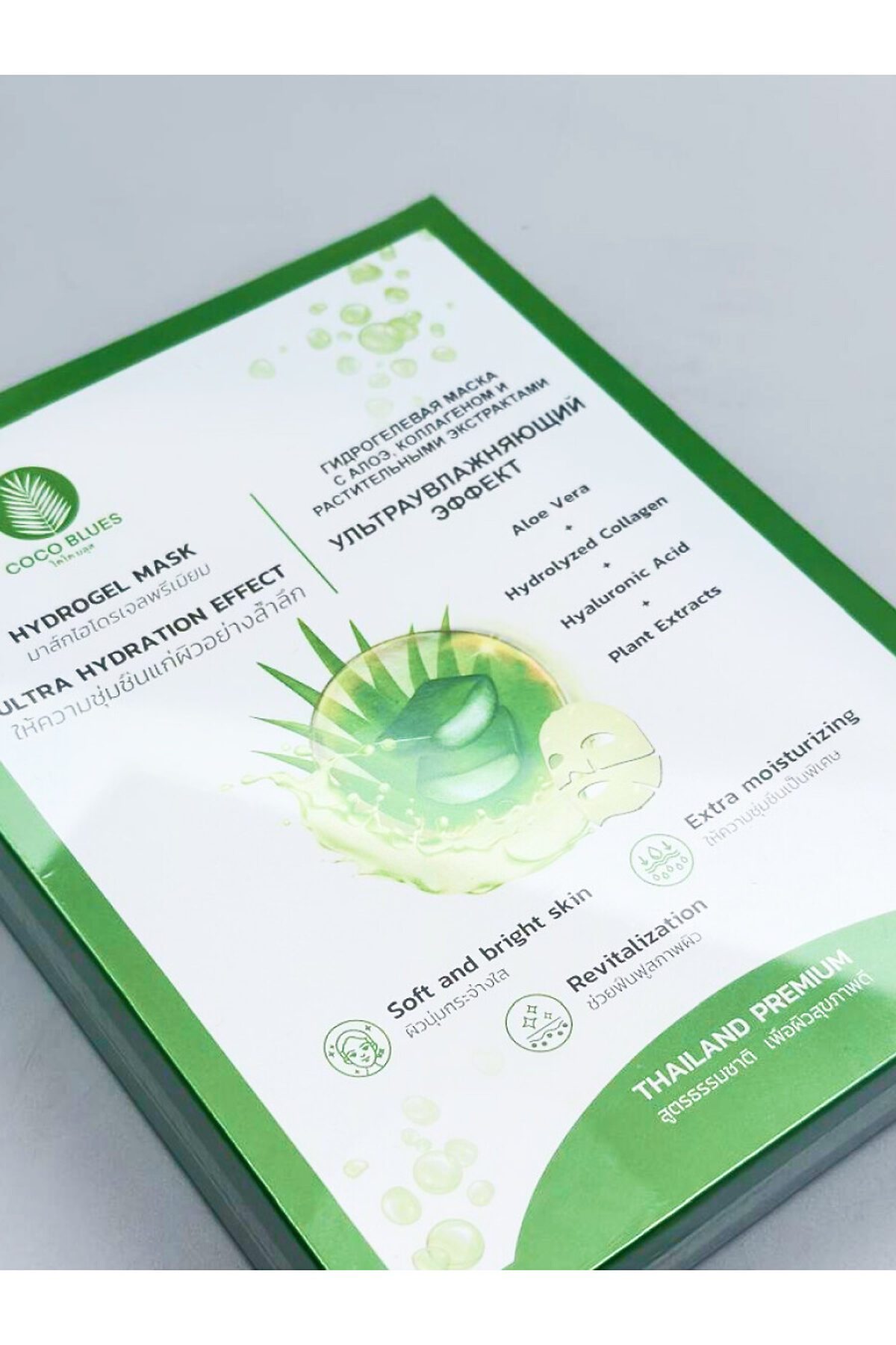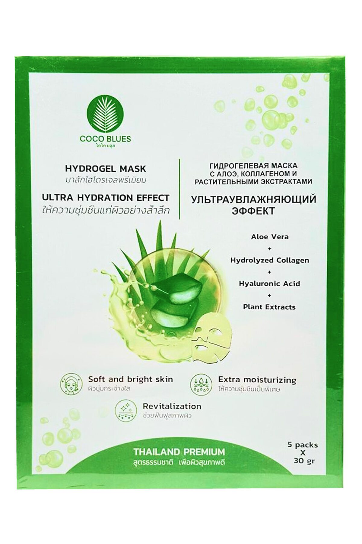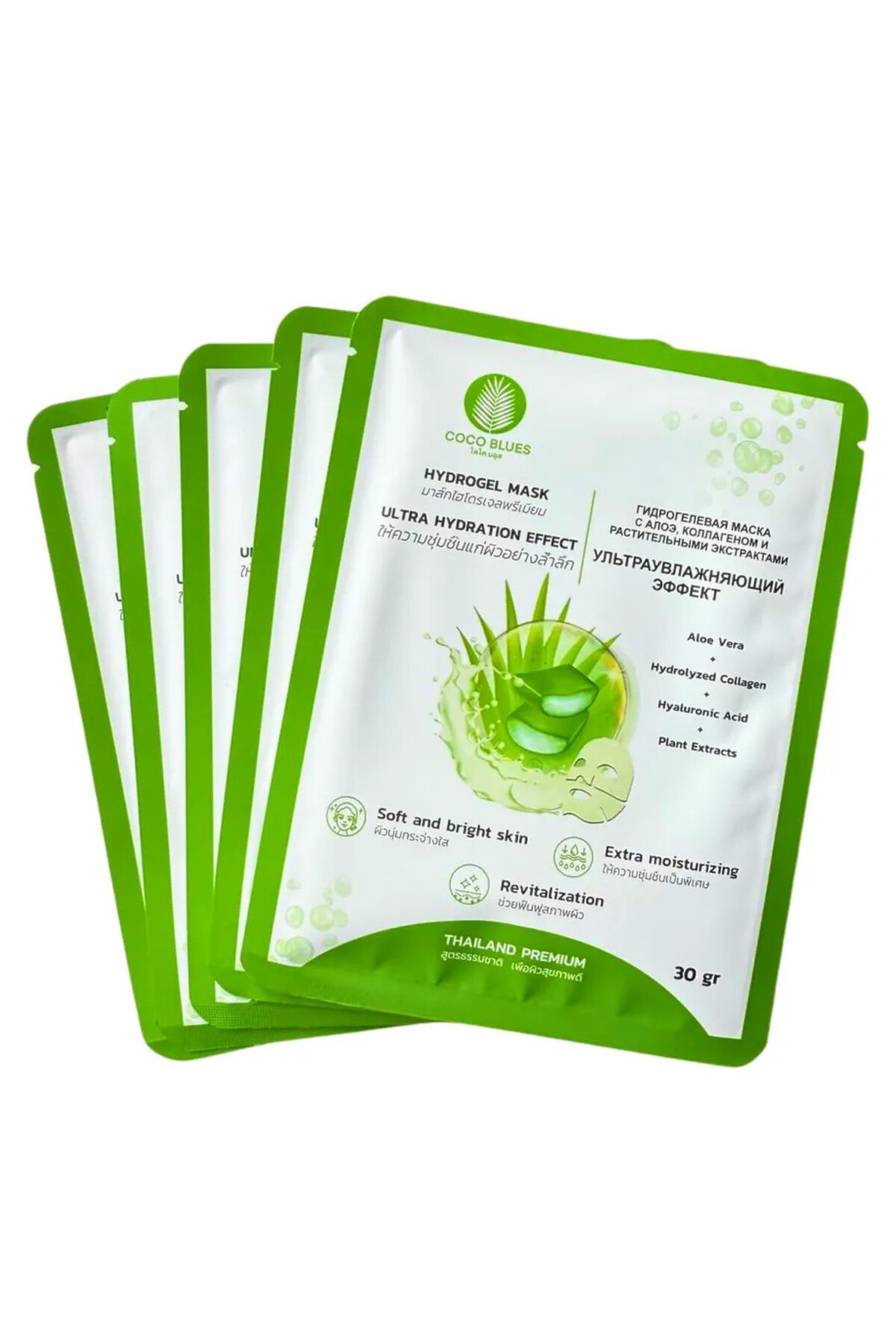 Coco Blues Гидрогелевая маска для лица с алоэ, коллагеном и растительными экстрактами / Ультраувлажняющий эффект, 5 шт. х 30 г KRISTALLER, зелёный