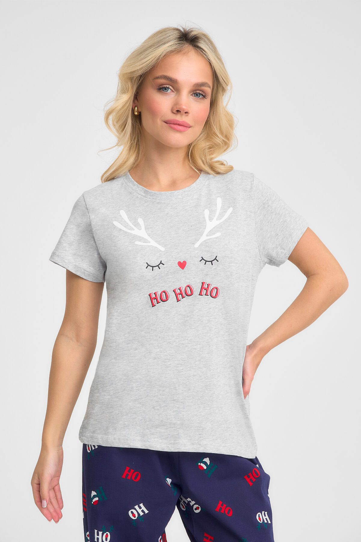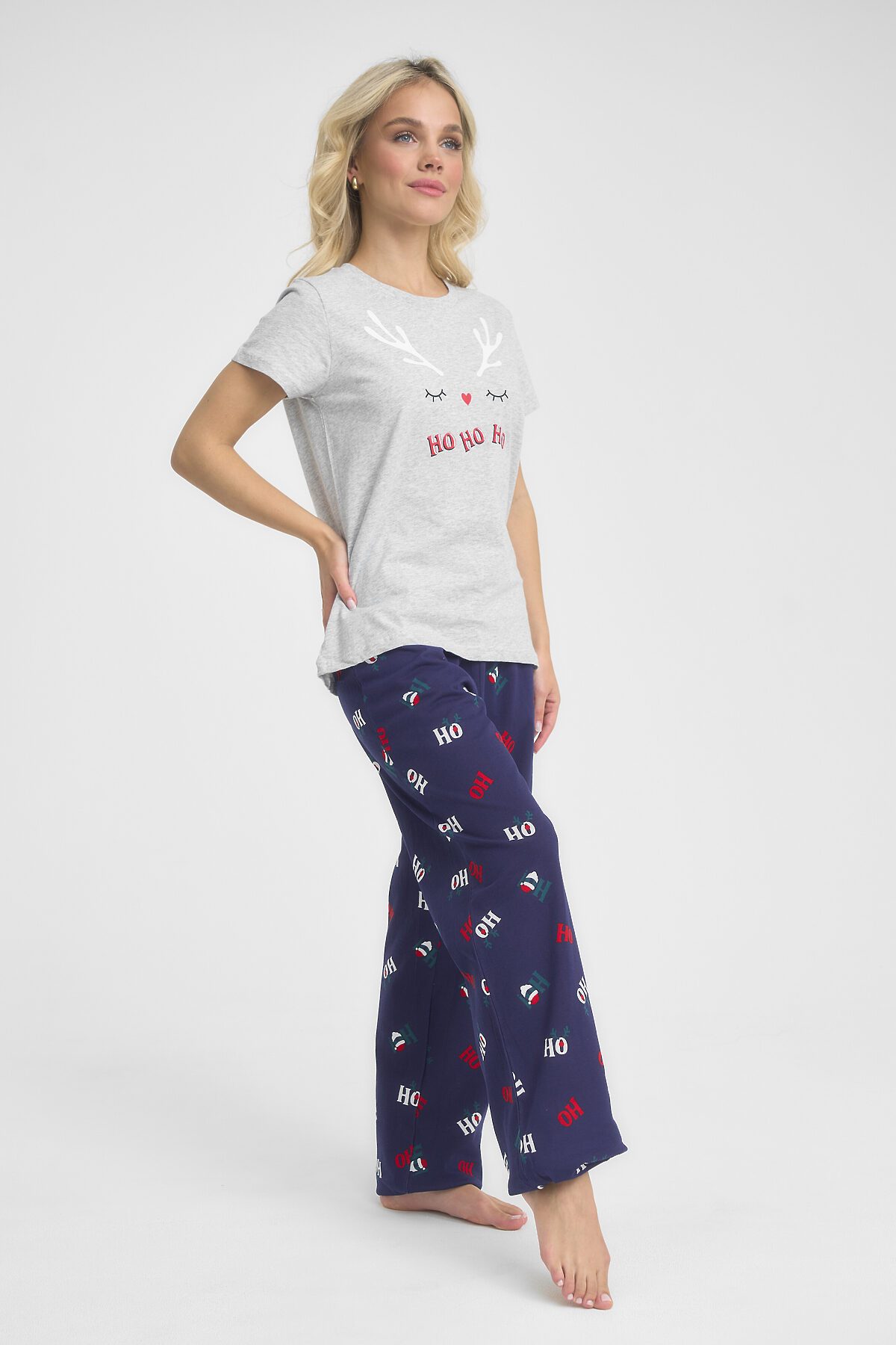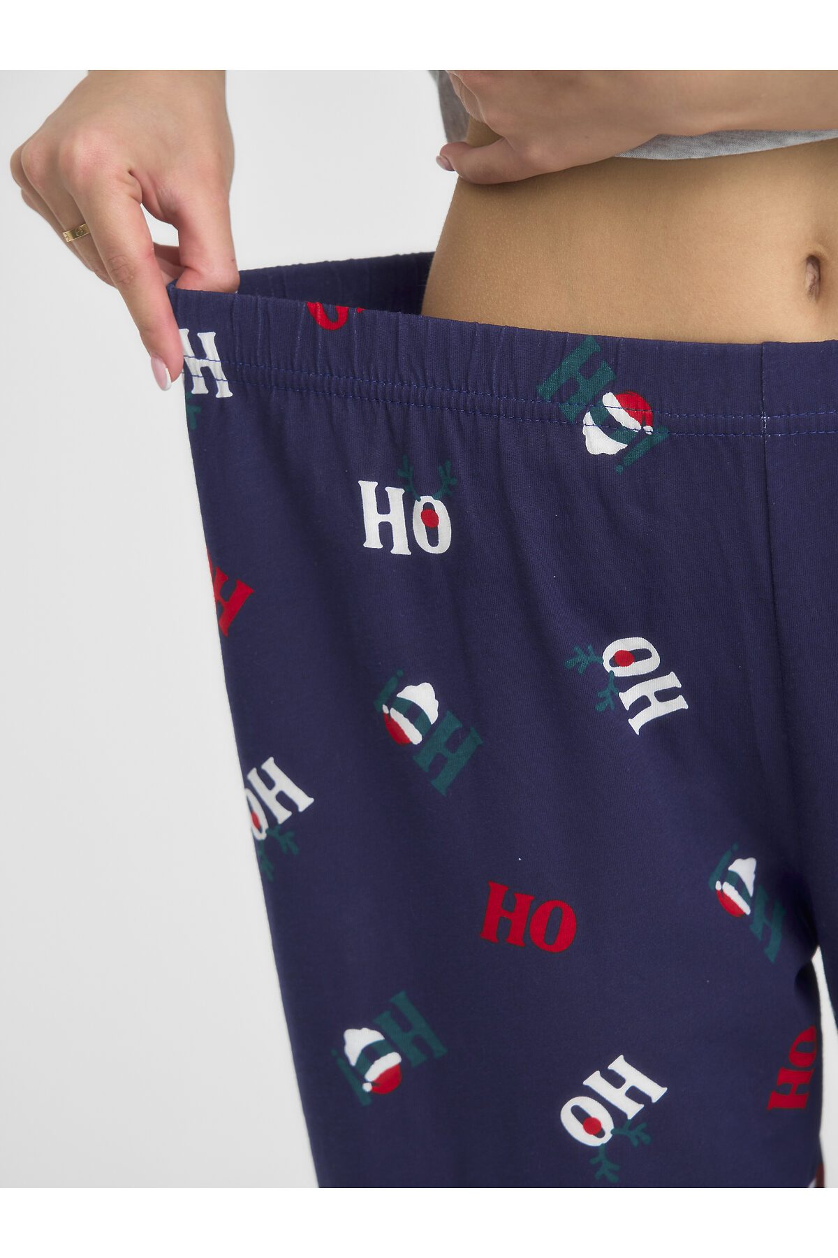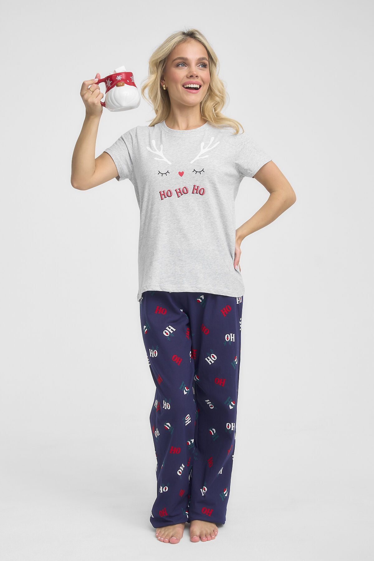 Трикотажная пижама с Новогодней тематикой. Серая футболка свободного кроя длиной до бердра украшена принтом рожки, глазки и носик оленя и надписью "Ho Ho Ho" . Брюки на резинке, свободного кроя, темно-синего цвета в белые и красные принтованые слоги "HO" .