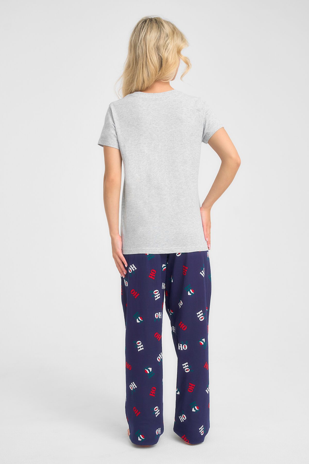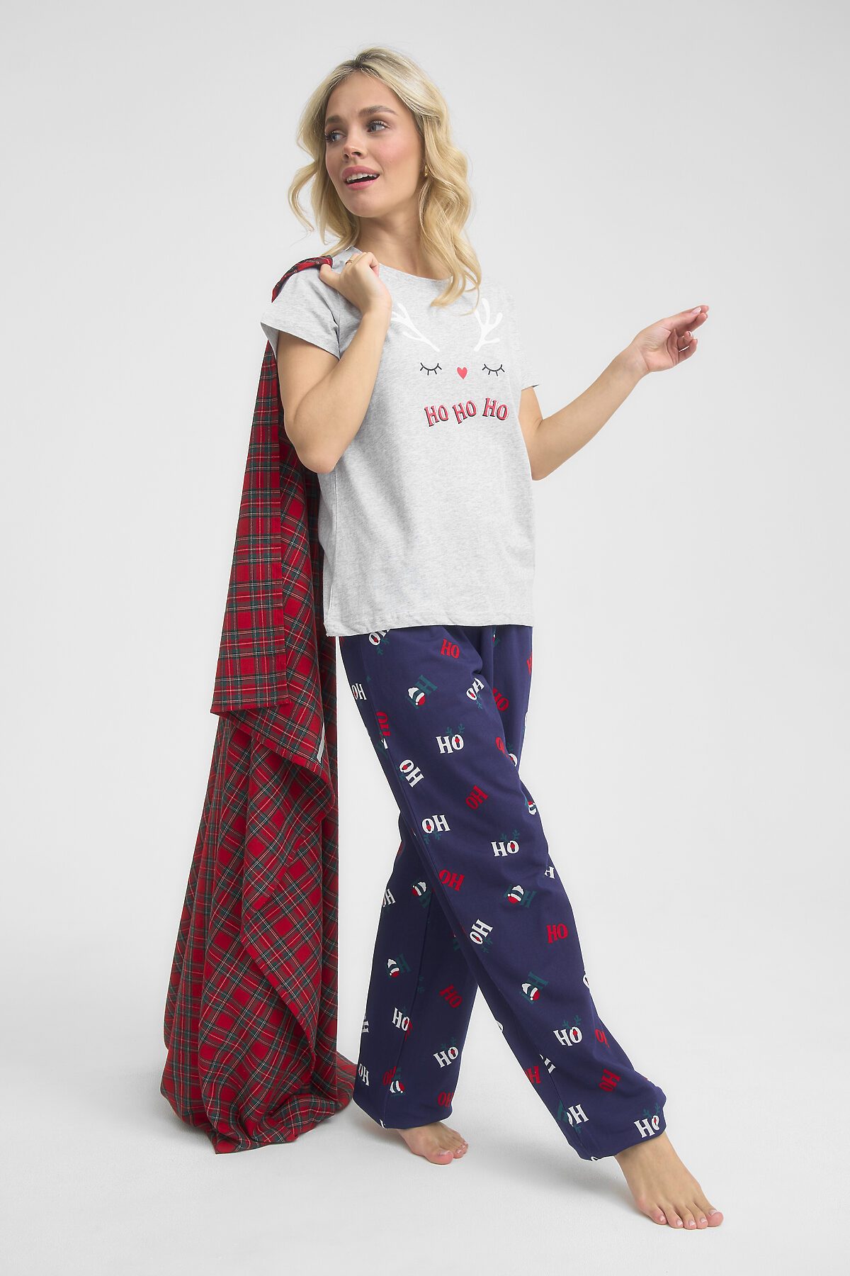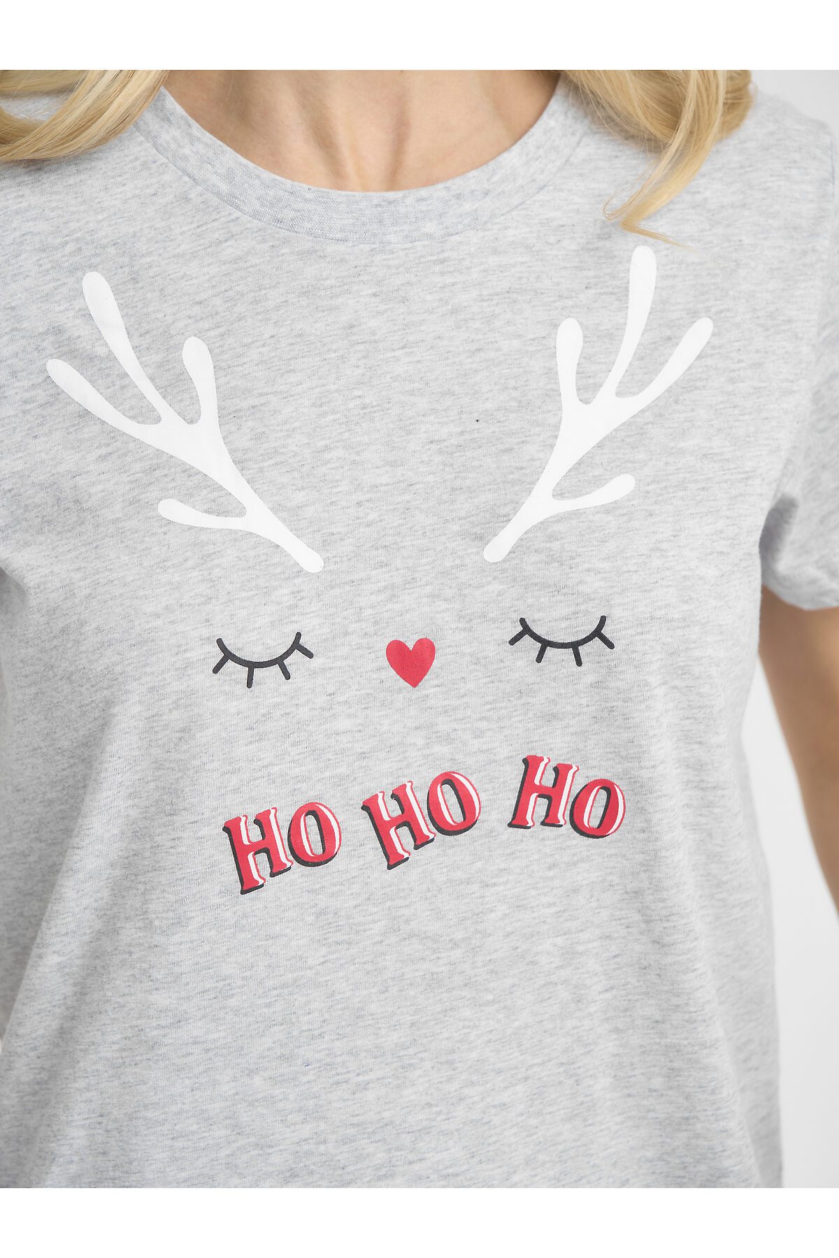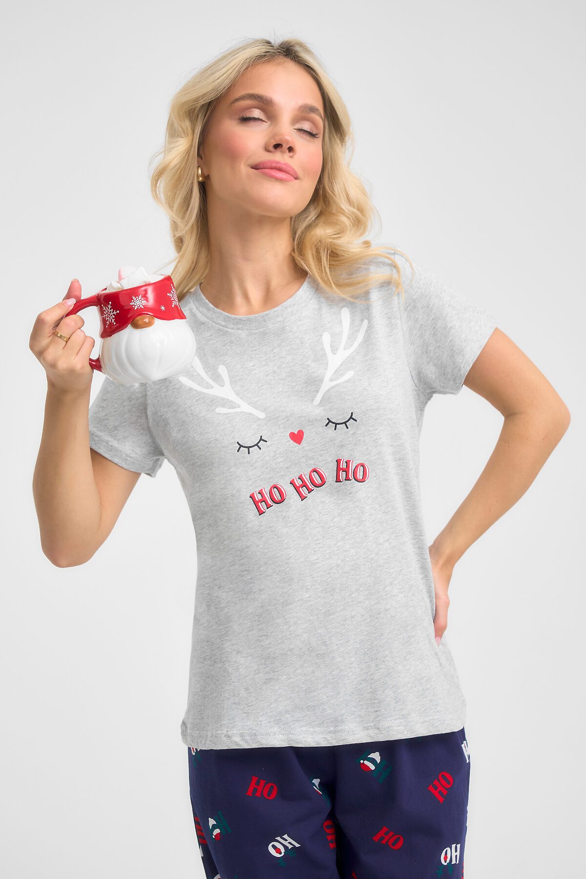 Трикотажная пижама с Новогодней тематикой. Серая футболка свободного кроя длиной до бердра украшена принтом рожки, глазки и носик оленя и надписью "Ho Ho Ho" . Брюки на резинке, свободного кроя, темно-синего цвета в белые и красные принтованые слоги "HO" .