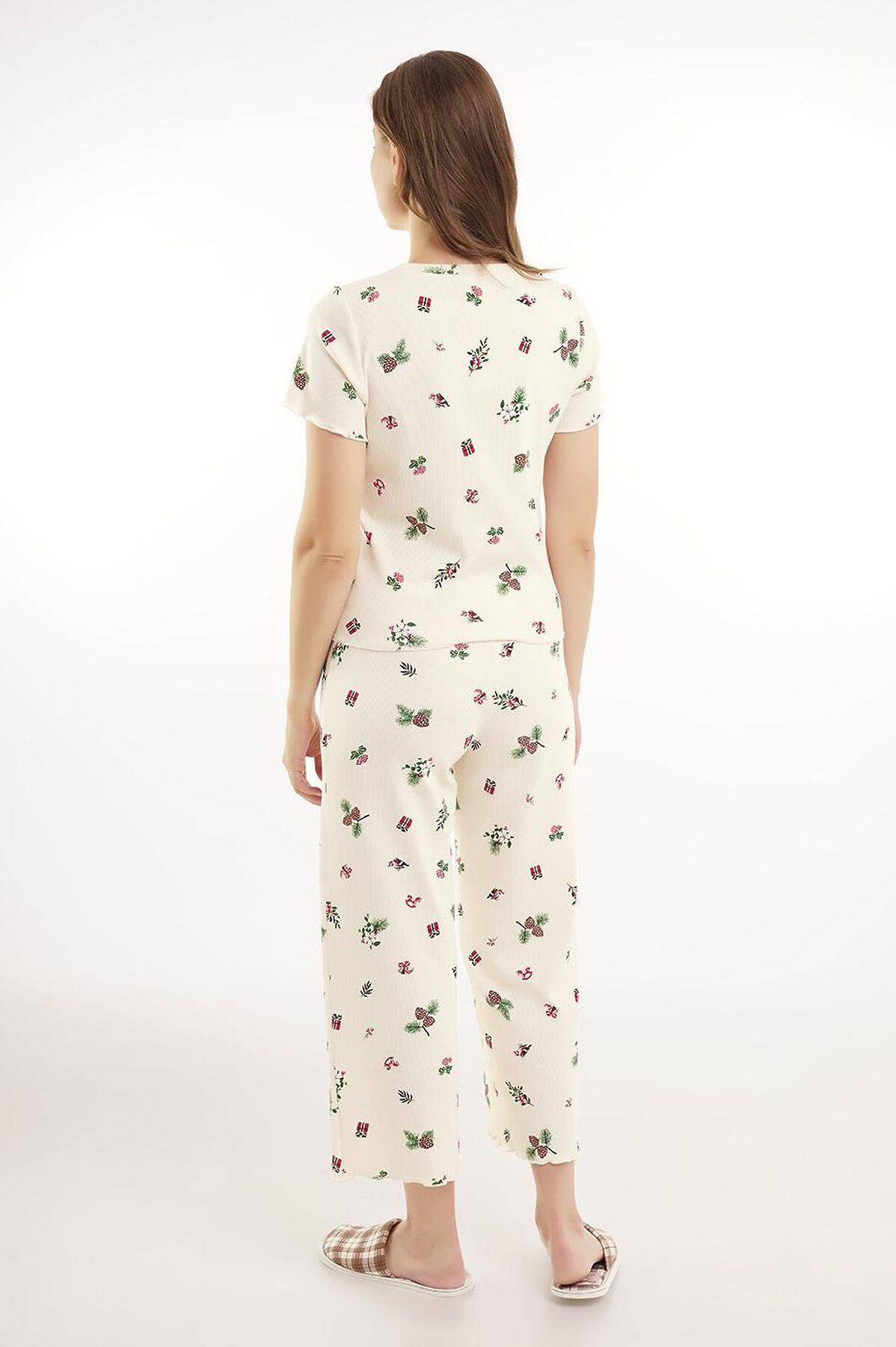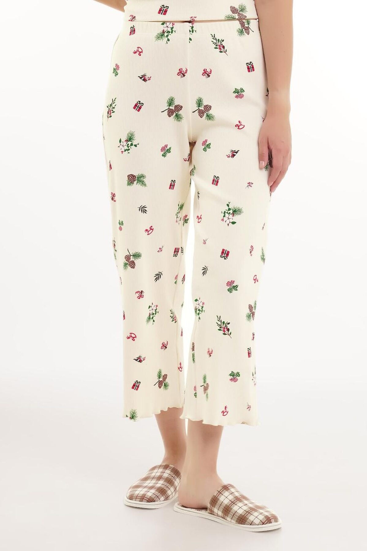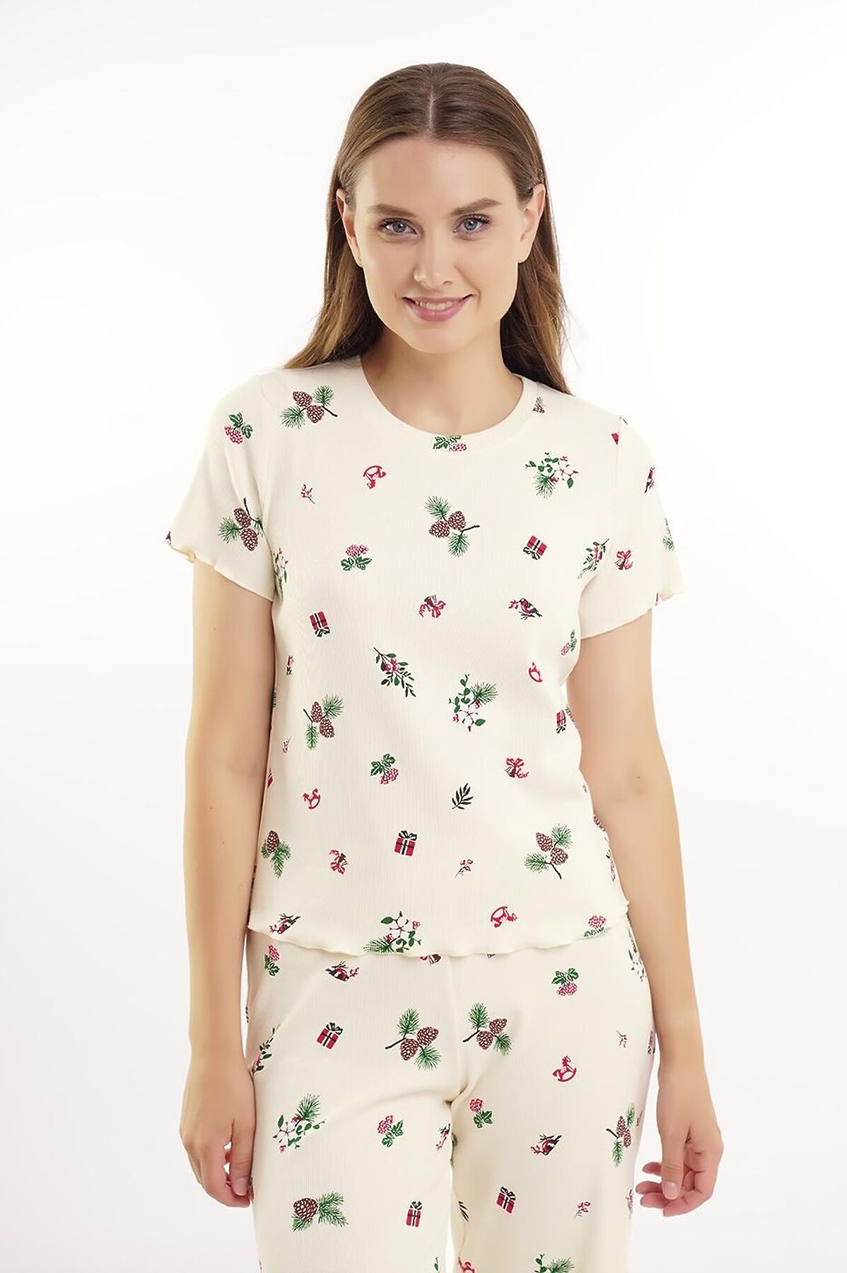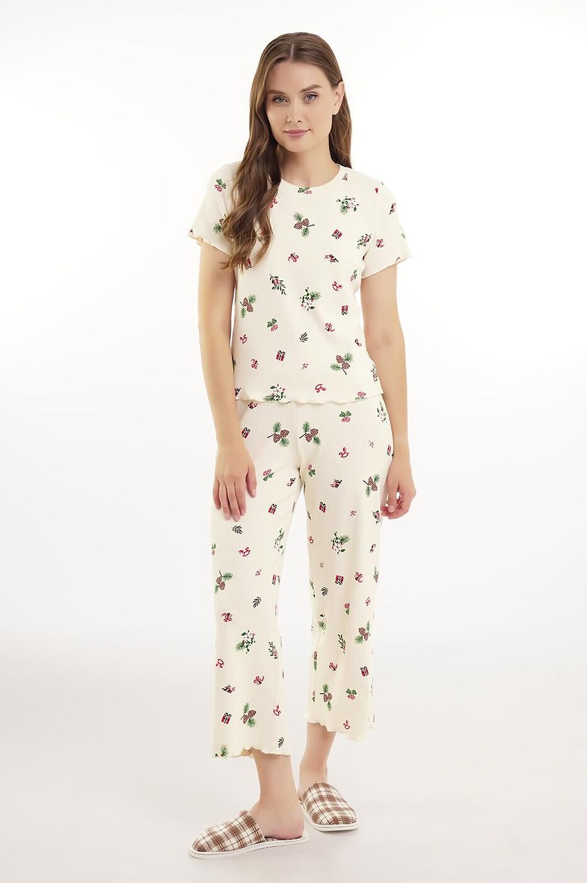 Пижама из трикотажного полотна кашкорсе с эластаном. Футболка прямого кроя, короткий втачной рукав, округлая горловина с обтачкой. Брюки прямые, пояс на внутренней резинке, нашивка бант. По низу футболки, рукавов и брюк мелкий оверлок.