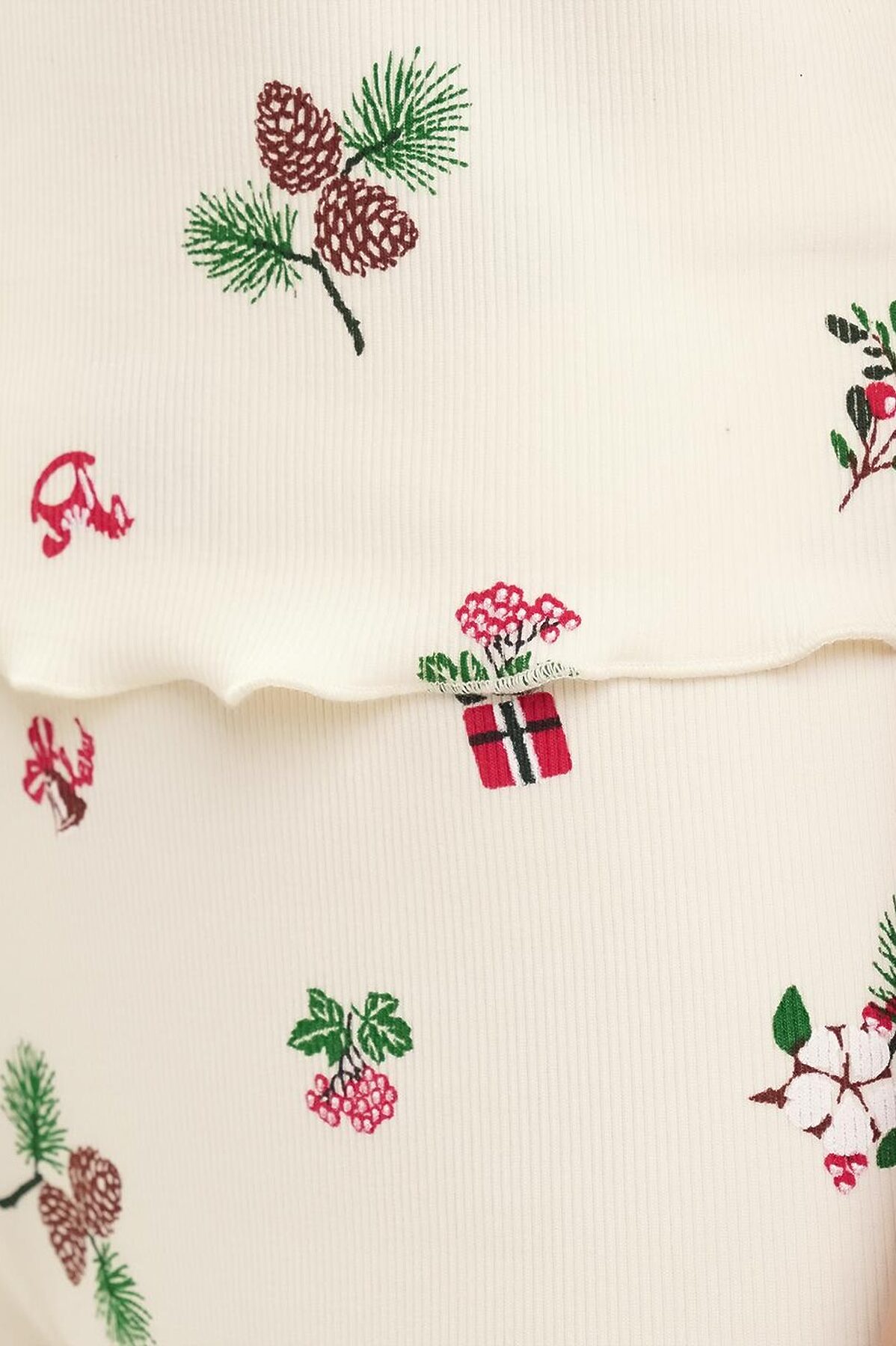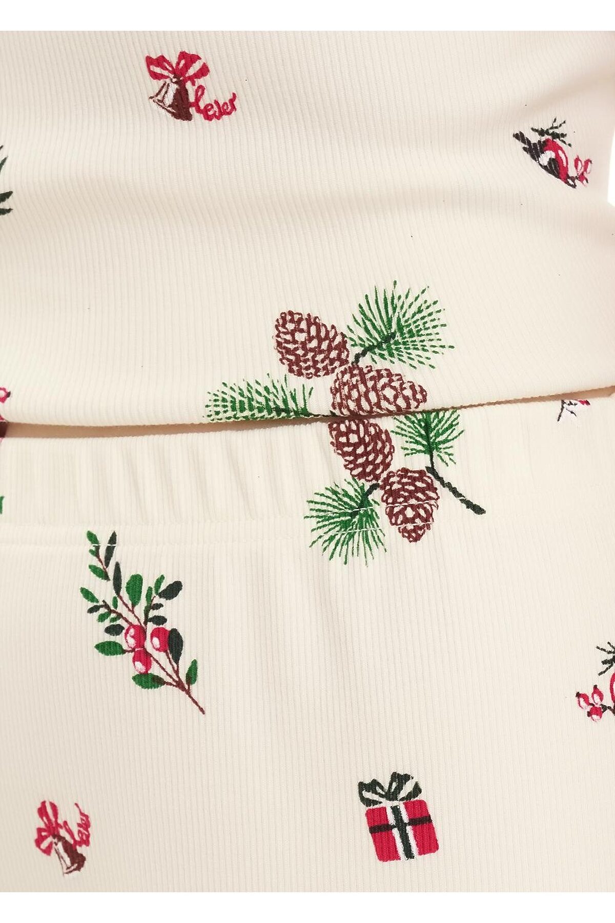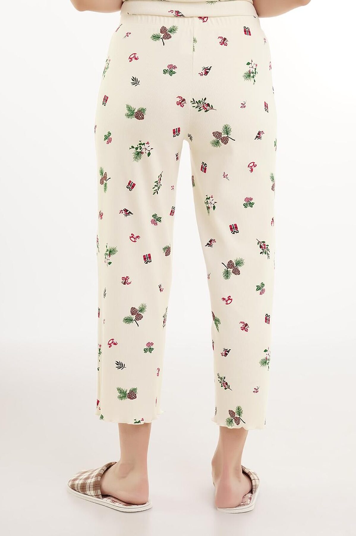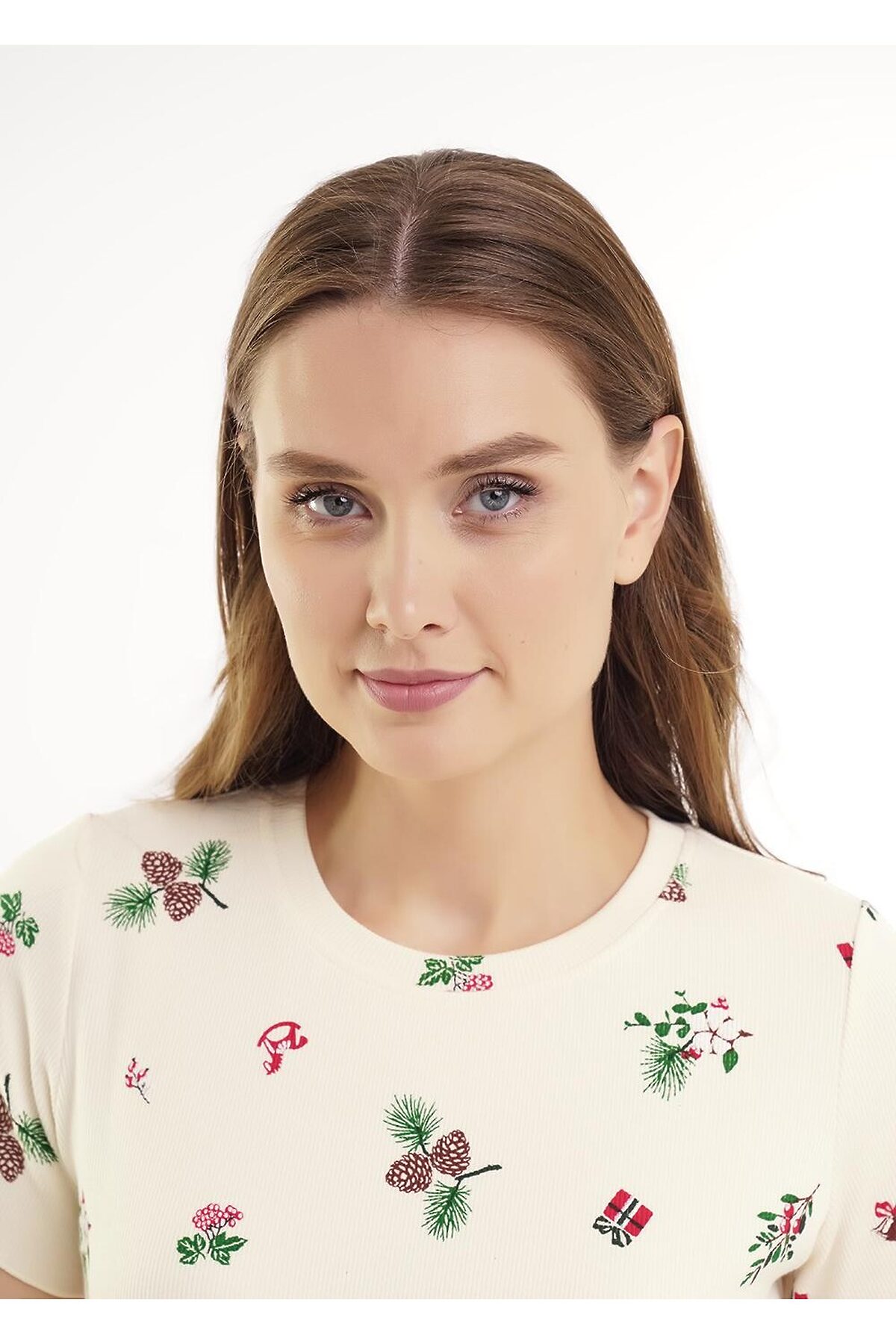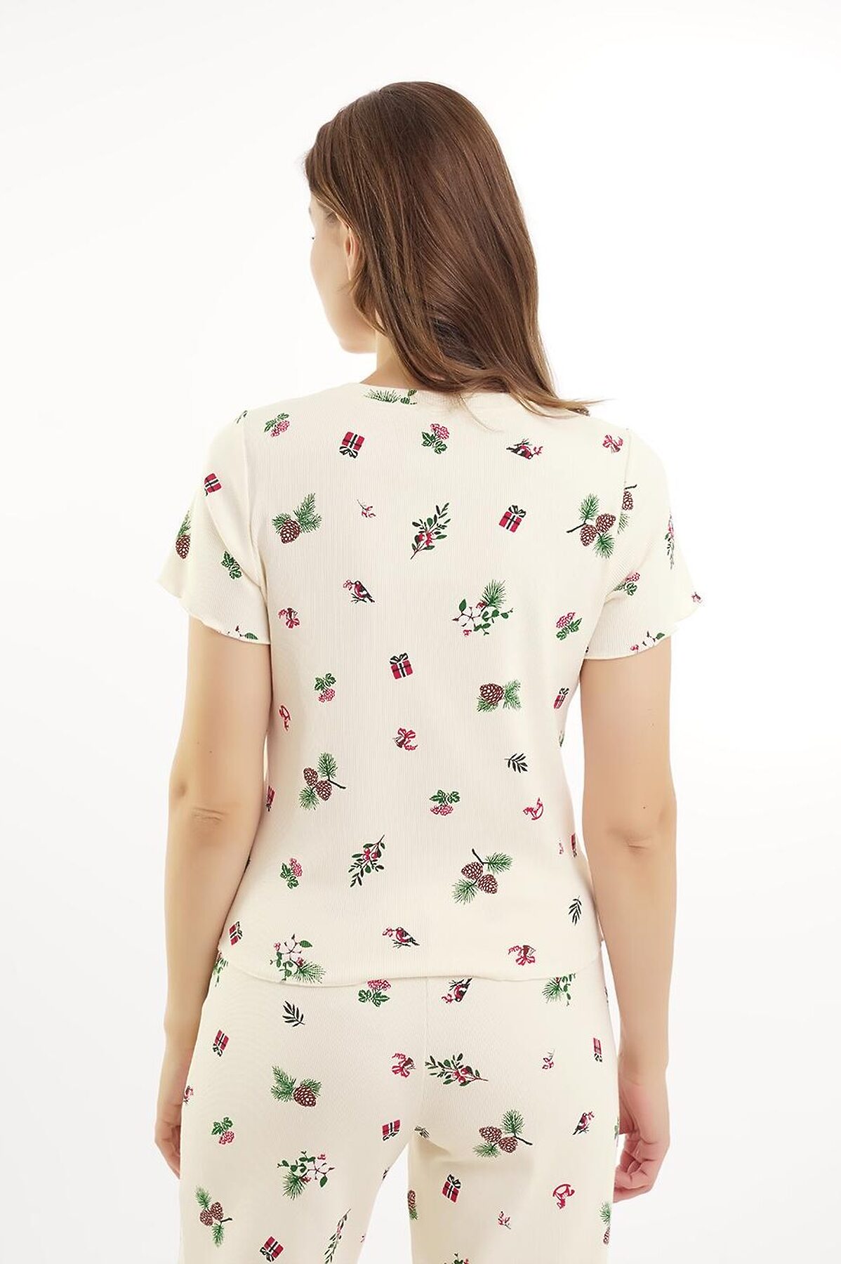 Пижама из трикотажного полотна кашкорсе с эластаном. Футболка прямого кроя, короткий втачной рукав, округлая горловина с обтачкой. Брюки прямые, пояс на внутренней резинке, нашивка бант. По низу футболки, рукавов и брюк мелкий оверлок.