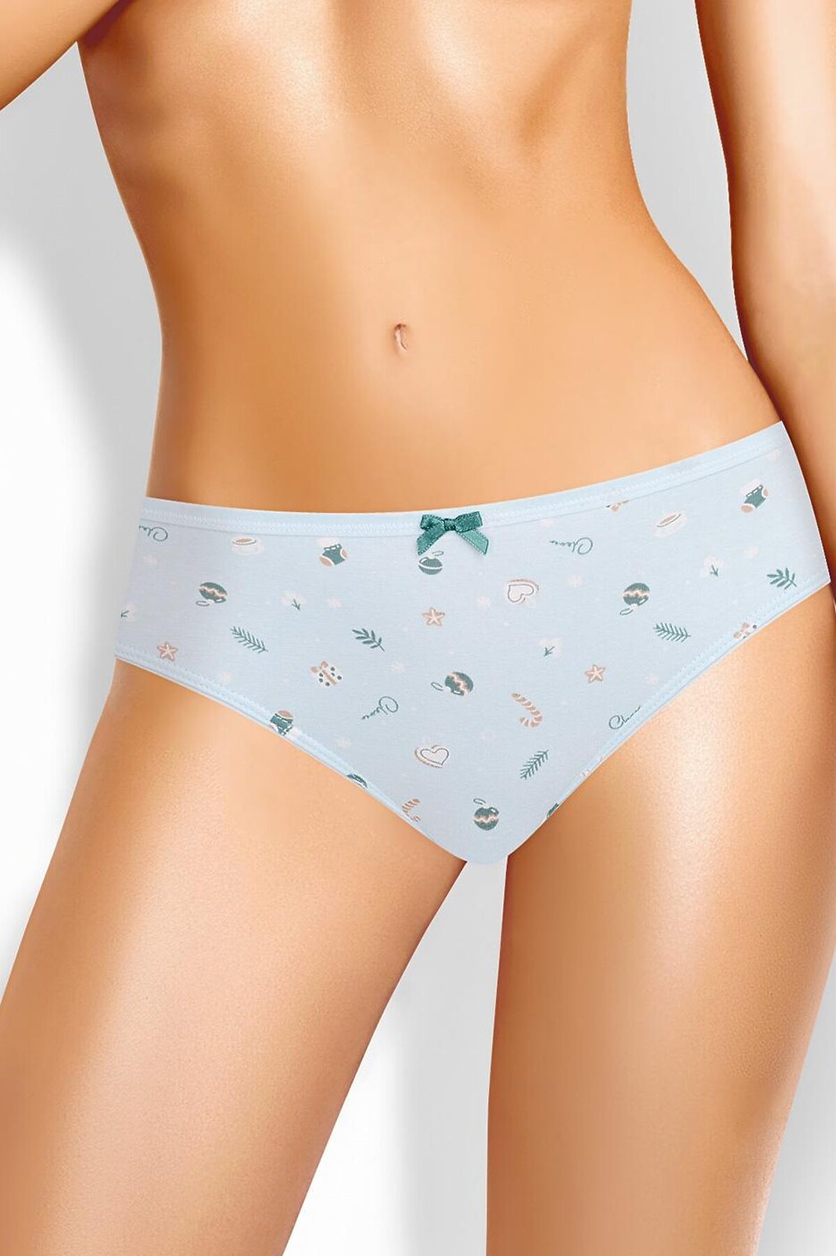 Трусы бикини женские из эластичного хлопкового полотна. Обработка краев по талии - окантовочная резинка, по ноге - полуокантовка. По переду атласный бант