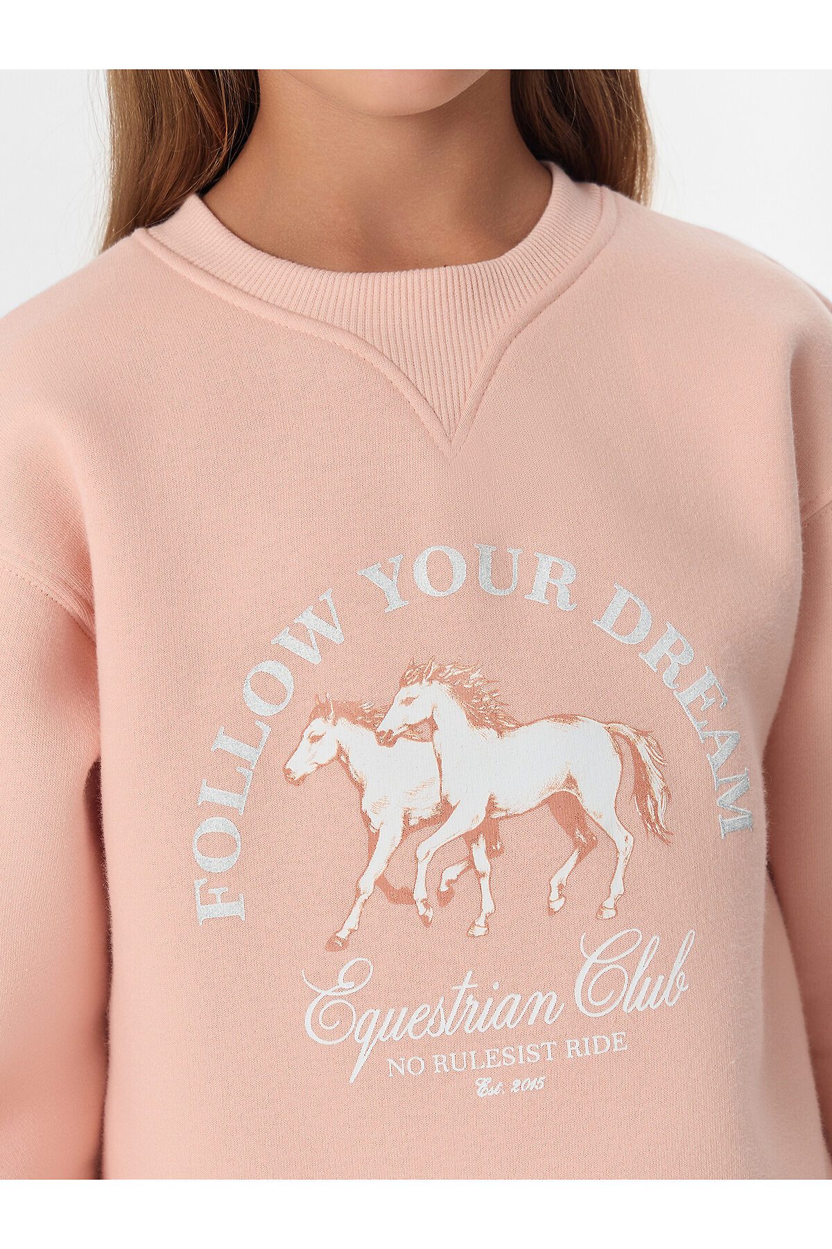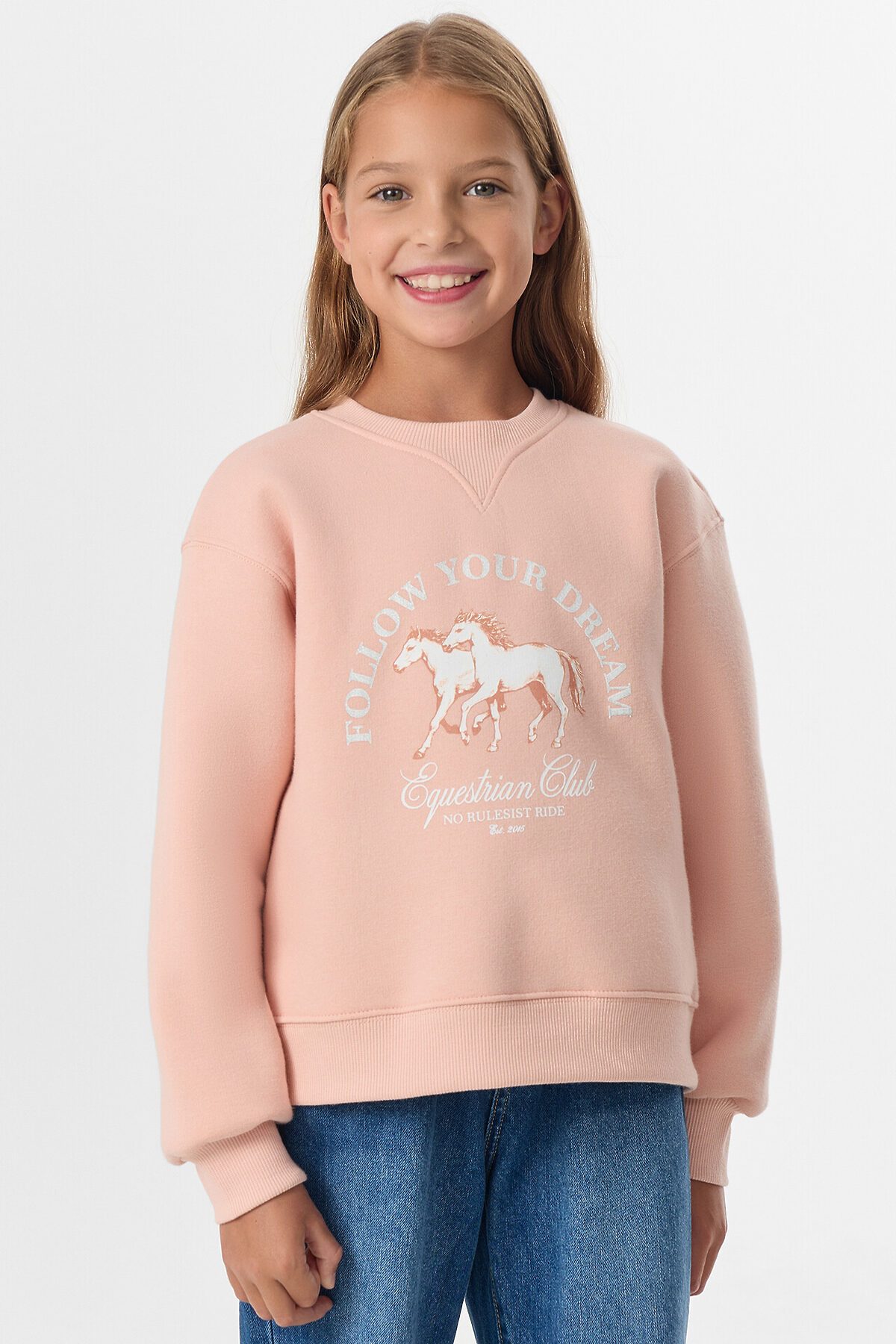 Свитшот свободного силуэта. Рукава длинные, втачные. Линия плеча спущена. Плечевой шов смещен вперед. Горловина круглой формы c окантовкой из рибаны. Низ рукавов и низ изделия обработаны рибаной.