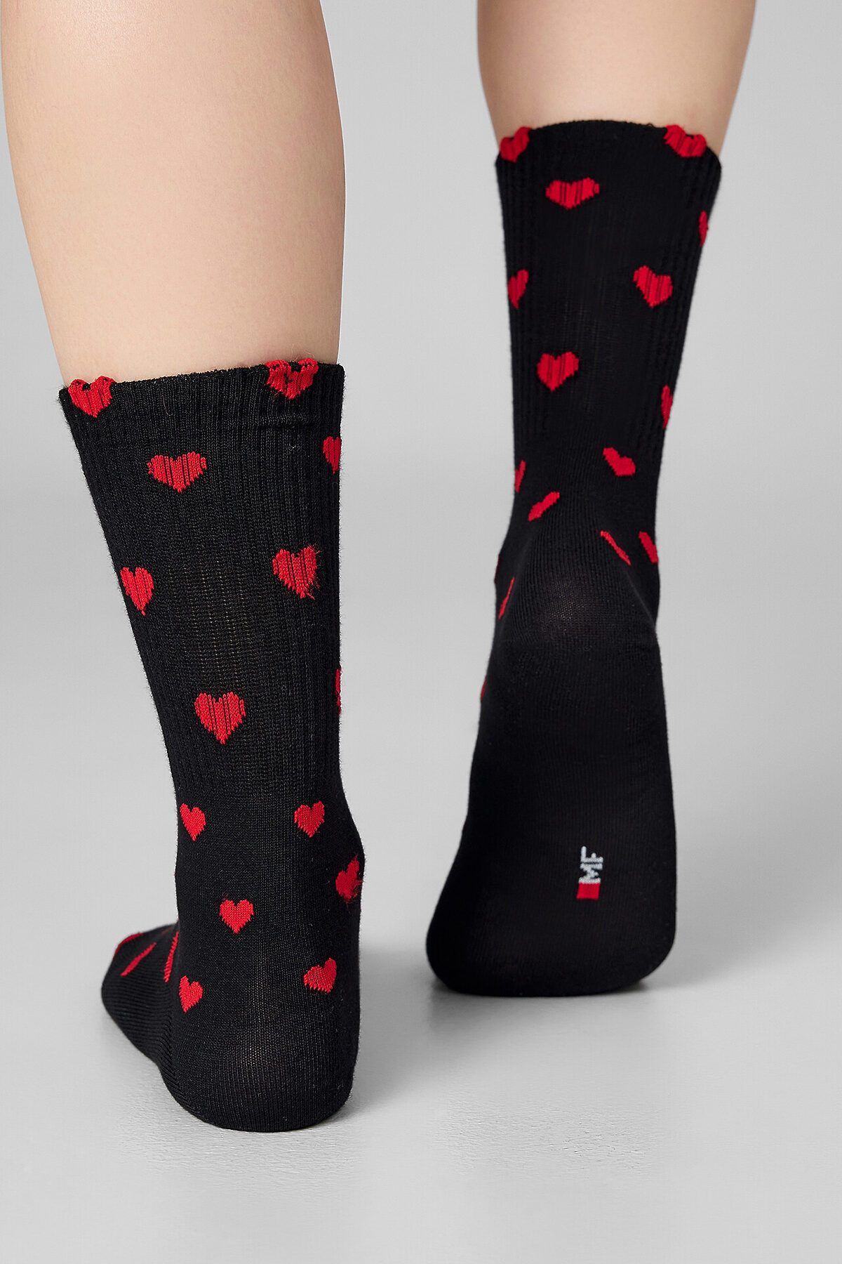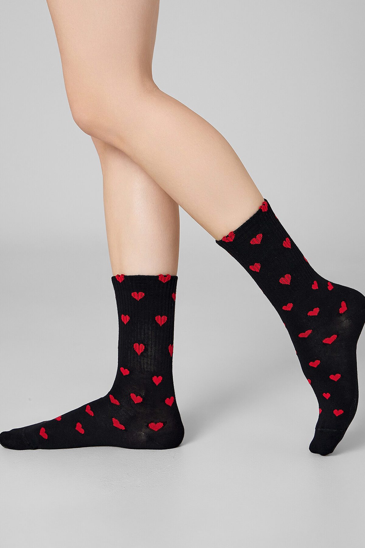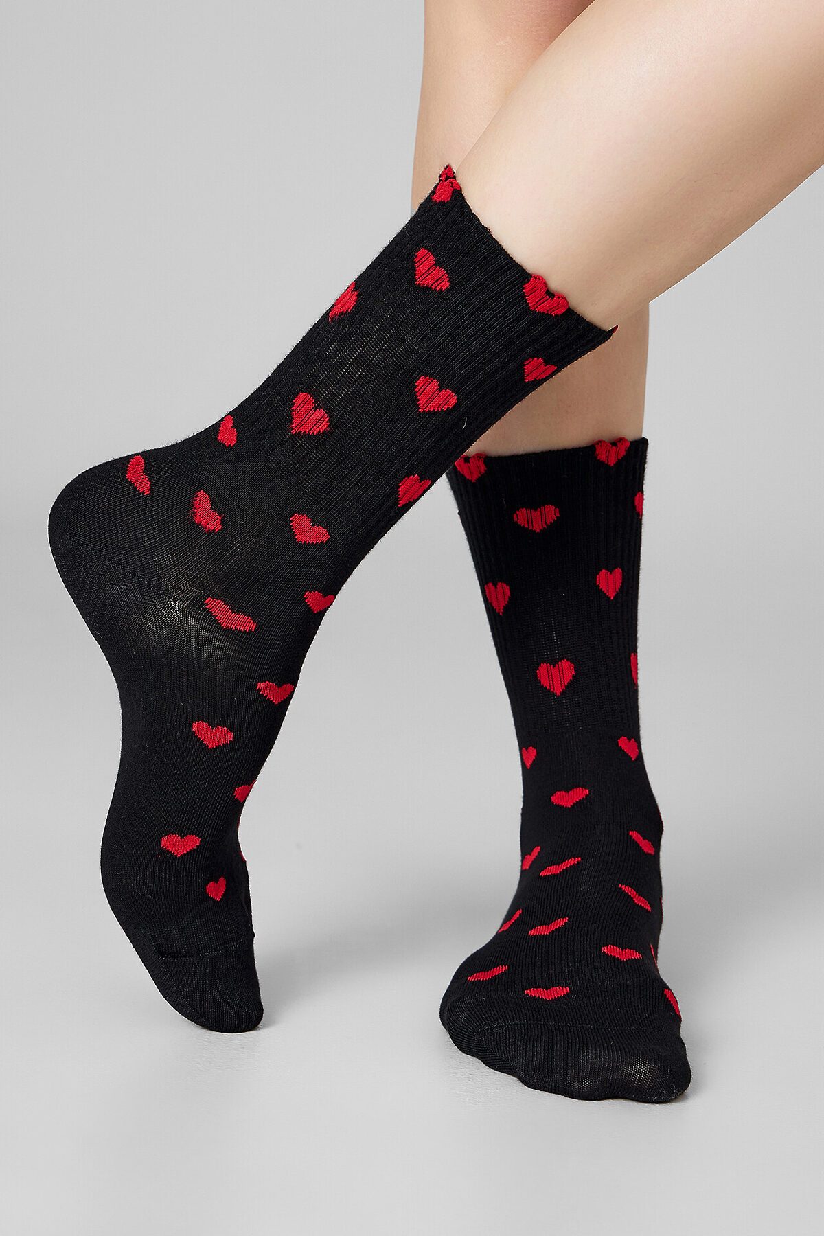Женские носки с сердечками — это нежный аксессуар, который превратит обычный день в романтический момент. Носки украшены очаровательным принтом в виде сердечек, нанесенным по всей поверхности, что добавляет образу игривости и трогательности. Высокий плотный борт мягко облегает щиколотку, не сползая и не оставляя следов.