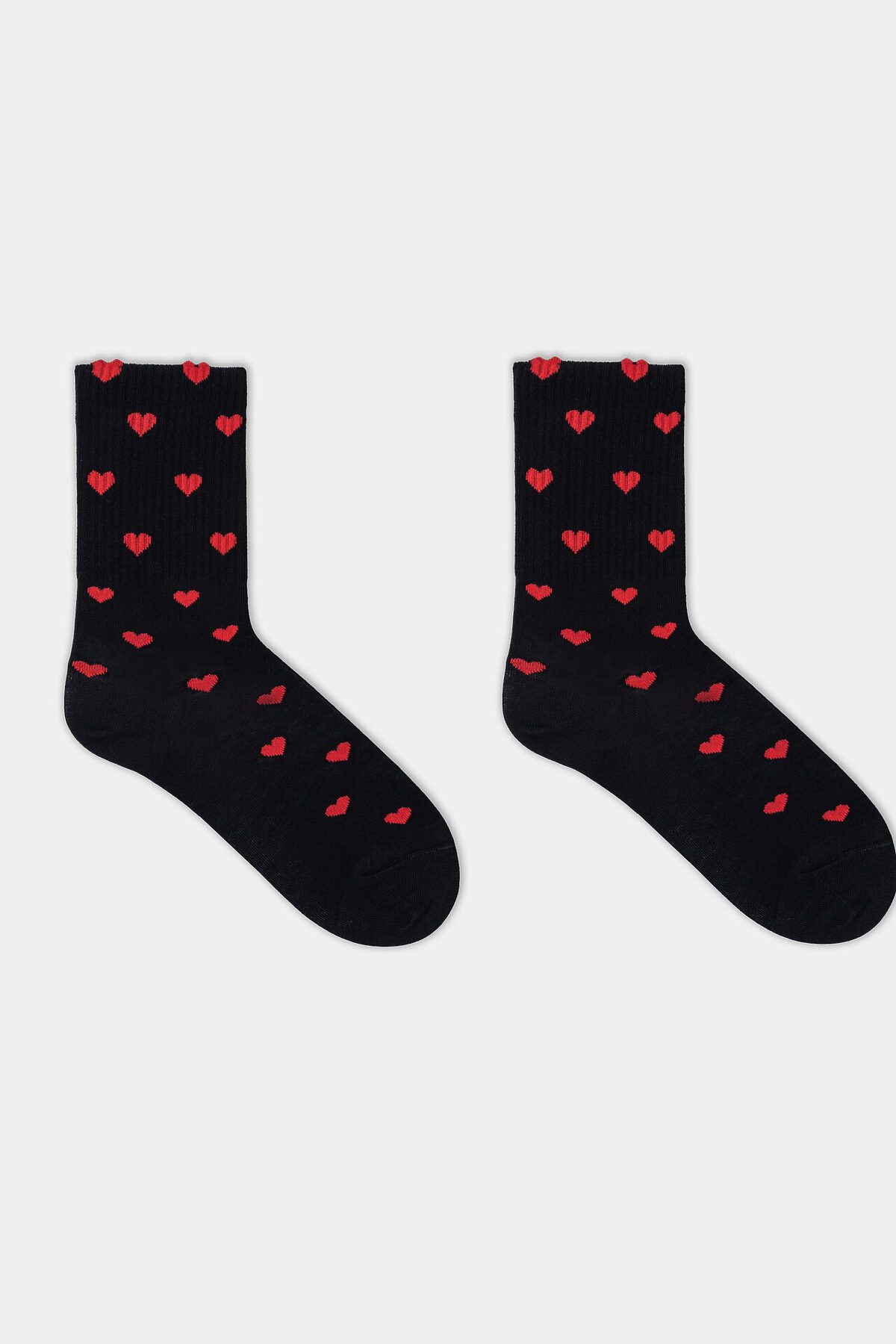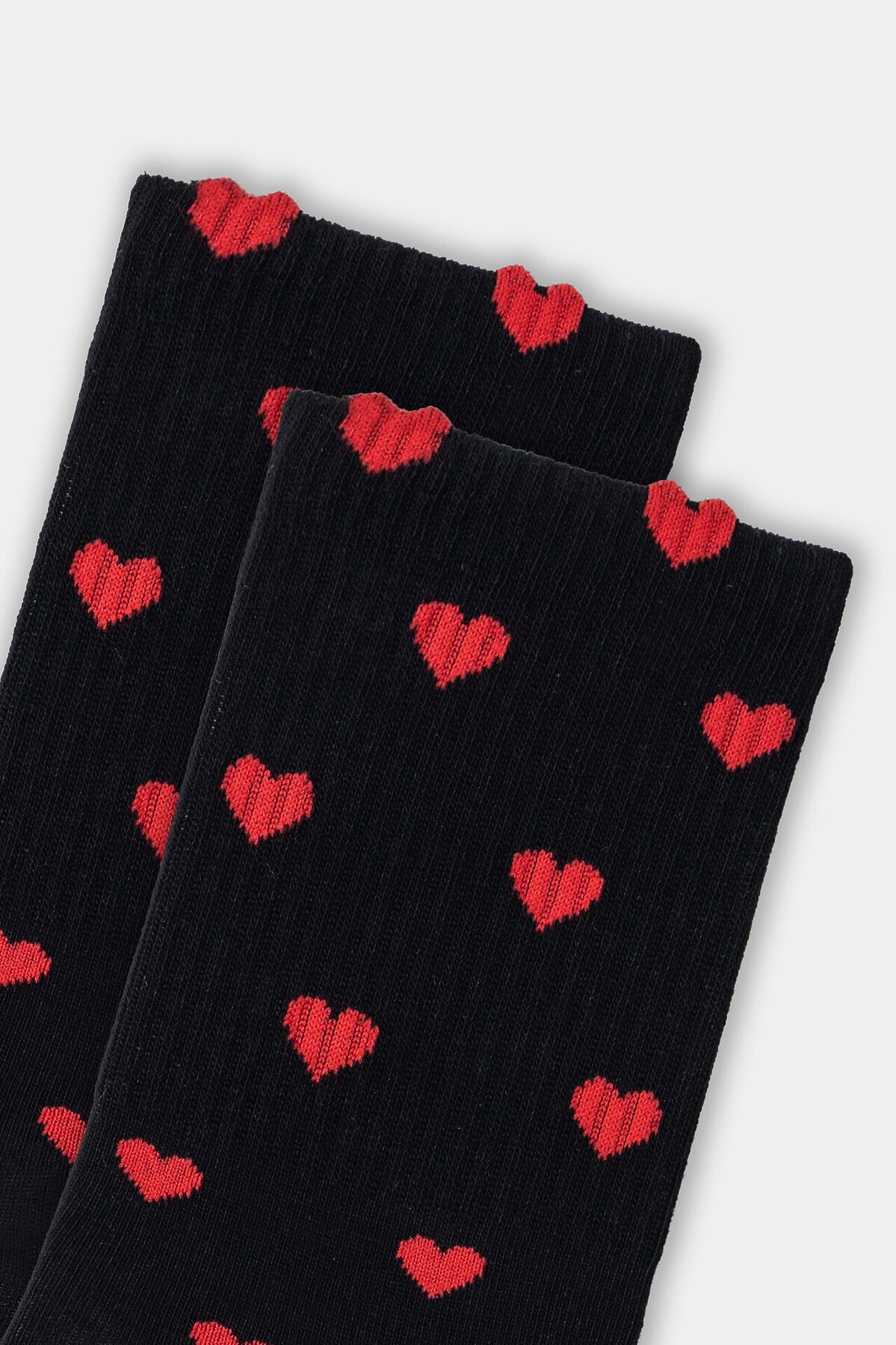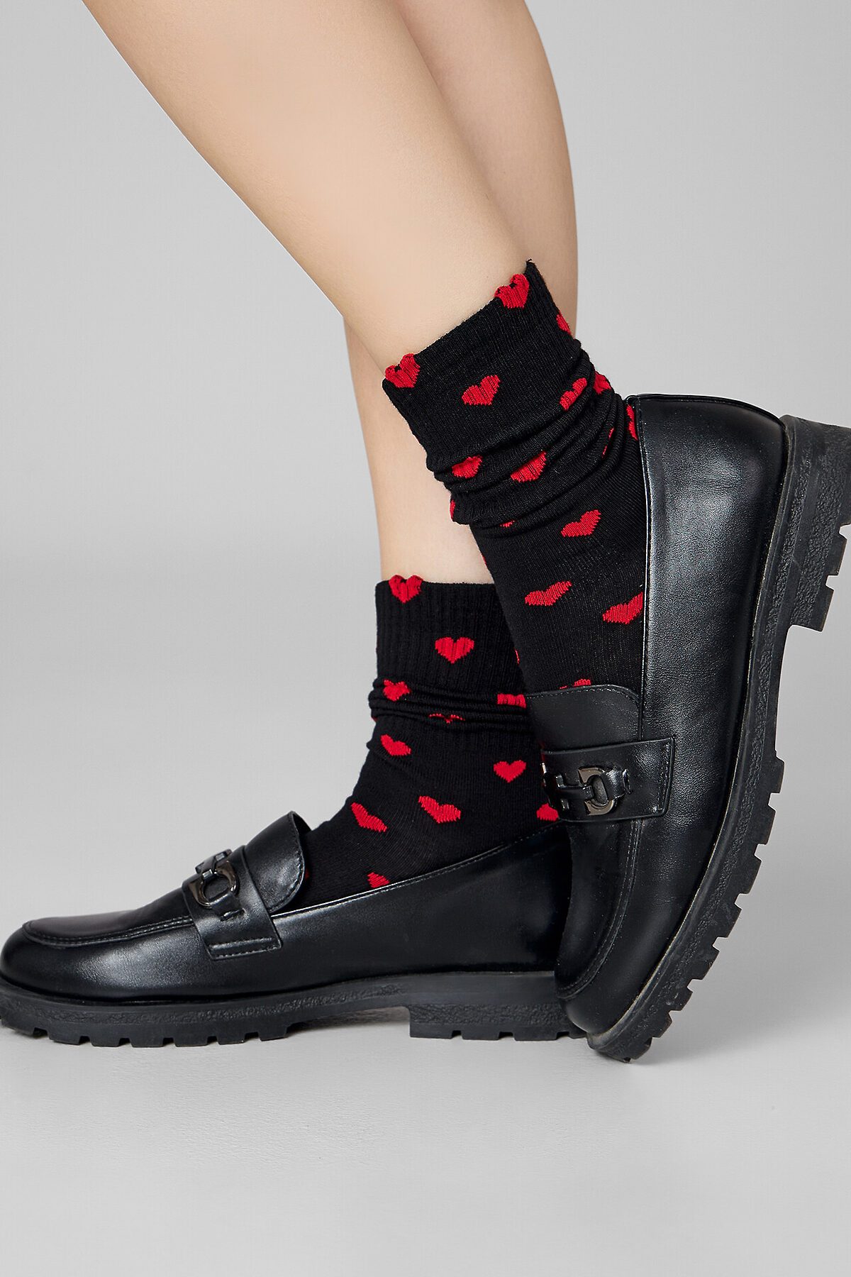 Женские носки с сердечками — это нежный аксессуар, который превратит обычный день в романтический момент. Носки украшены очаровательным принтом в виде сердечек, нанесенным по всей поверхности, что добавляет образу игривости и трогательности. Высокий плотный борт мягко облегает щиколотку, не сползая и не оставляя следов.