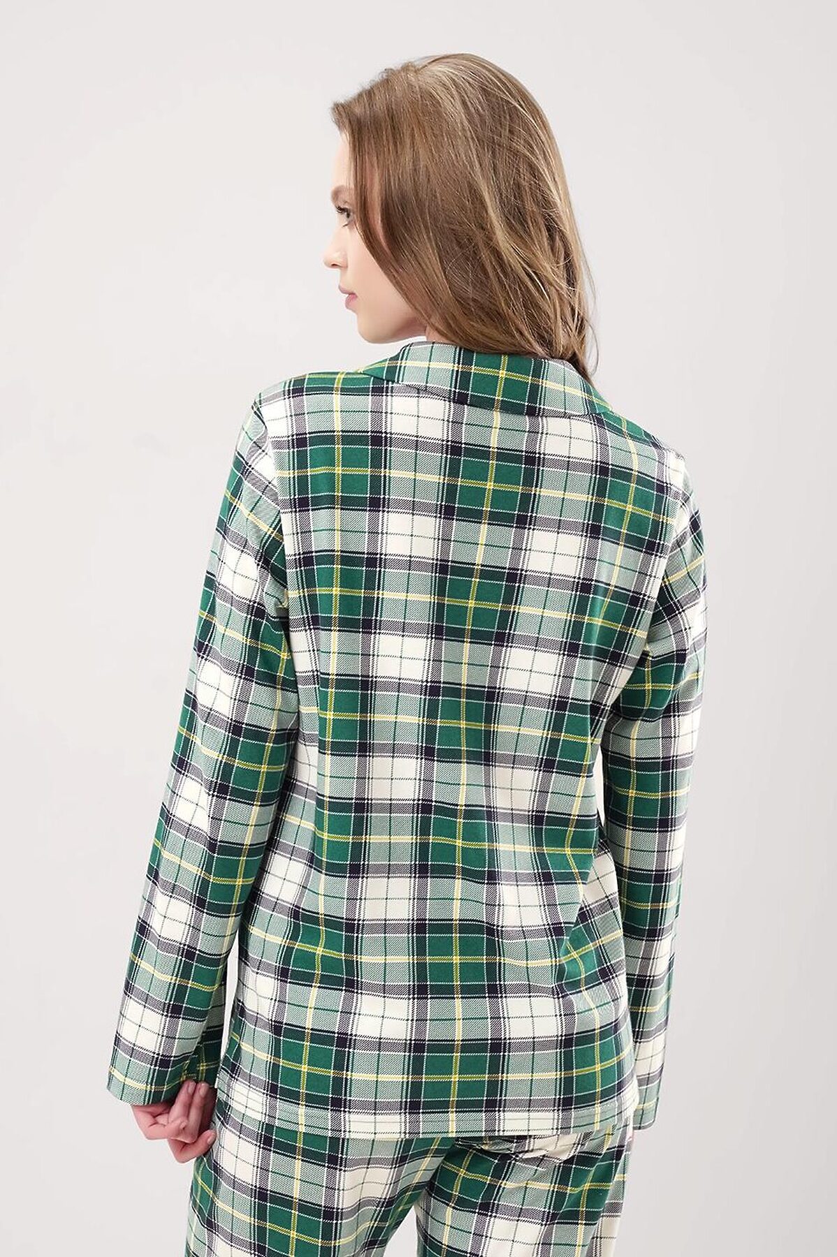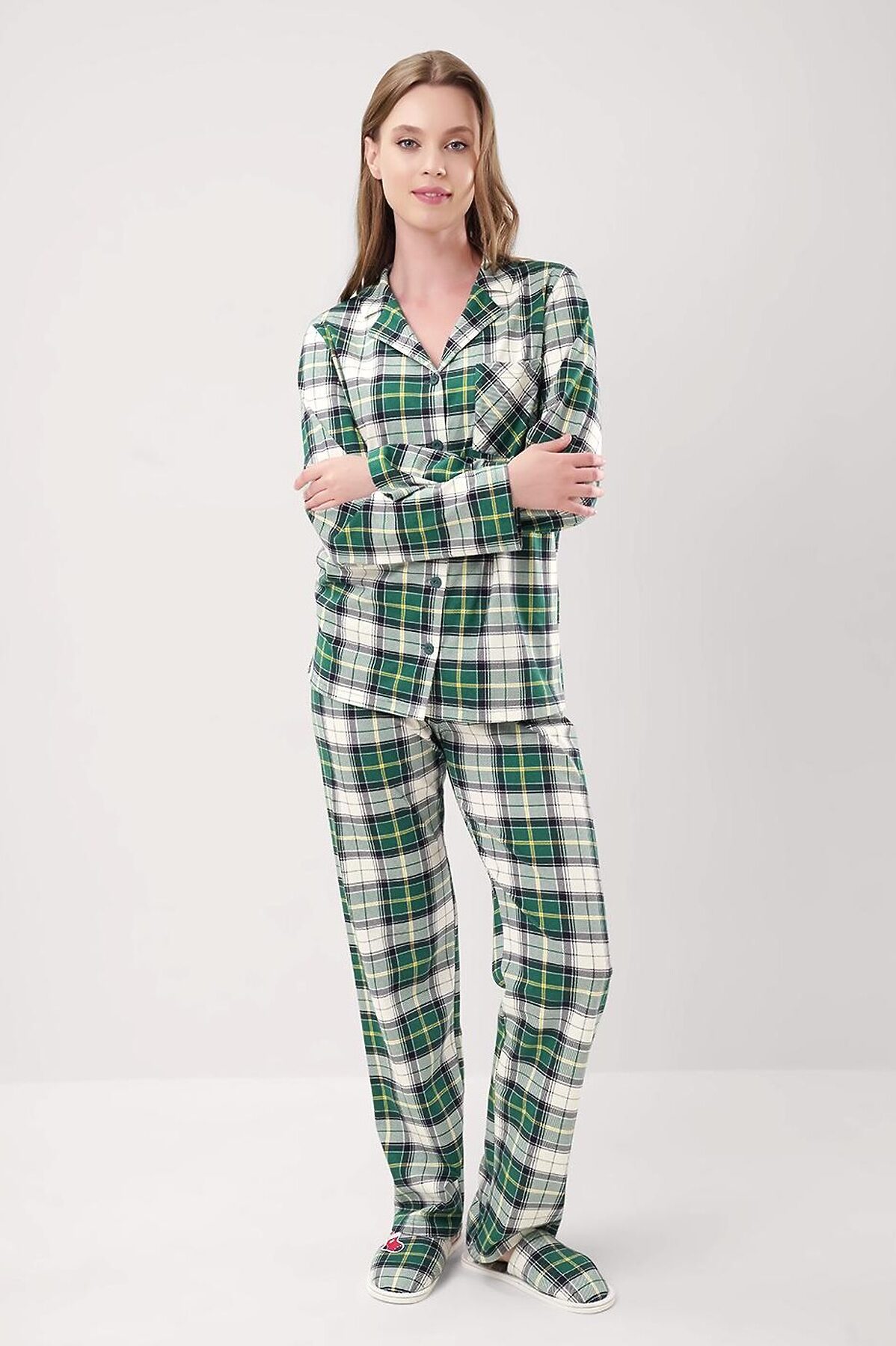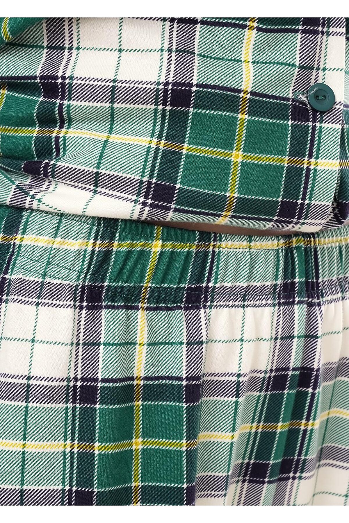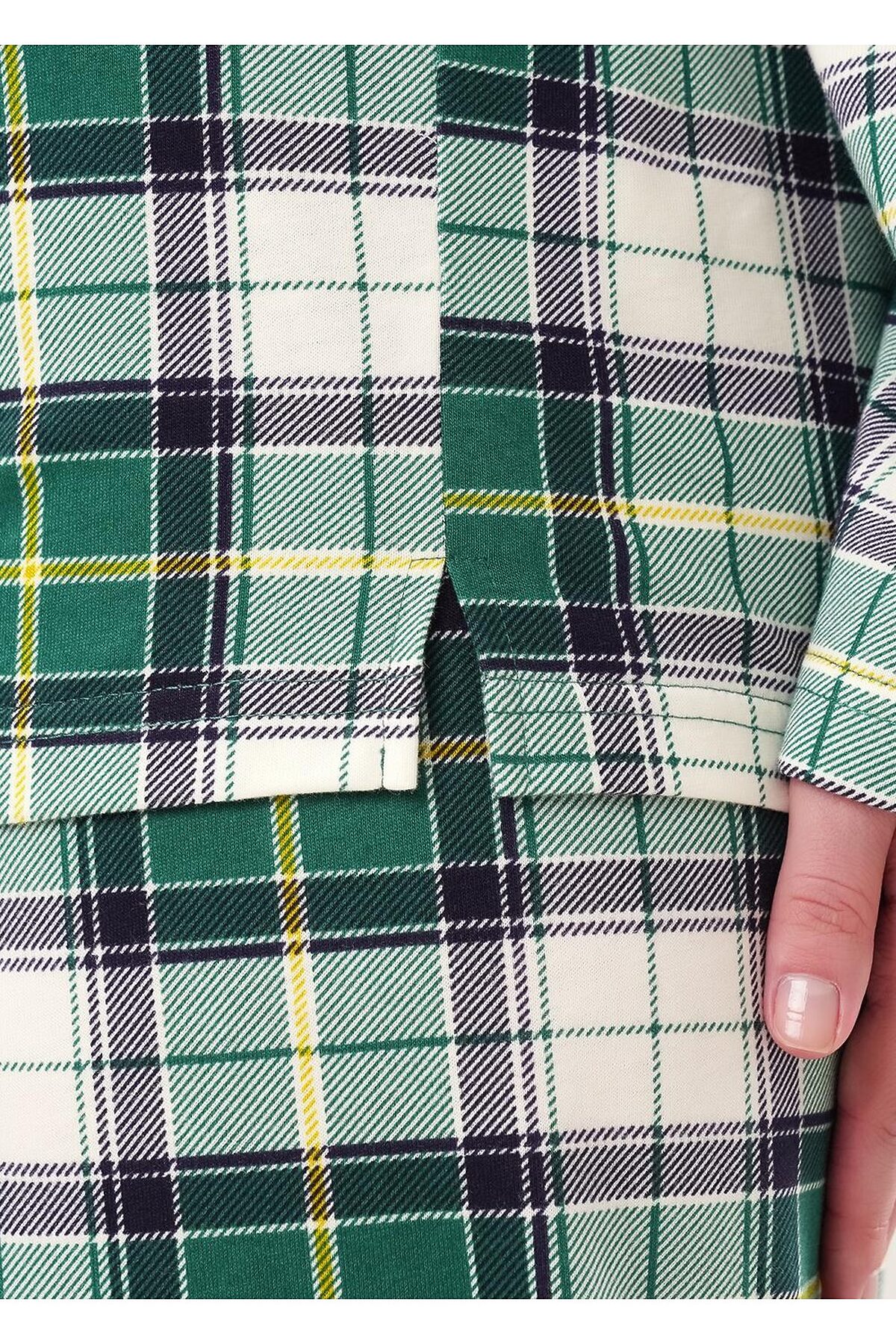 Пижама для дома из хлопкового трикотажного полотна с карбоном. Джемпер с длинным втачным рукавом. Застёжка на пуговицы, воротник с лацканами. По переду накладной карман, нашивка. Боковые разрезы. Брюки прямые, цельнокроенный пояс на внутренней резинке.