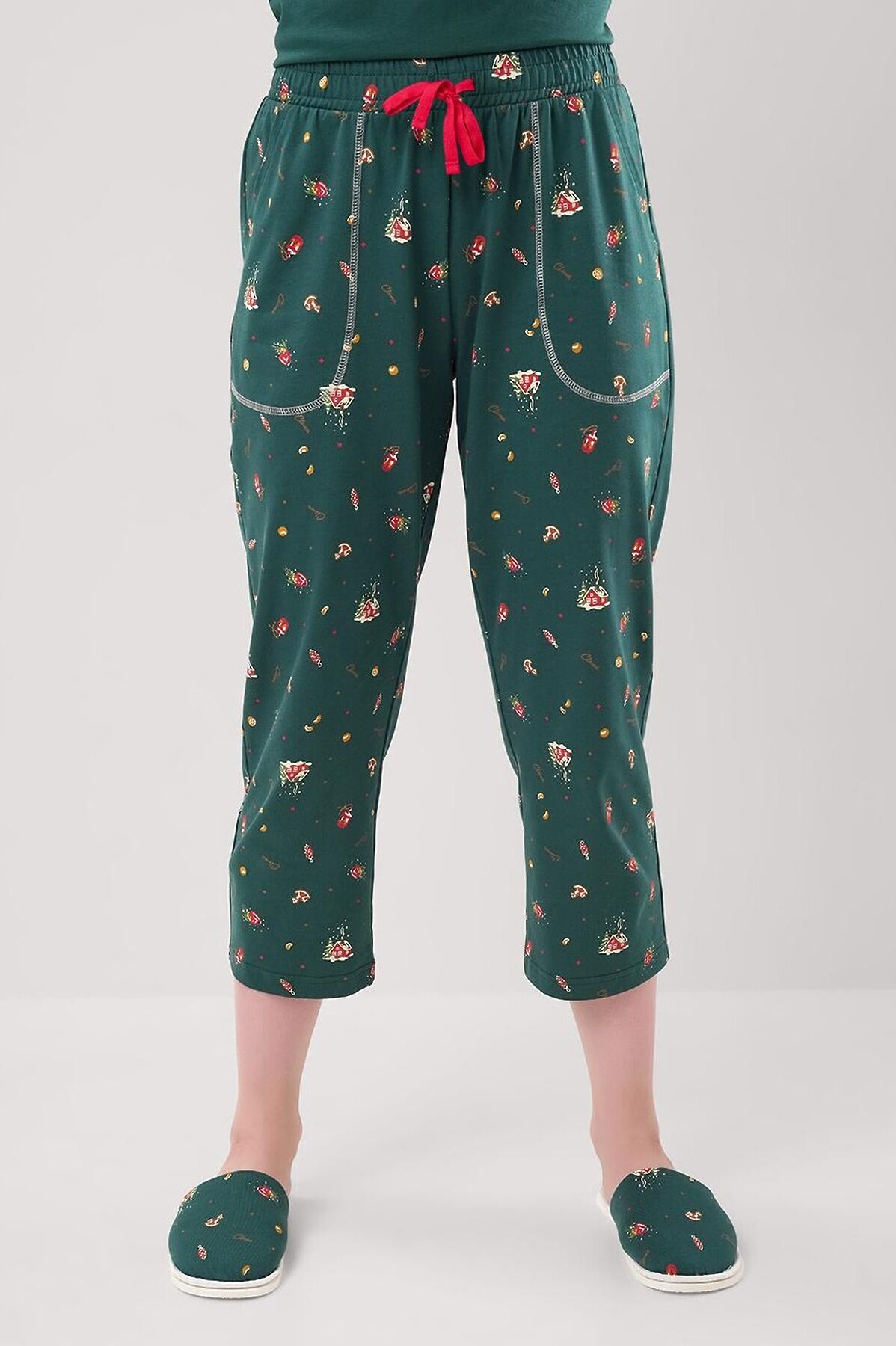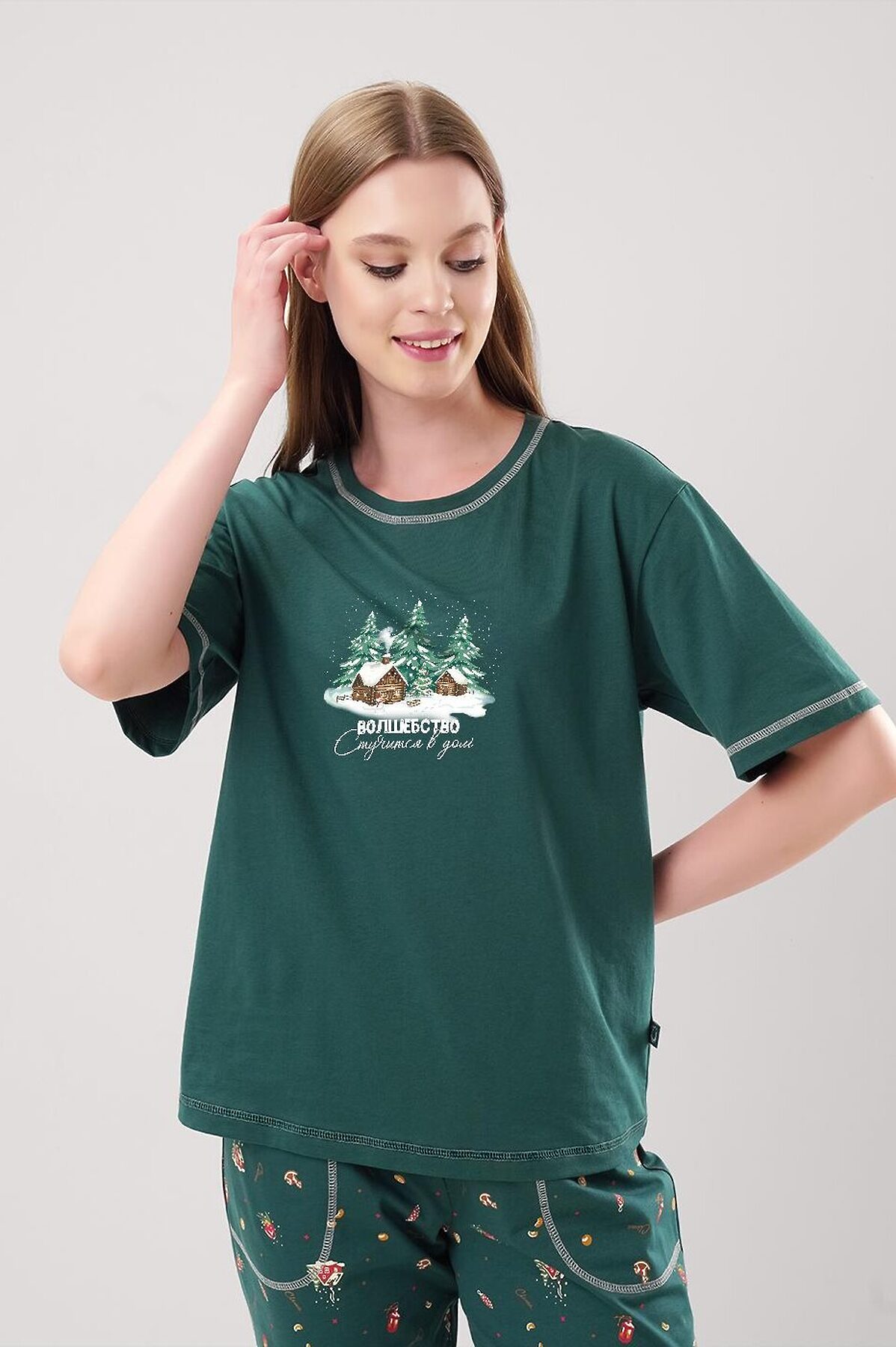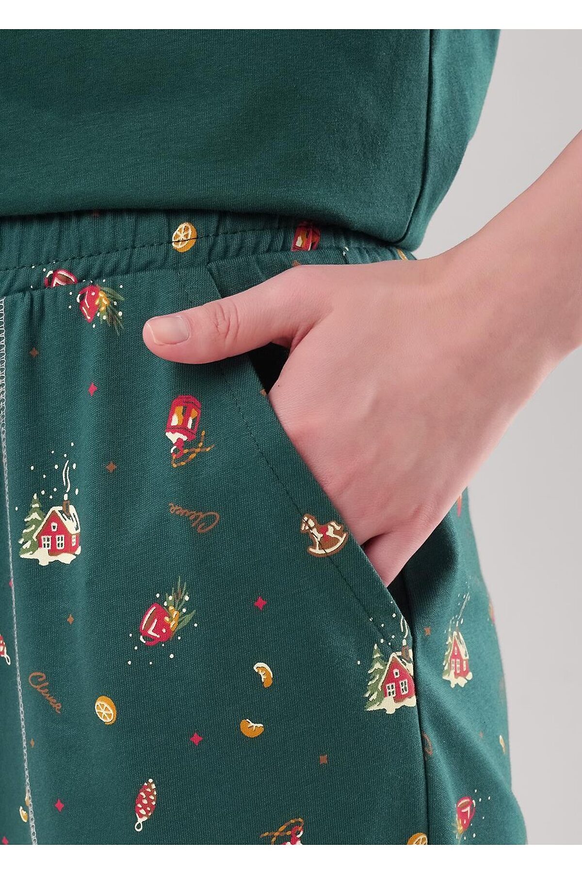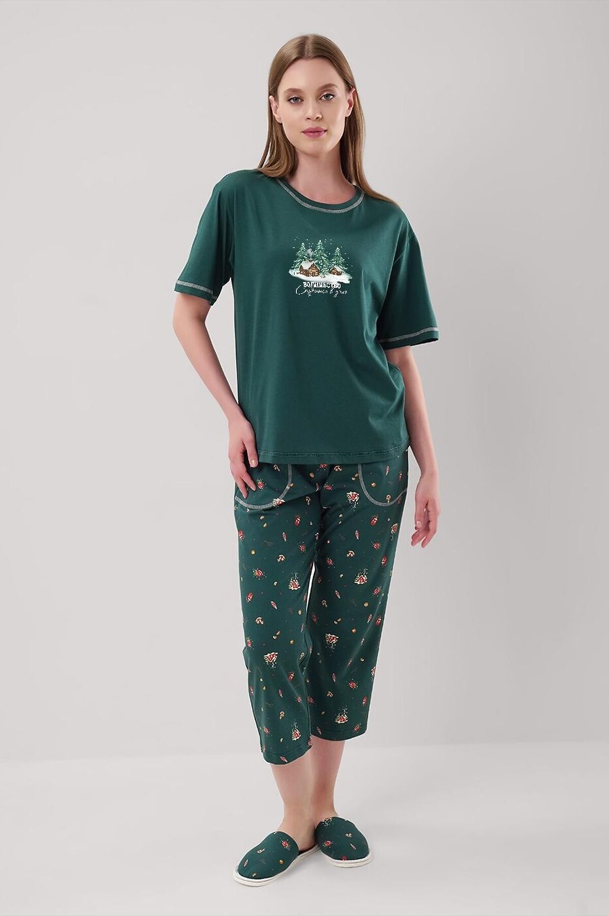 Пижама из трикотажного полотна. Футболка с коротким втачным рукавом, внизу застил. По горловине обтачка с застилом.Спереди принт, нашивка в боковом шве.Бриджи с поясом на внутренней резинке и киперной лентой. Боковые карманы с отрезным бочком,застил.