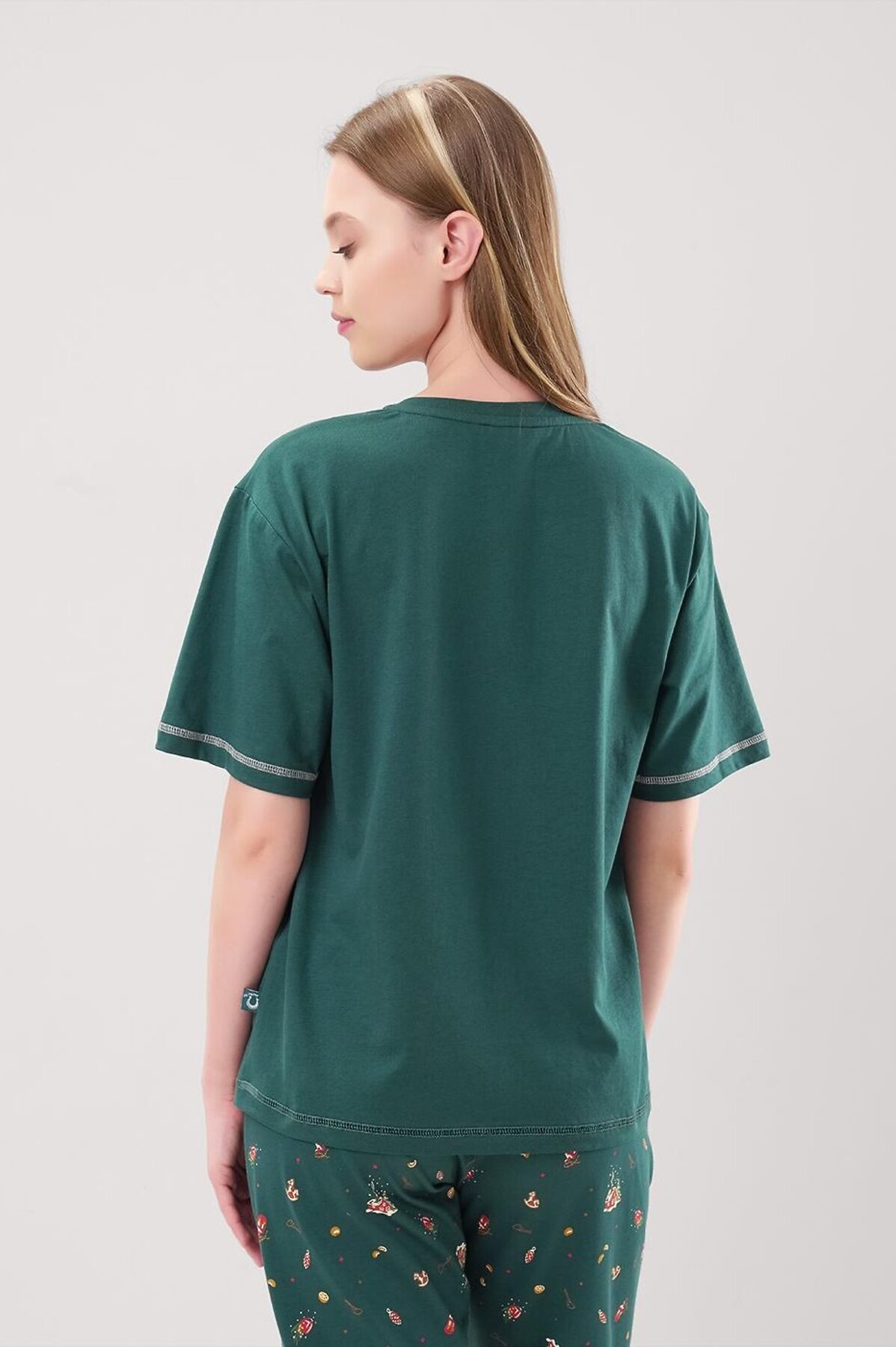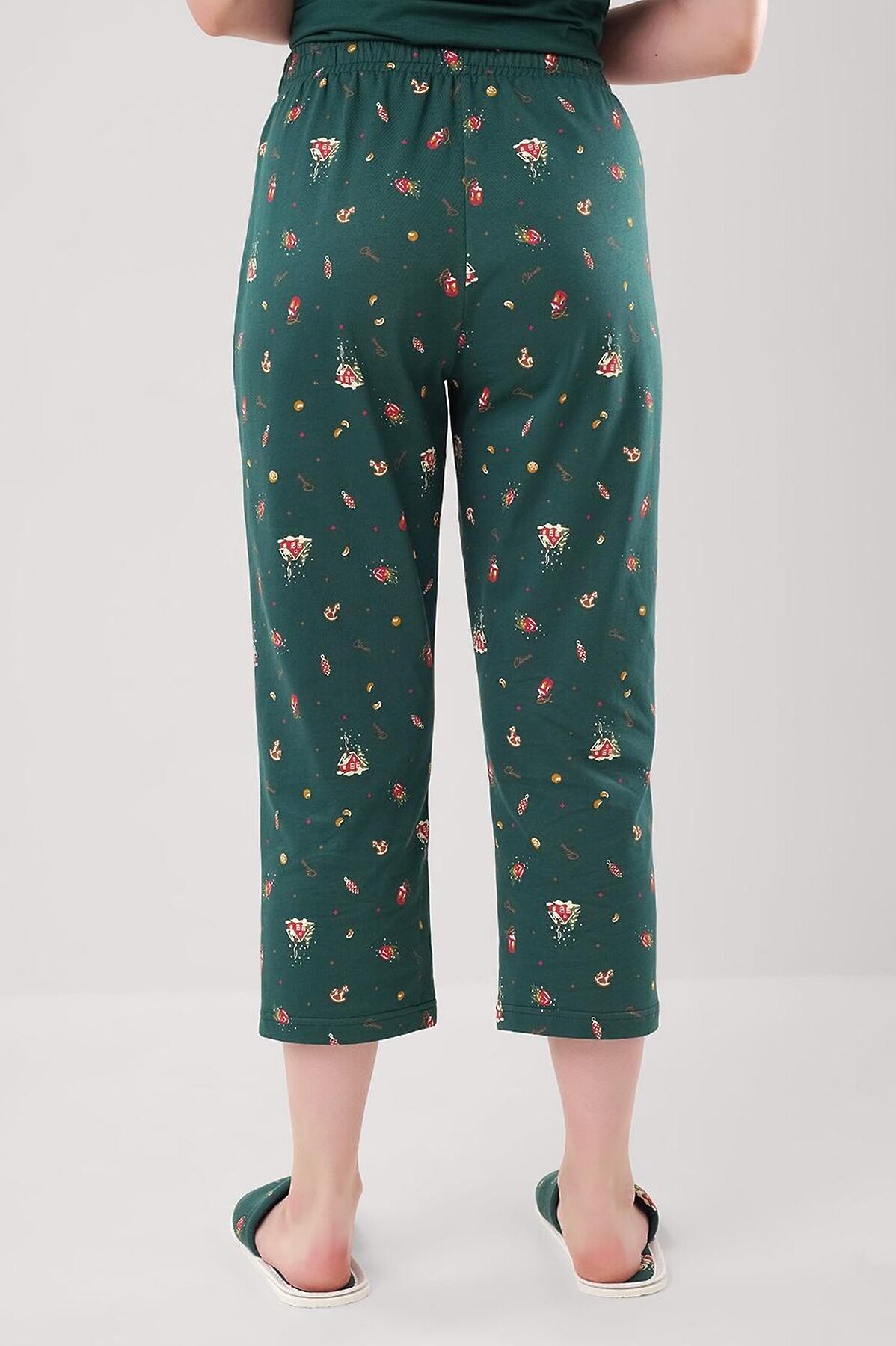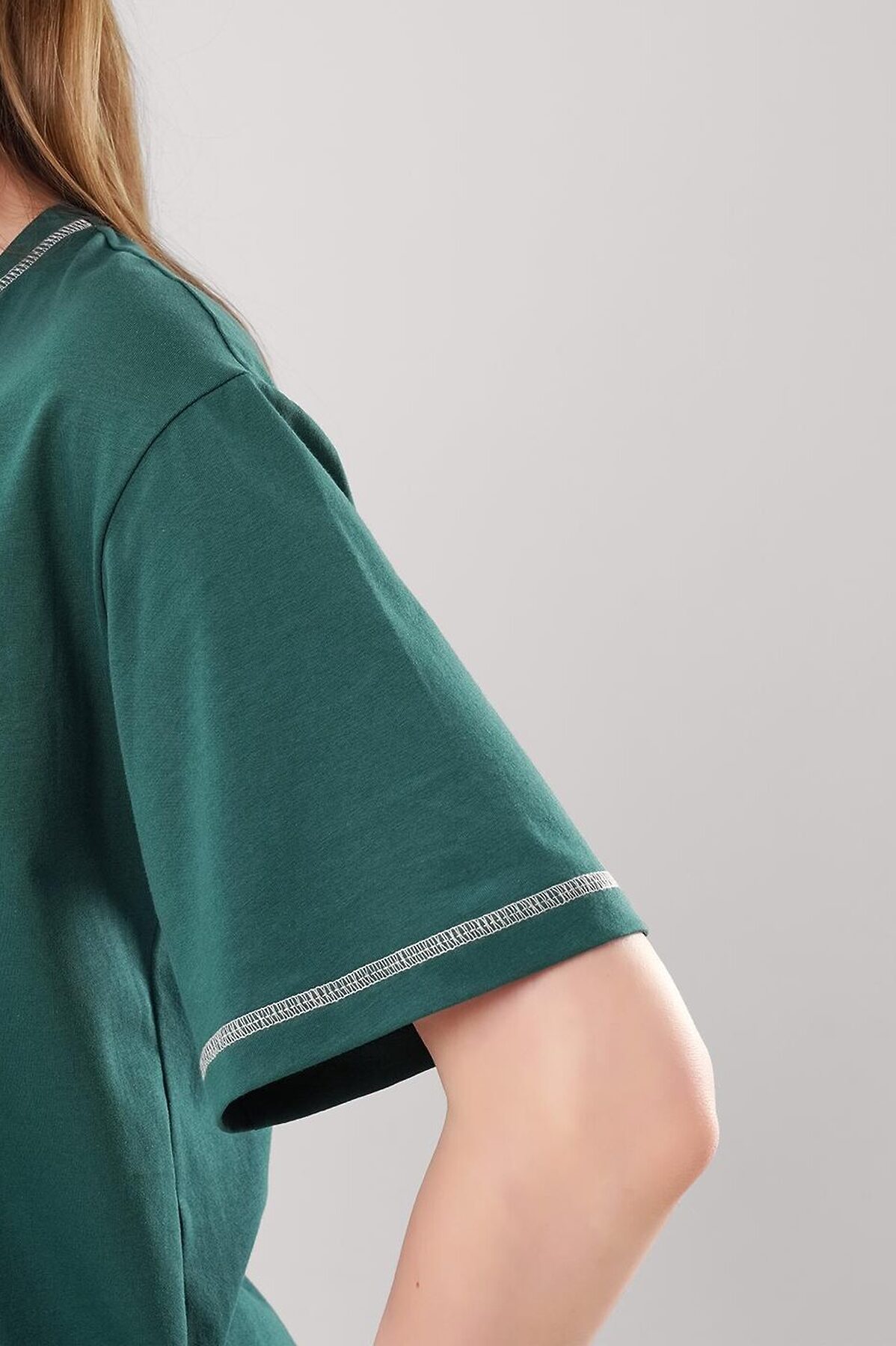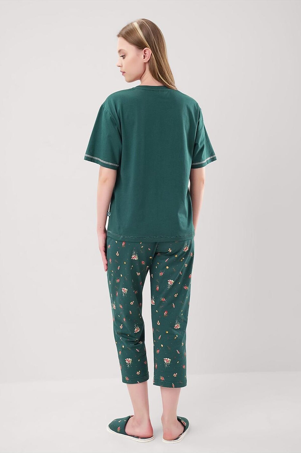 Пижама из трикотажного полотна. Футболка с коротким втачным рукавом, внизу застил. По горловине обтачка с застилом.Спереди принт, нашивка в боковом шве.Бриджи с поясом на внутренней резинке и киперной лентой. Боковые карманы с отрезным бочком,застил.