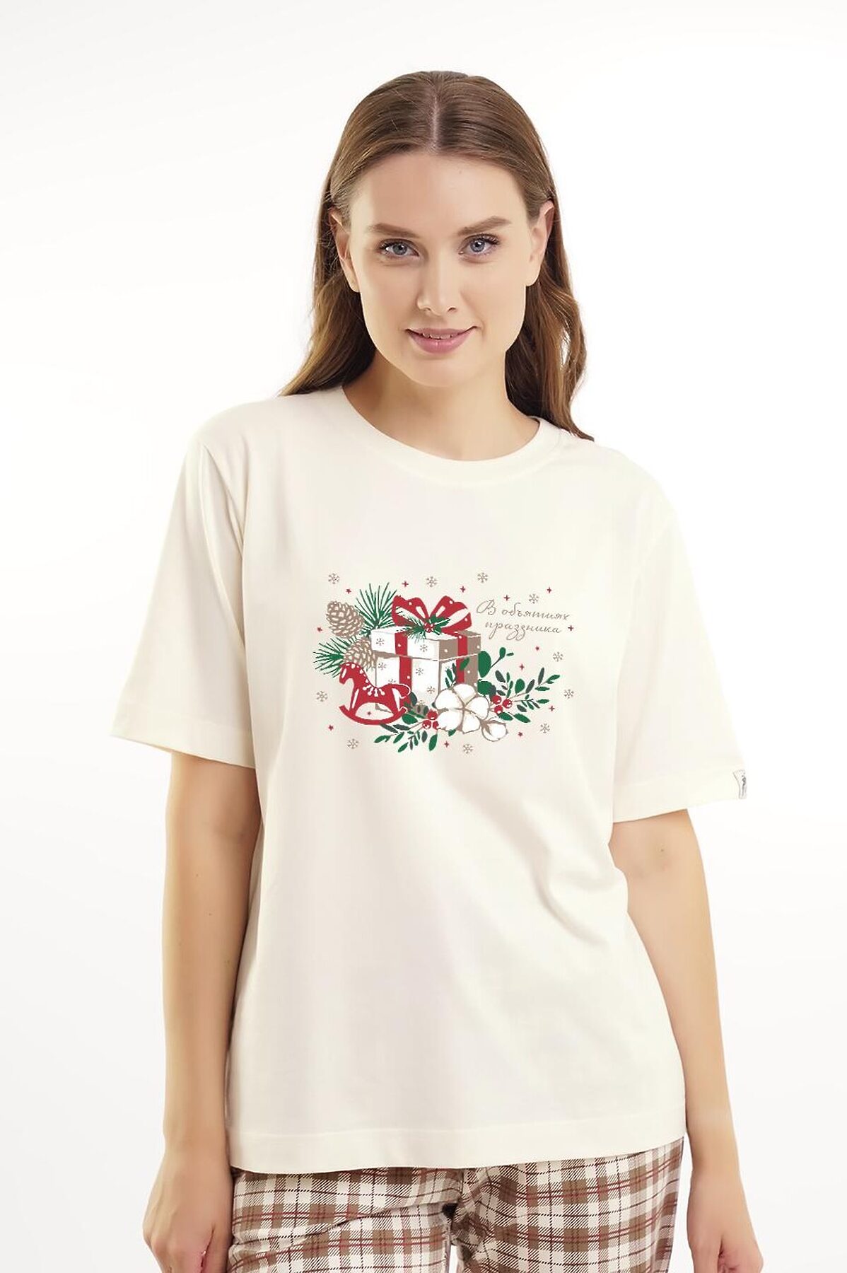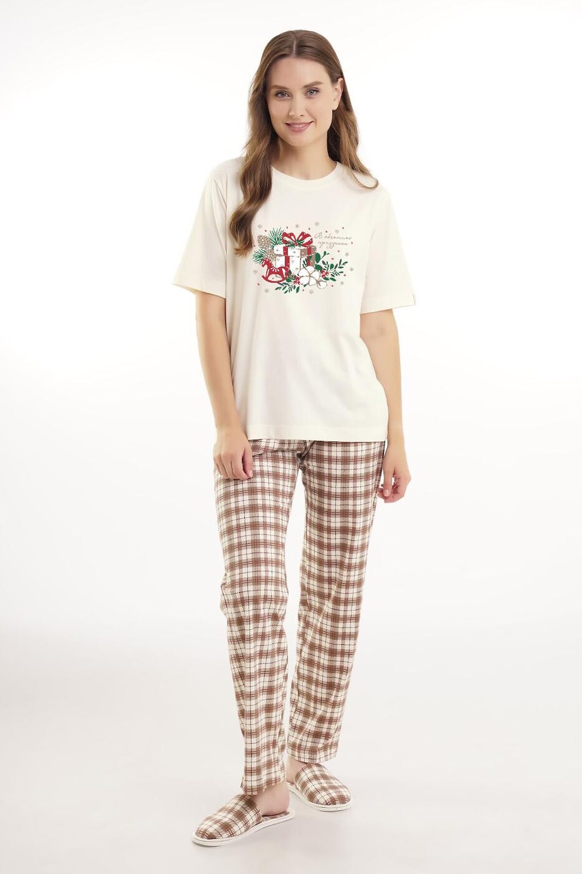 Набор одежды из хлопкового трикотажного полотна. Футболка прямого кроя. Короткий втачной рукав,нашивка. Округлая горловина с обтачкой. Спереди принт. Брюки с поясом на внутренней резинке и киперной лентой. Боковые карманы с отрезным бочком.
