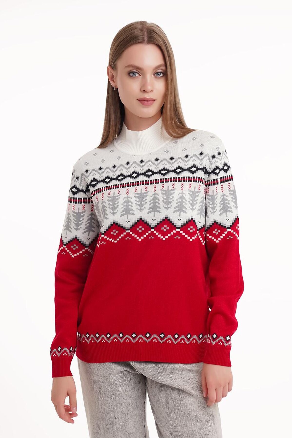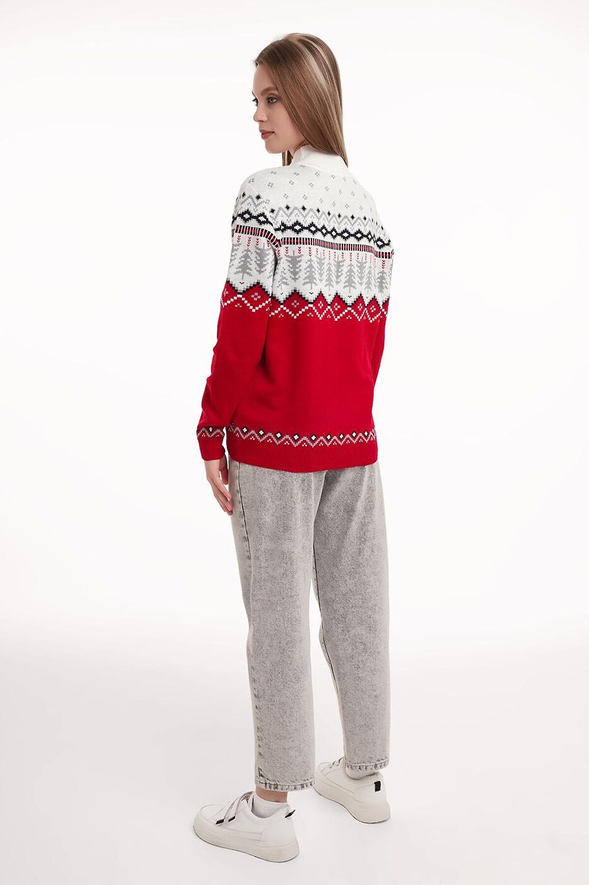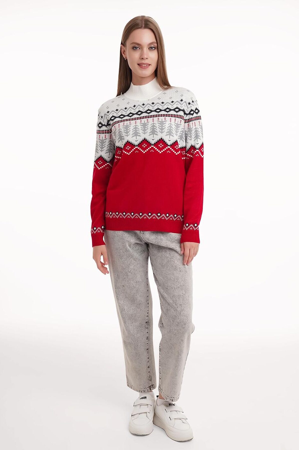 Вязаный джемпер прямого силуэта, жаккардового переплетения из акриловой пряжи. Втачной длинный рукав. По горловине полустойка. По низу изделия и рукавов манжеты.