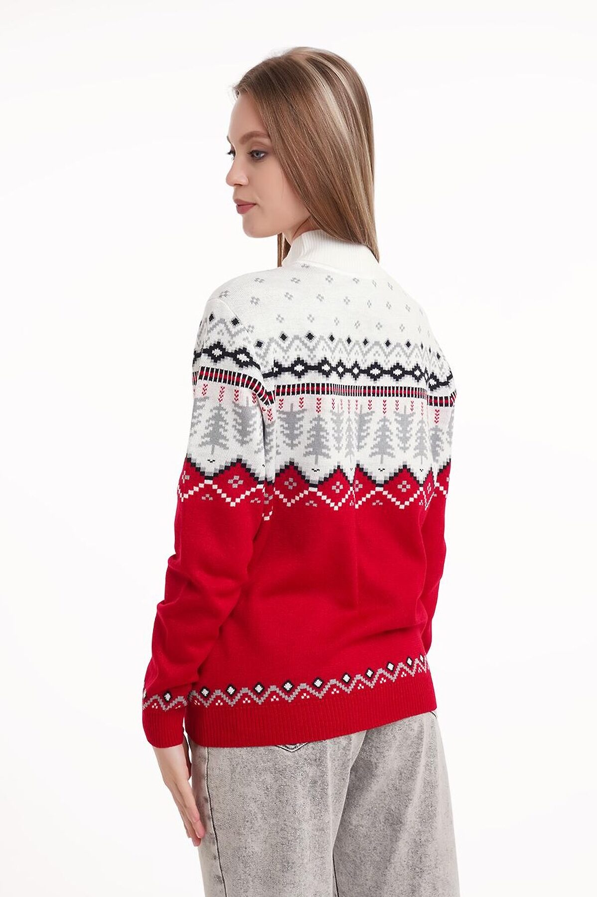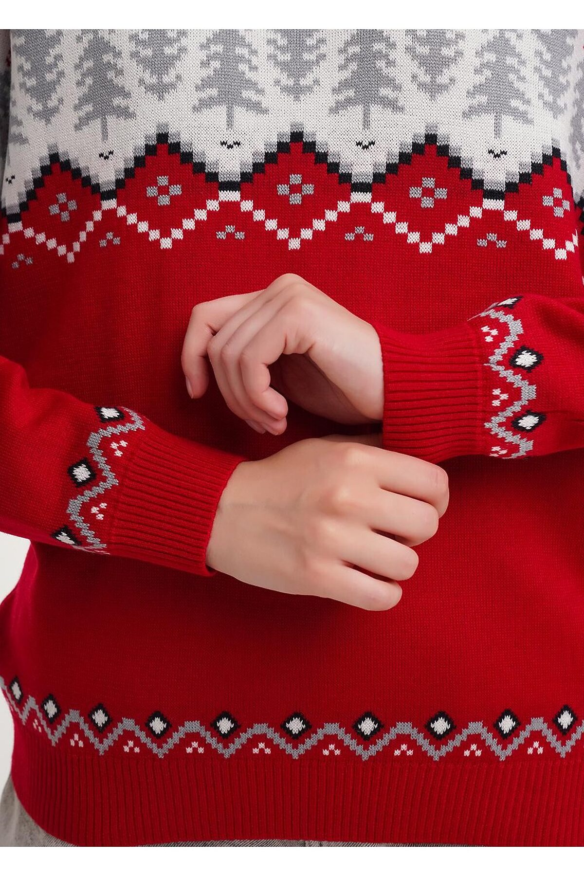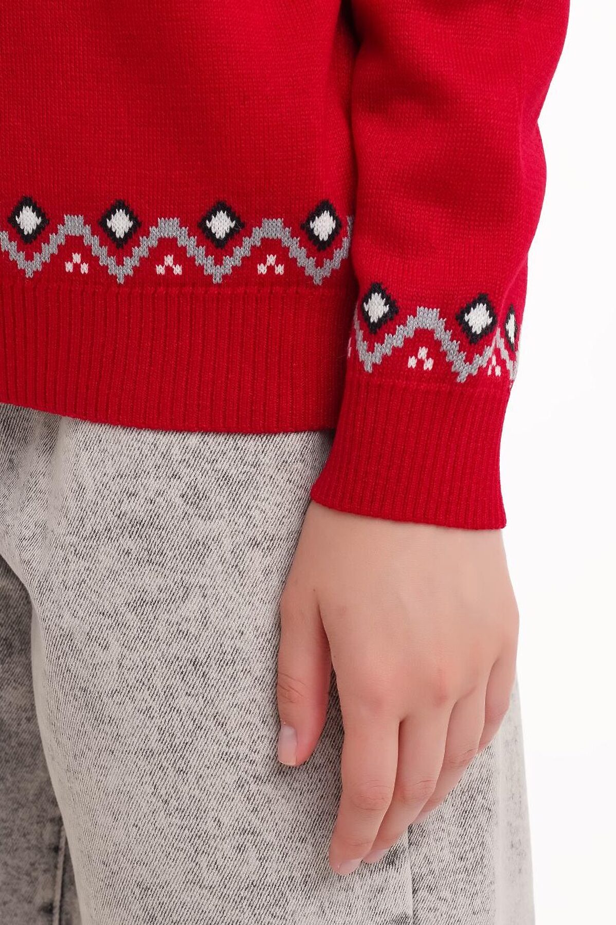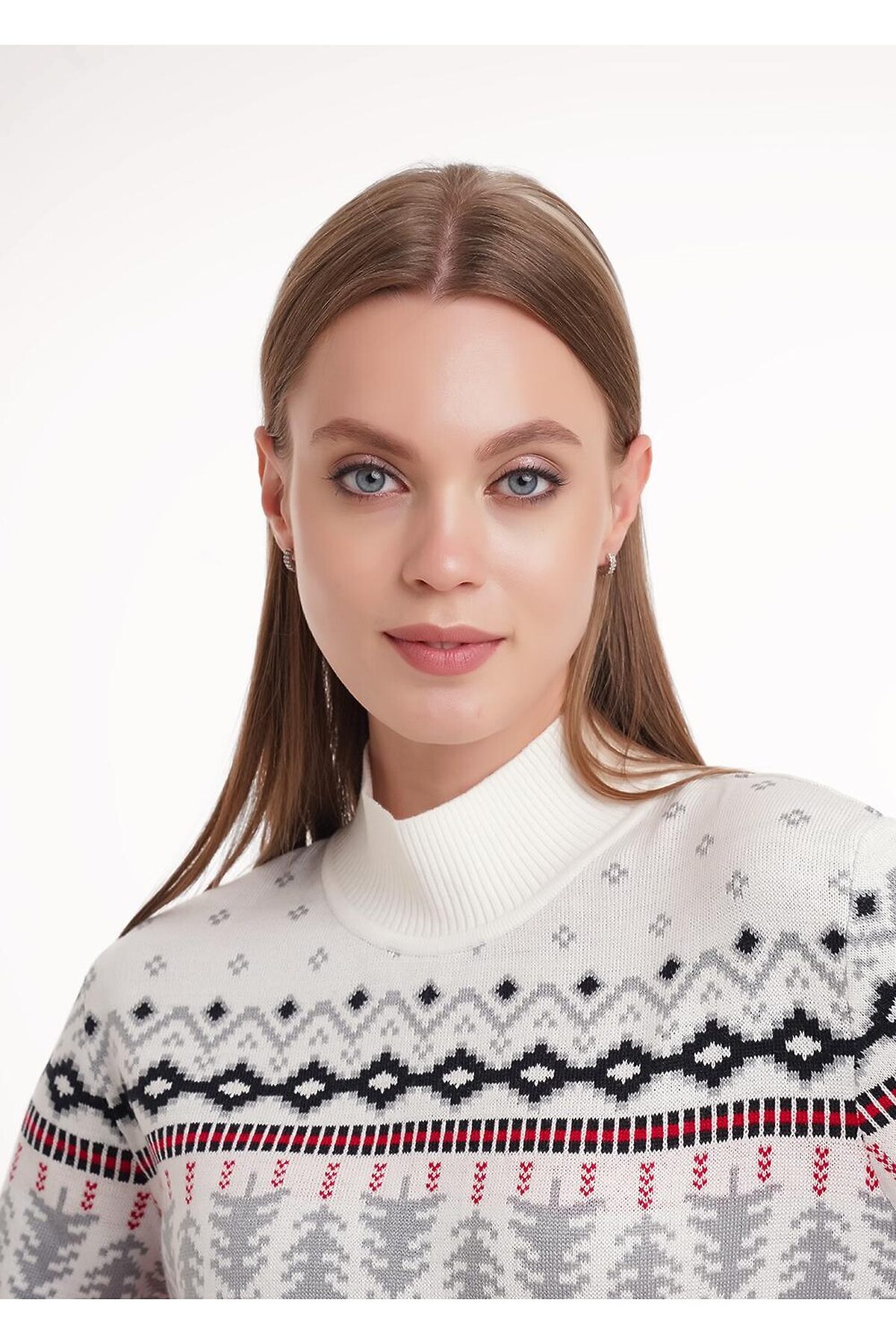 Вязаный джемпер прямого силуэта, жаккардового переплетения из акриловой пряжи. Втачной длинный рукав. По горловине полустойка. По низу изделия и рукавов манжеты.