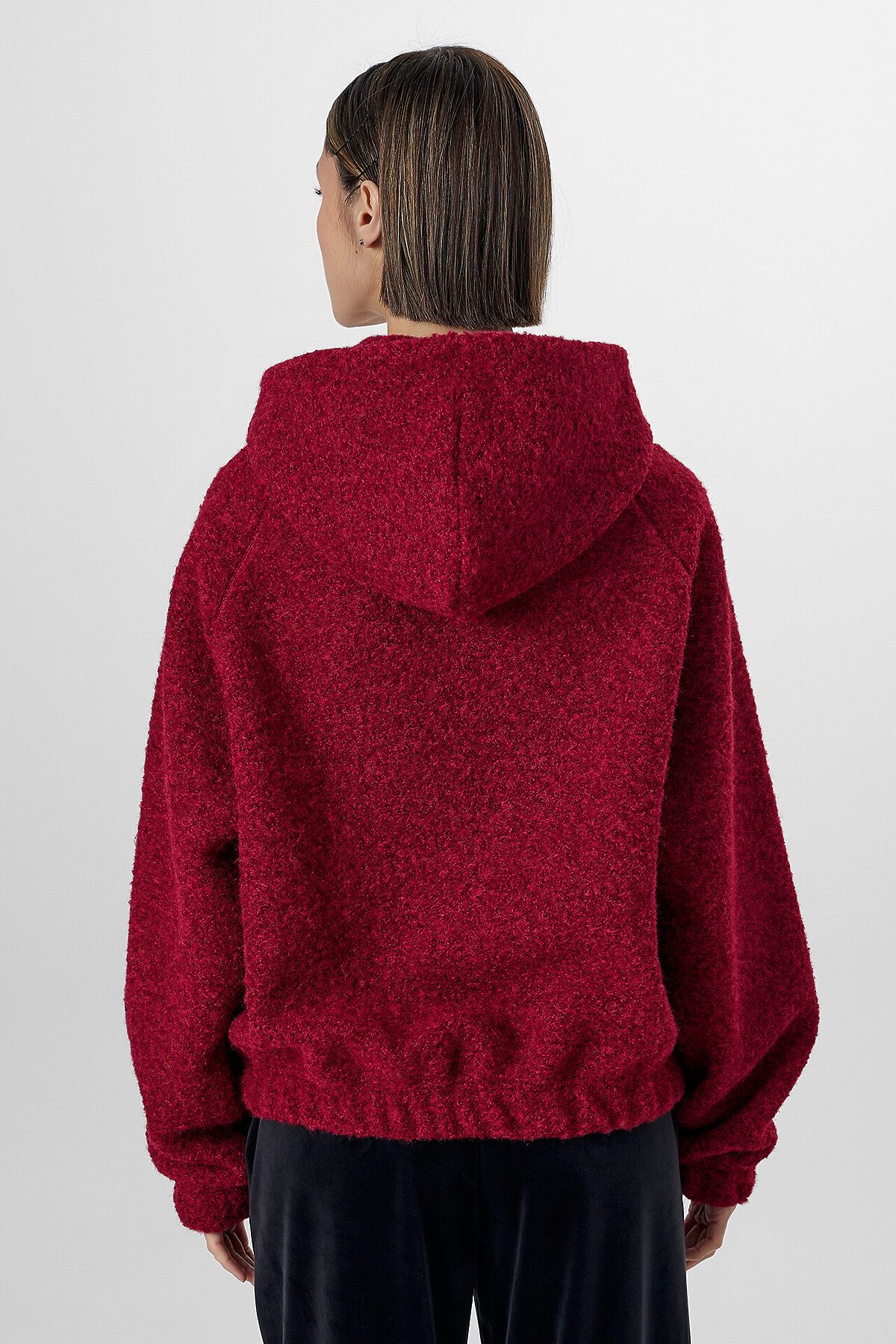 Женское худи бежевого цвета согреет в прохладную погоду. Модель выполнена из уютного материала шерпа, который часто называют «барашек».