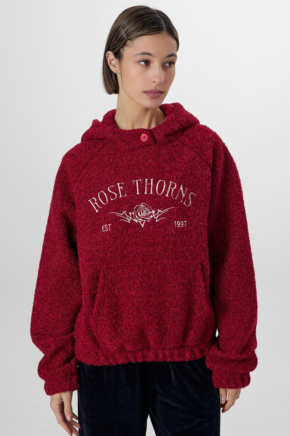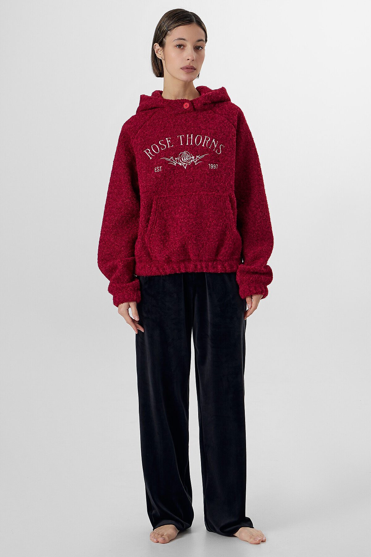 Худи дополнено практичным капюшоном со шнурком-утяжкой для защиты от ветра. Спереди расположен большой накладной карман, где можно согреть руки или хранить мелочи.