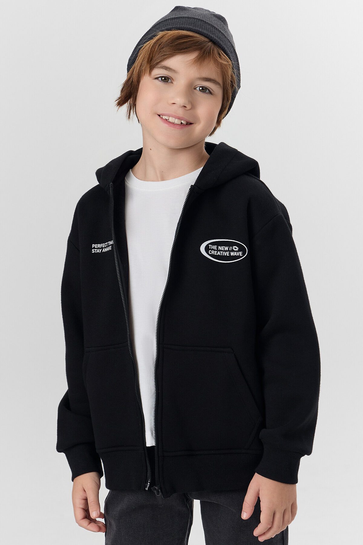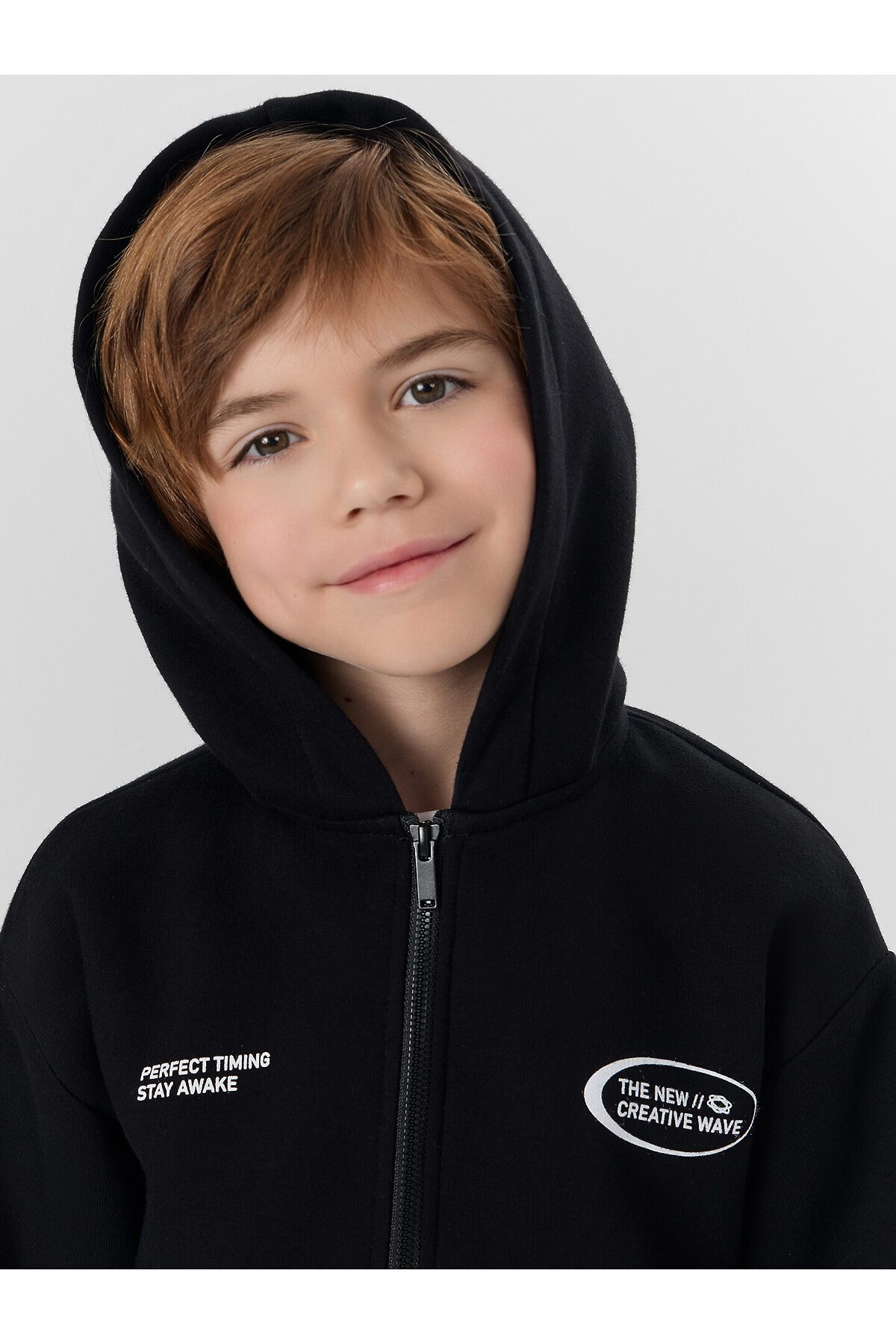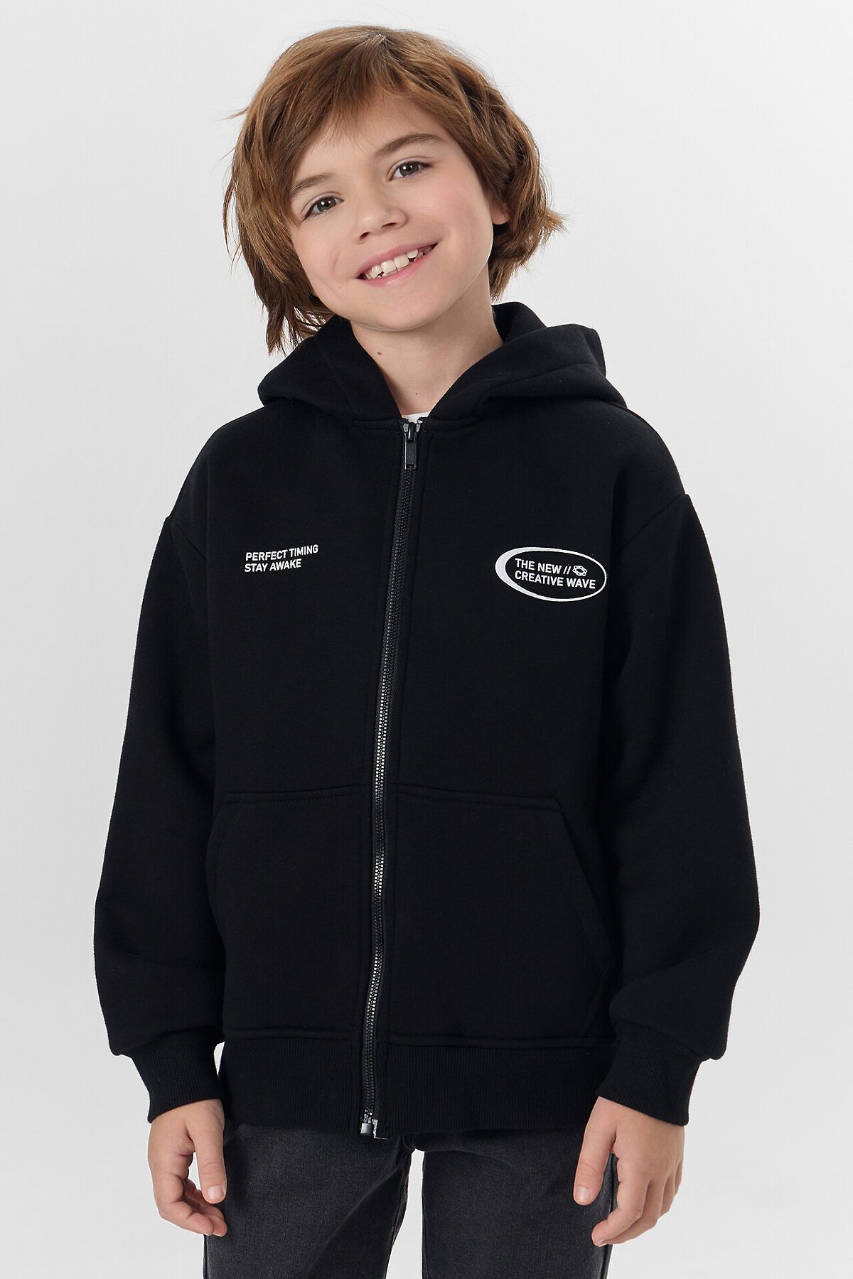 Жакет для мальчиков прямого силуэта с капюшоном. Капюшон на подкладке из основного полотна. Шов втачивания капюшона закрыт х/б тесьмой. Рукава втачные, линия плеча спущена. Притачные манжеты по низу рукавов и притачной пояс из рибаны. По переду застежка молния, карман кенгуру.