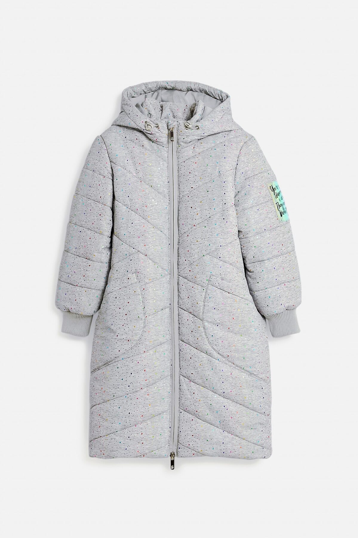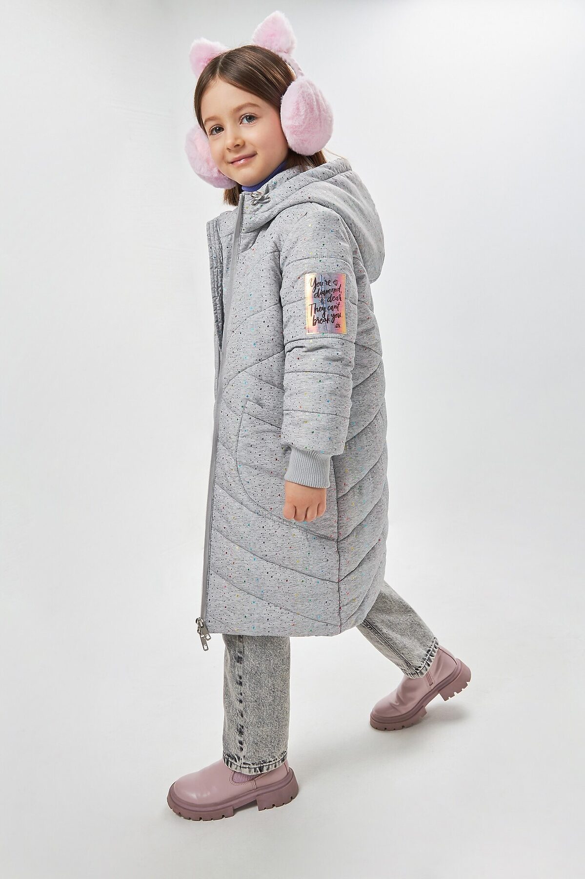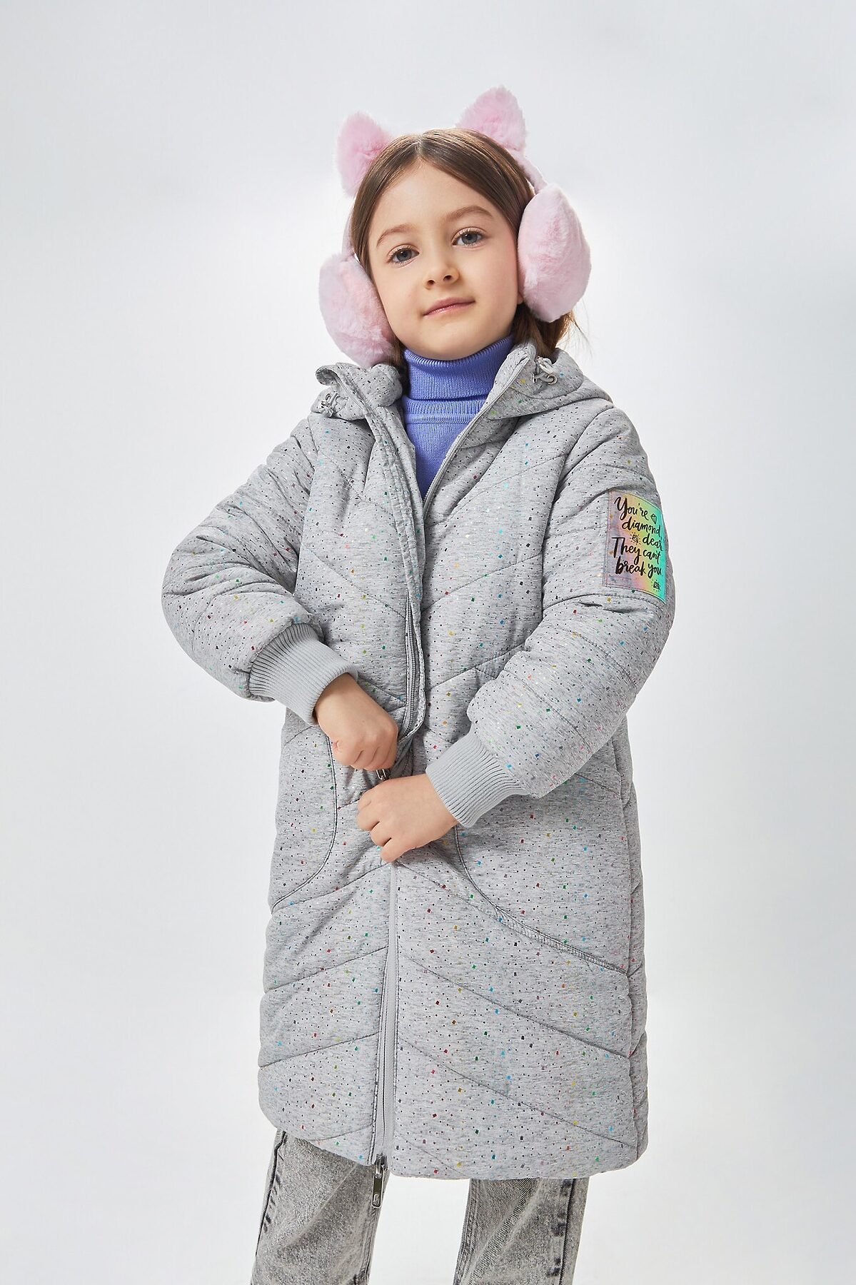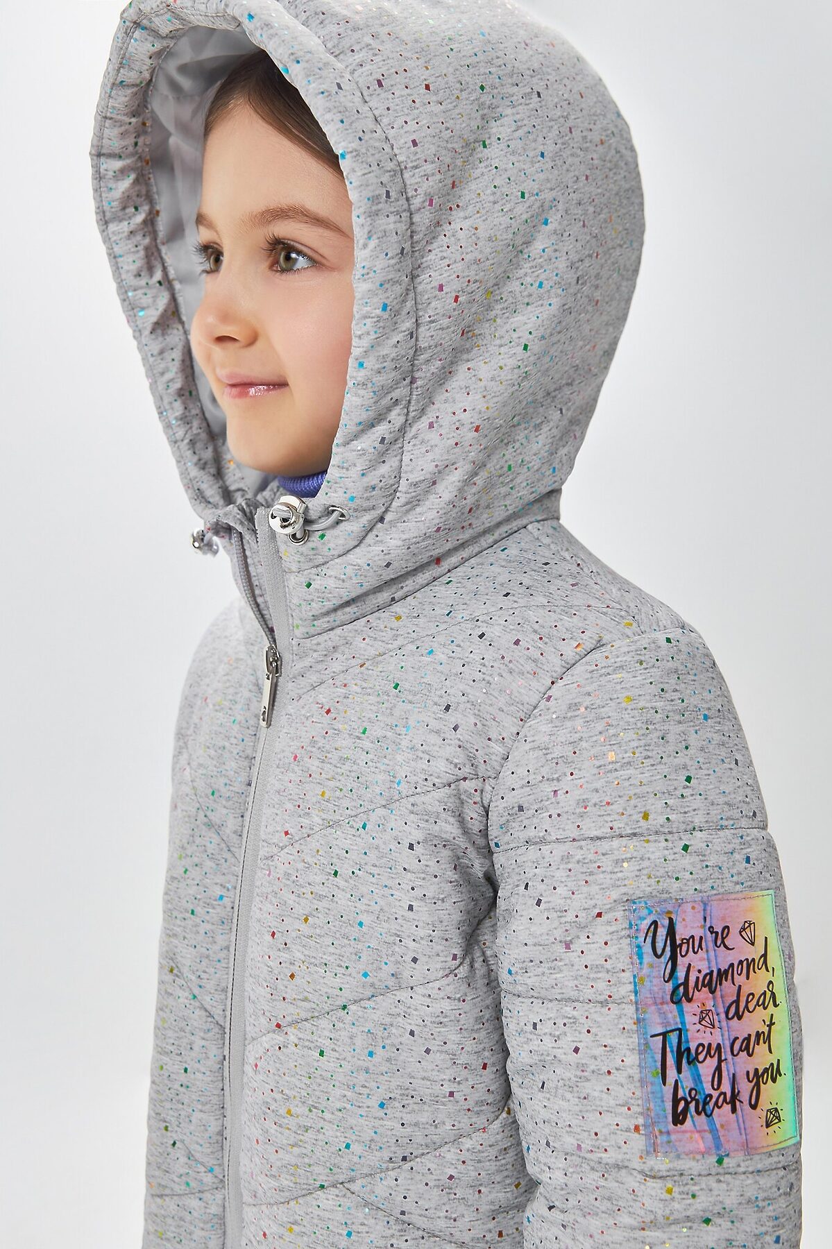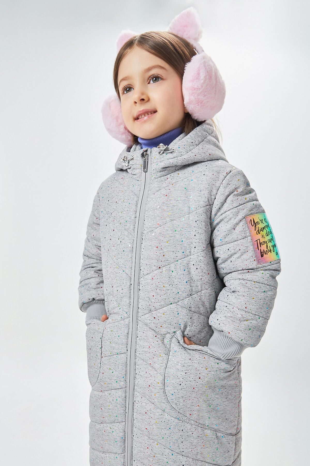 Стеганое пальто в сером цвете, раскрашенное россыпью конфетти, для девочки. Верх выполнен из дышащей и ветроустойчивой ткани понжи, которую трудно порвать даже самому активному ребенку. Благодаря особому плетению волокон, верх устойчив к трению и влаге. Прямой крой, объемный несъемный капюшон и приятная ткань - кутаться в такую вещь зимой особенно приятно. Накладные карманы с наклоном стежки незаметны, но вместительны. Плотные резинки на рукавах и утяжка на капюшоне скроют лицо и руки от морозного ветра. Яркая нашивка на рукаве переливается радугой и напоминает, что YOU'RE DIAMOND, DEAR. THEY CAN’T BREAK YOU Ты бриллиант, дорогая. Им не сломать тебя! - англ..Ткань верха: 100% ПЭ Ткань подклада: 100% ПЭ Рост/размер одежды модели на фото: 110 Вес утеплителя: 350 г/м² Рекомендованный температурный режим*: от 0 до -20С*Температурный режим носит рекомендательный характер. Ощущение тепла и холода зависит от теплообмена ребенка.