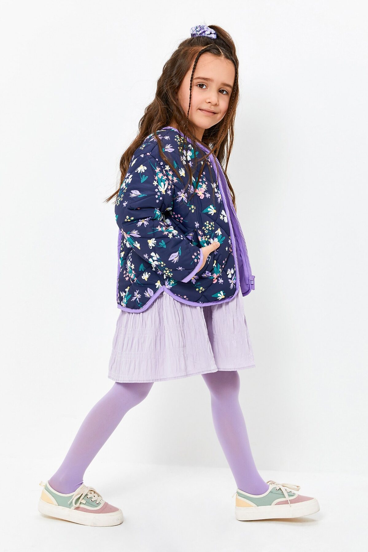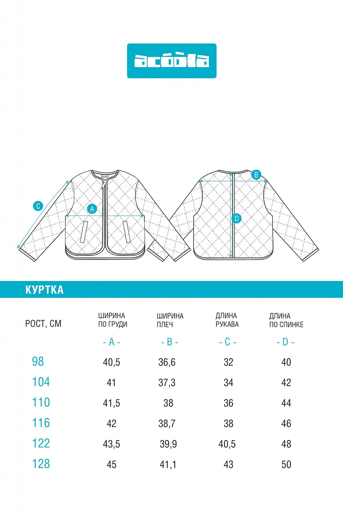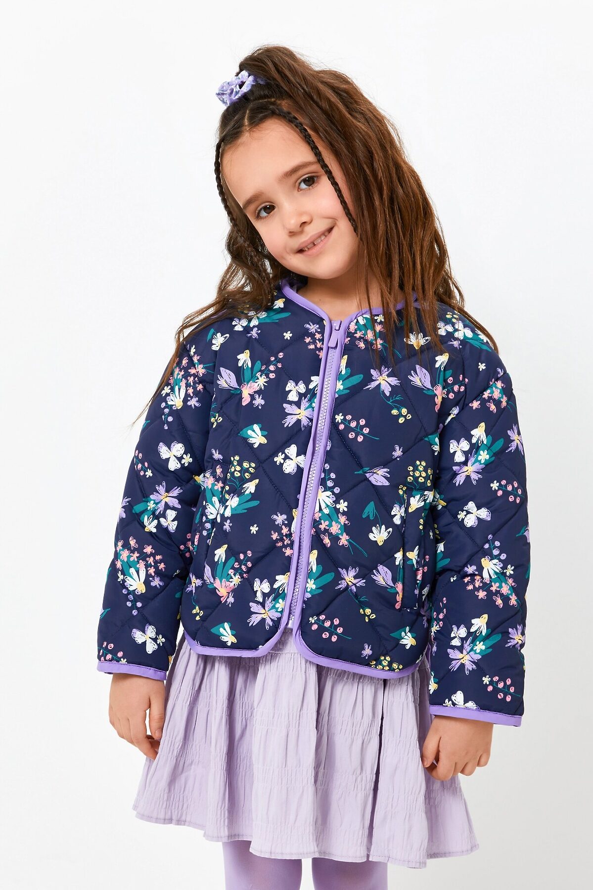 Стеганая утепленная куртка без капюшона для девочки. Выполнена из влагозащитной ткани, утеплена легким, удерживающим тепло искусственным пухом. Мягкая контрастная подкладка выполнена из стандартной подкладочной износостойкой ткани и простегана вместе с вместе с наполнителем и тканью верха. Застежка на контрастную молнию. Низ изделия, капюшон и низ рукавов декорированы контрастной окантовкой. Спереди два прорезных кармана. Рекомендованный температурный режим от -10 до +10 С*. Представлена в цветах: голубой, розовый, цветочный принт. Состав ткани верха: полиэстер – 100%. Плотность ткани: 60 гр/м2. Состав ткани подклада: полиэстер – 100%. Плотность ткани: 65 гр/м2. Состав утеплителя: полиэстер – 100%. Плотность ткани: 200 гр/м2. Рост/размер одежды модели на фото: 110. *Температурный режим носит рекомендательный характер. Ощущение тепла и холода зависит от теплообмена ребенка.