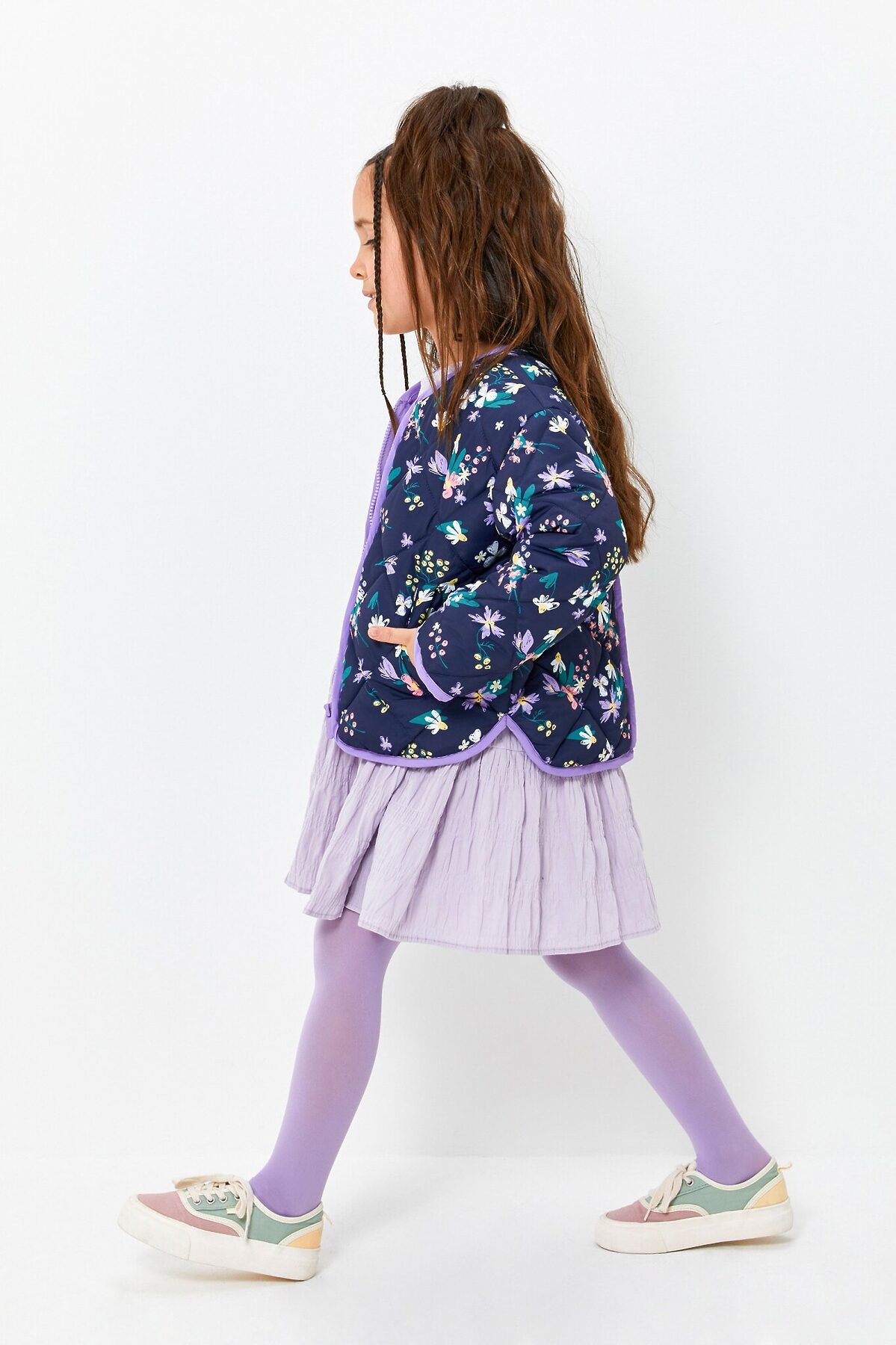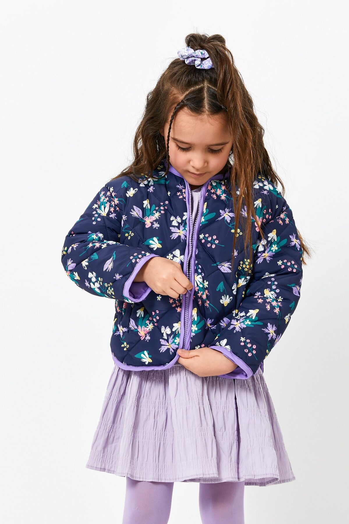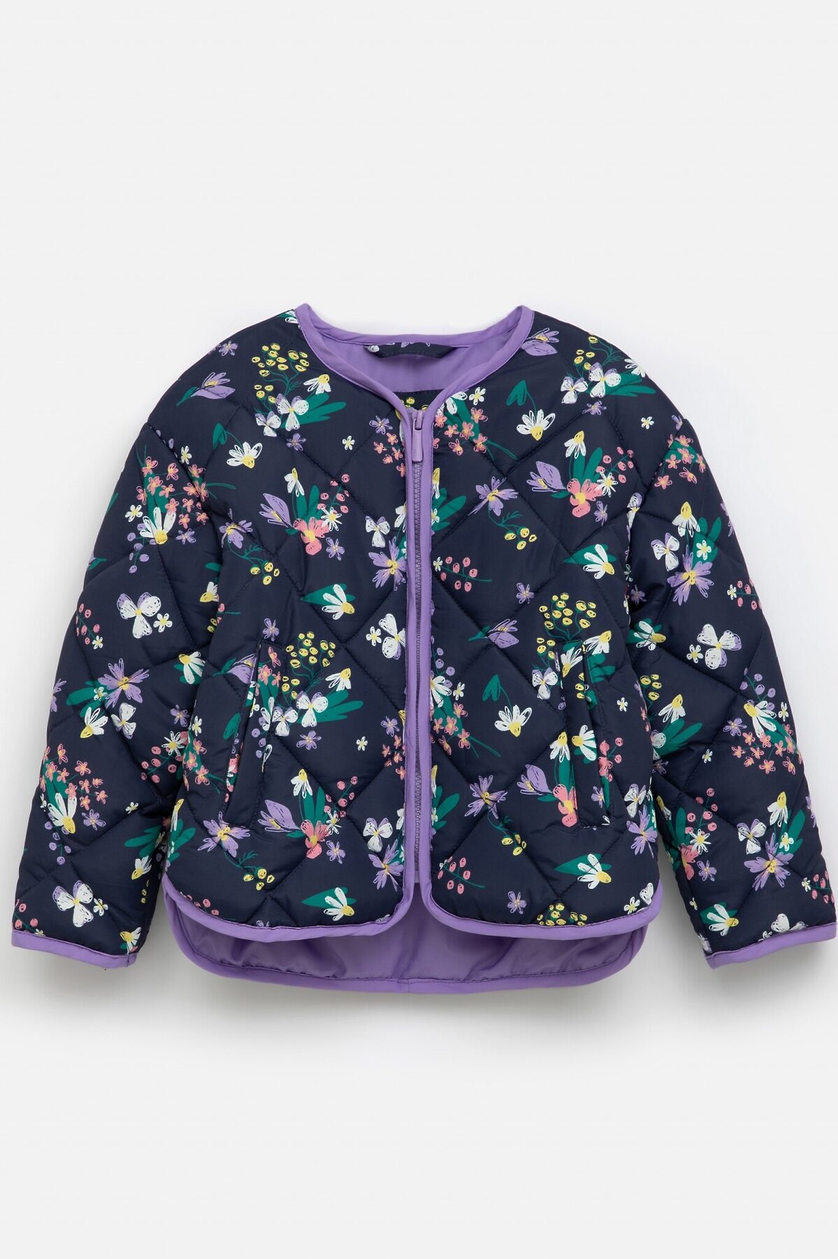 Стеганая утепленная куртка без капюшона для девочки. Выполнена из влагозащитной ткани, утеплена легким, удерживающим тепло искусственным пухом. Мягкая контрастная подкладка выполнена из стандартной подкладочной износостойкой ткани и простегана вместе с вместе с наполнителем и тканью верха. Застежка на контрастную молнию. Низ изделия, капюшон и низ рукавов декорированы контрастной окантовкой. Спереди два прорезных кармана. Рекомендованный температурный режим от -10 до +10 С*. Представлена в цветах: голубой, розовый, цветочный принт. Состав ткани верха: полиэстер – 100%. Плотность ткани: 60 гр/м2. Состав ткани подклада: полиэстер – 100%. Плотность ткани: 65 гр/м2. Состав утеплителя: полиэстер – 100%. Плотность ткани: 200 гр/м2. Рост/размер одежды модели на фото: 110. *Температурный режим носит рекомендательный характер. Ощущение тепла и холода зависит от теплообмена ребенка.