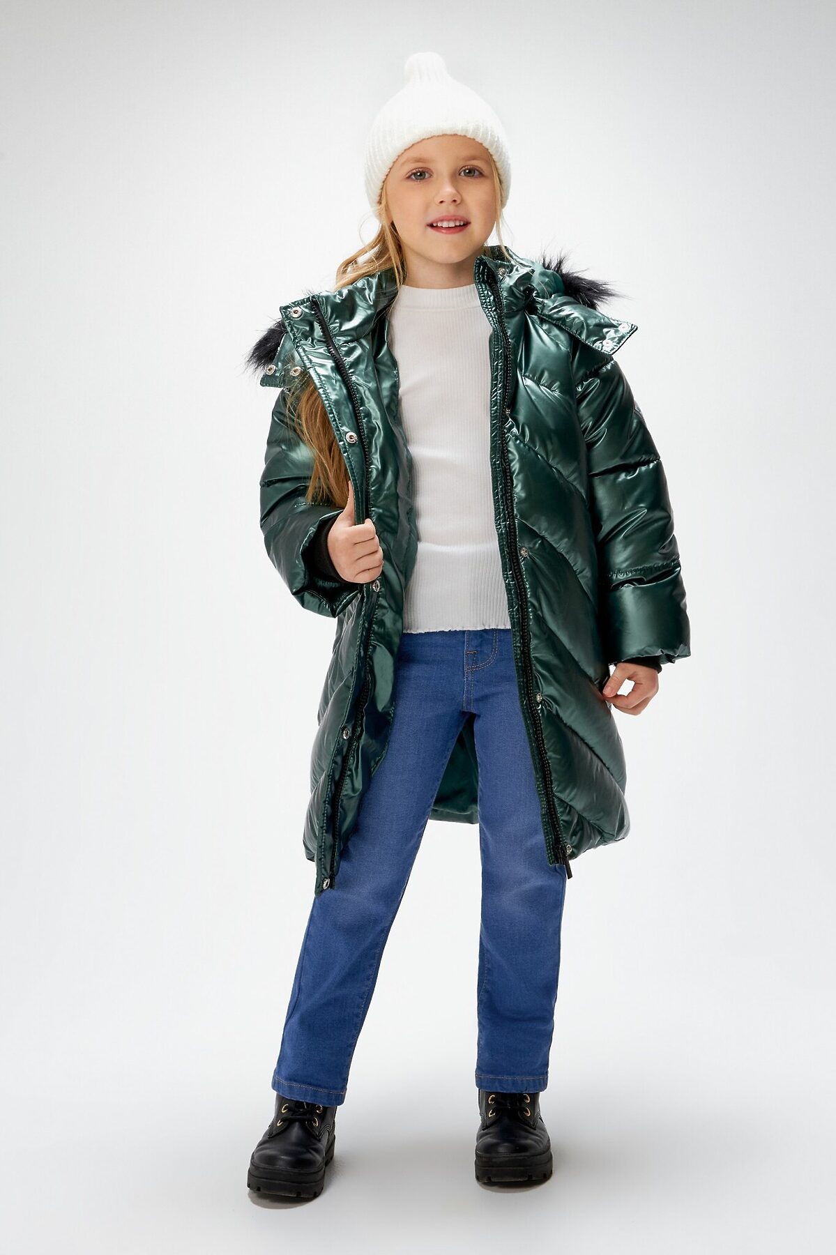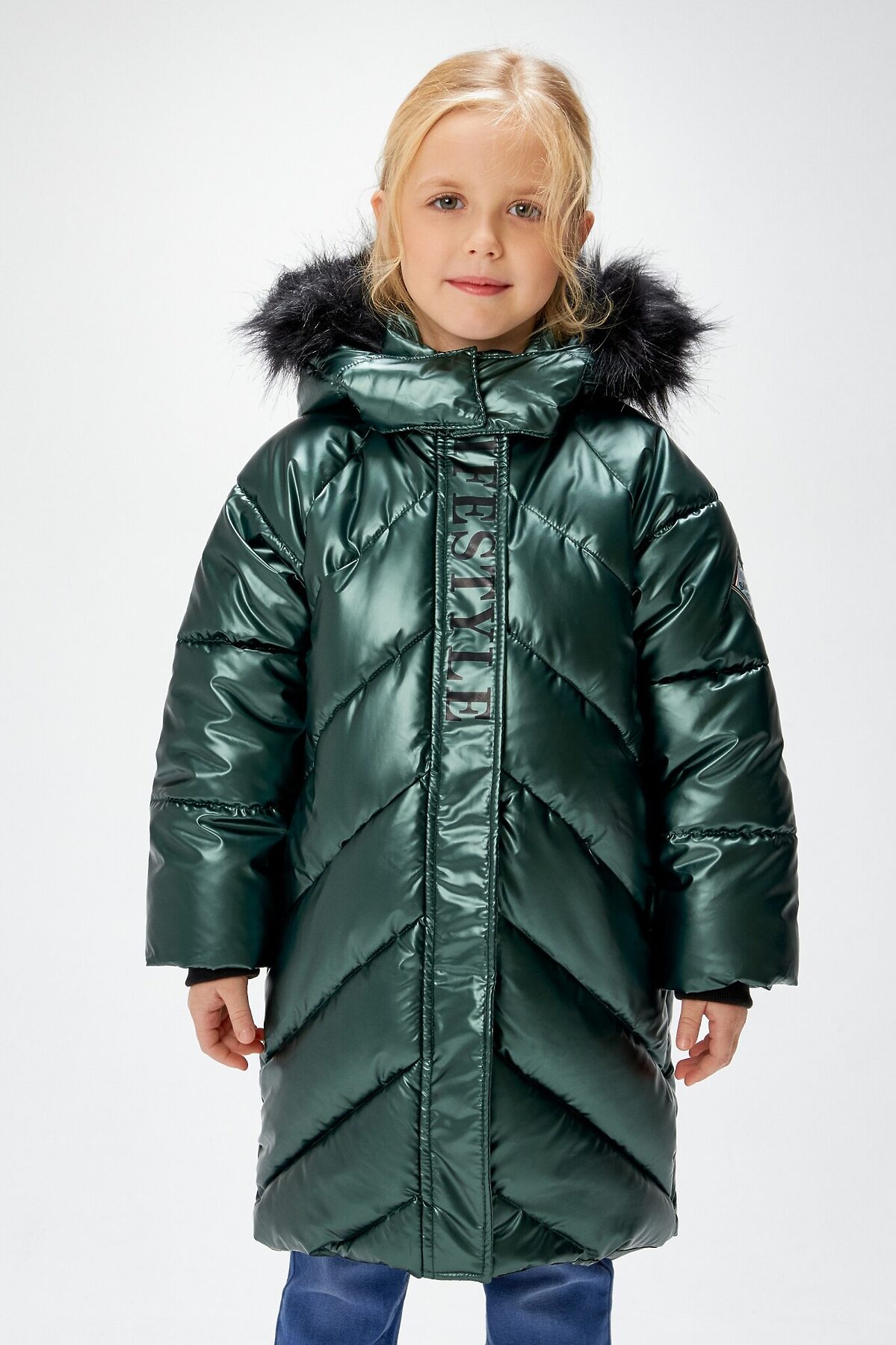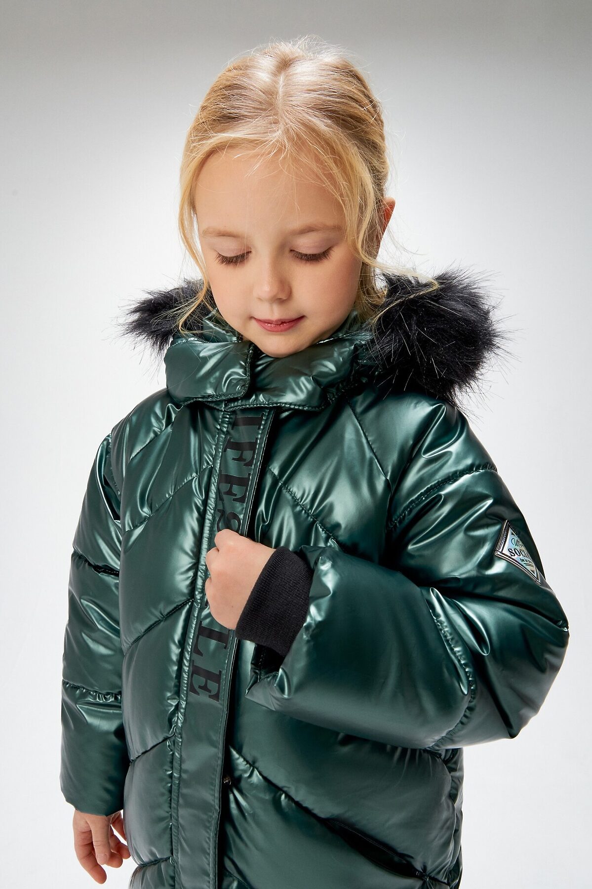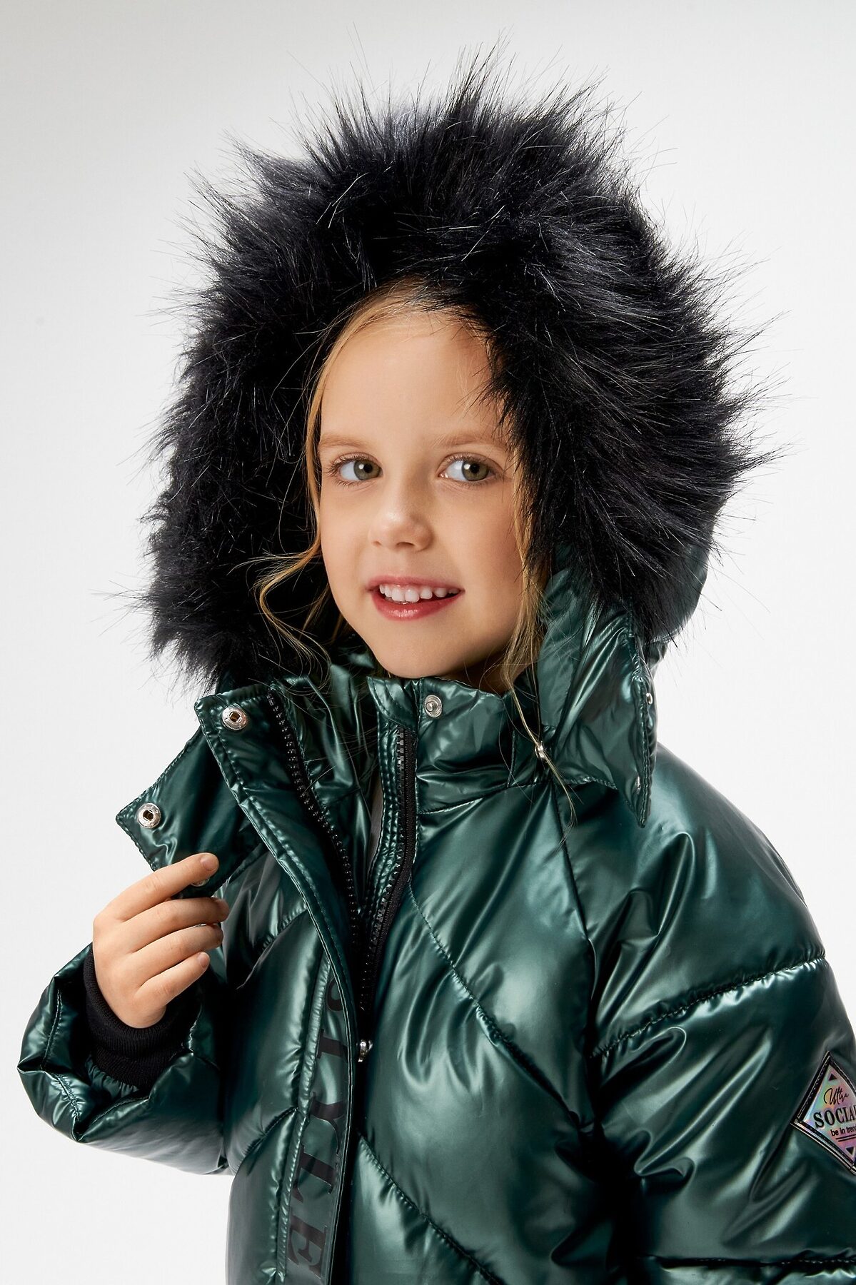 Утеплённое стеганое пальто с капюшоном для девочки изготовлено из водонепроницаемой ткани. Наполнитель - синтепух (вес 300-400гр/м2). Рекомендованный температурный режим от 0 до -20 градусов. Подкладка для тела и карманов выполнена из стандартной подкладочной ткани. Застёжка на молнию и кнопки с внешней и внутренней ветрозащитными планками. Спереди в швах два кармана, застёгивающихся на молнию. Съёмный капюшон на кнопках с отстегивающейся меховой опушкой убережёт от ветра и непогоды. Мягкие трикотажные манжеты исключают задувание холодного воздуха. Длина пальто до колена. На левом рукаве нашит декоративный голографический патч со словами "ULTRA SOCIAL. BE IN TREND" англ. - "Ультрасоциальная. Будь в тренде". Спереди, по ветрозащитной планке расположена надпись "LIFESTYLE" англ. - "Стиль жизни". Стилизуйте с трикотажными брюками из мягкой пряжи (арт.20220160409) и джемпером в тон, чтобы создать повседневный образ. Рост модели на фото: 110