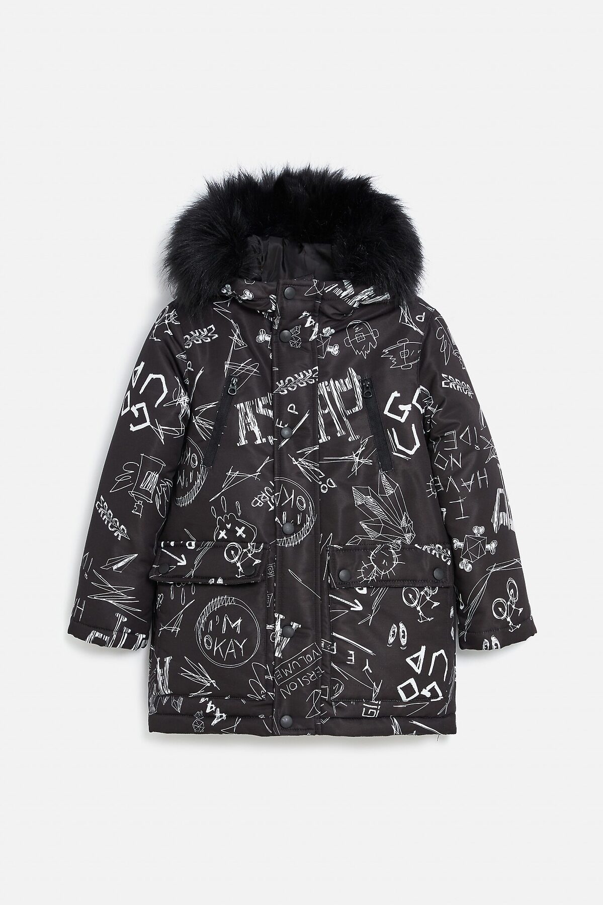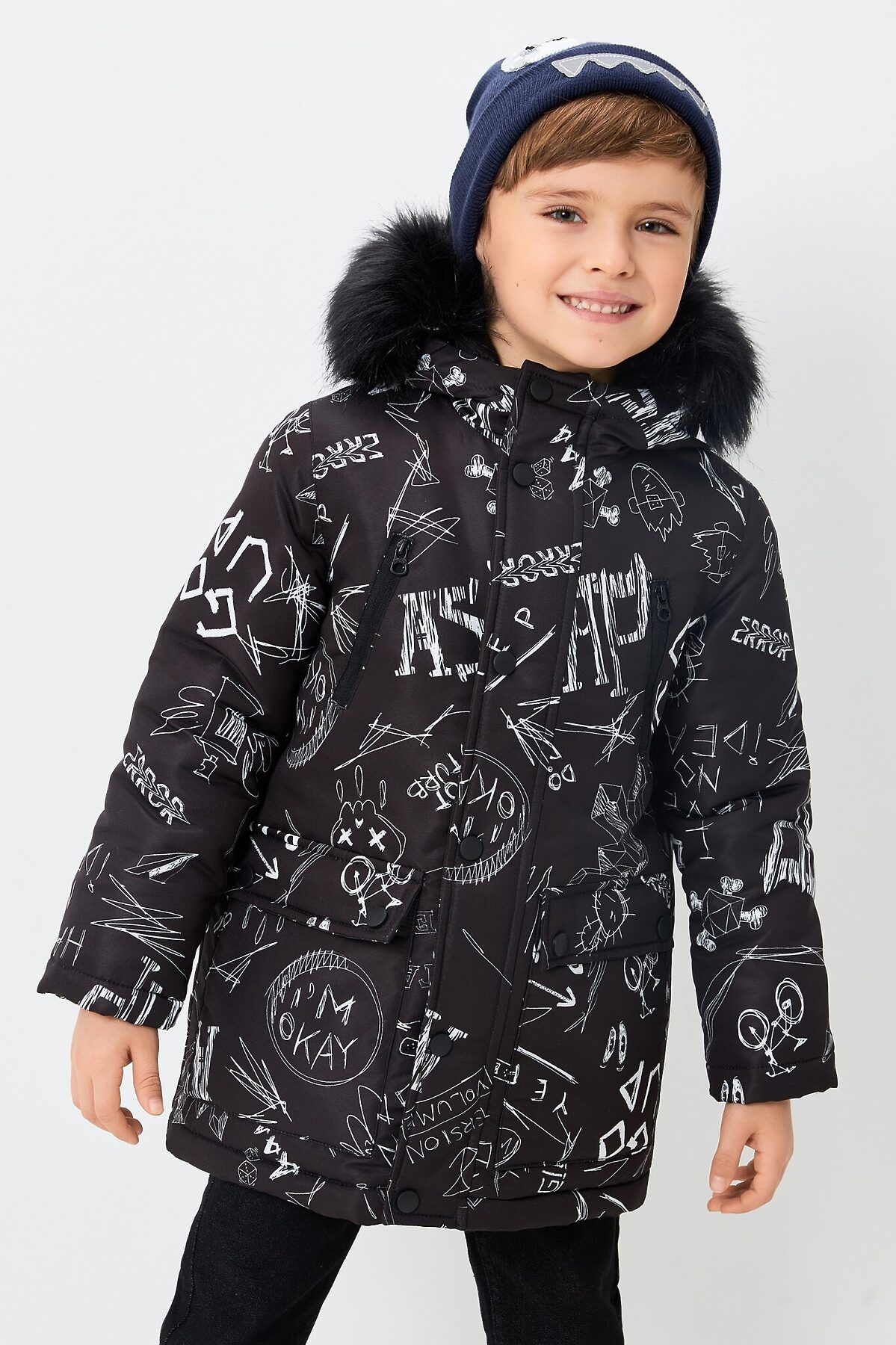Утепленная куртка со стильным граффити-рисунком для мальчиков. Выполнена из прочной износоустойчивой ткани, которая хорошо защищает от ветра и не деформируется при носке. Наполнитель - мягкая разновидность синтепона. Это лёгкий, гипоаллергенный и водостойкий материал, который хорошо сохраняет тепло. Глубокий капюшон с отстёгивающимся искусственным мехом защитит лицо ребенка от ветра и дождя. Рукава с трикотажными манжетами плотно прилегают и не продуваются. Застёжка на пластиковую молнию усилена ветрозащитной планкой на кнопках. Два накладных объемных кармана с кнопками на клапанах для самых важных вещей. Подкладка утеплена флисом для создания дополнительного комфорта при носке. Ткань верха: 100% ПЭ Ткань подклада: 100% ПЭ Вес утеплителя: 250 г/м2 Рекомендованный температурный режим*: от 0 до -15 C. *Температурный режим носит рекомендательный характер. Ощущение тепла и холода зависит от теплообмена ребёнка. Рост/размер одежды модели на фото: 110