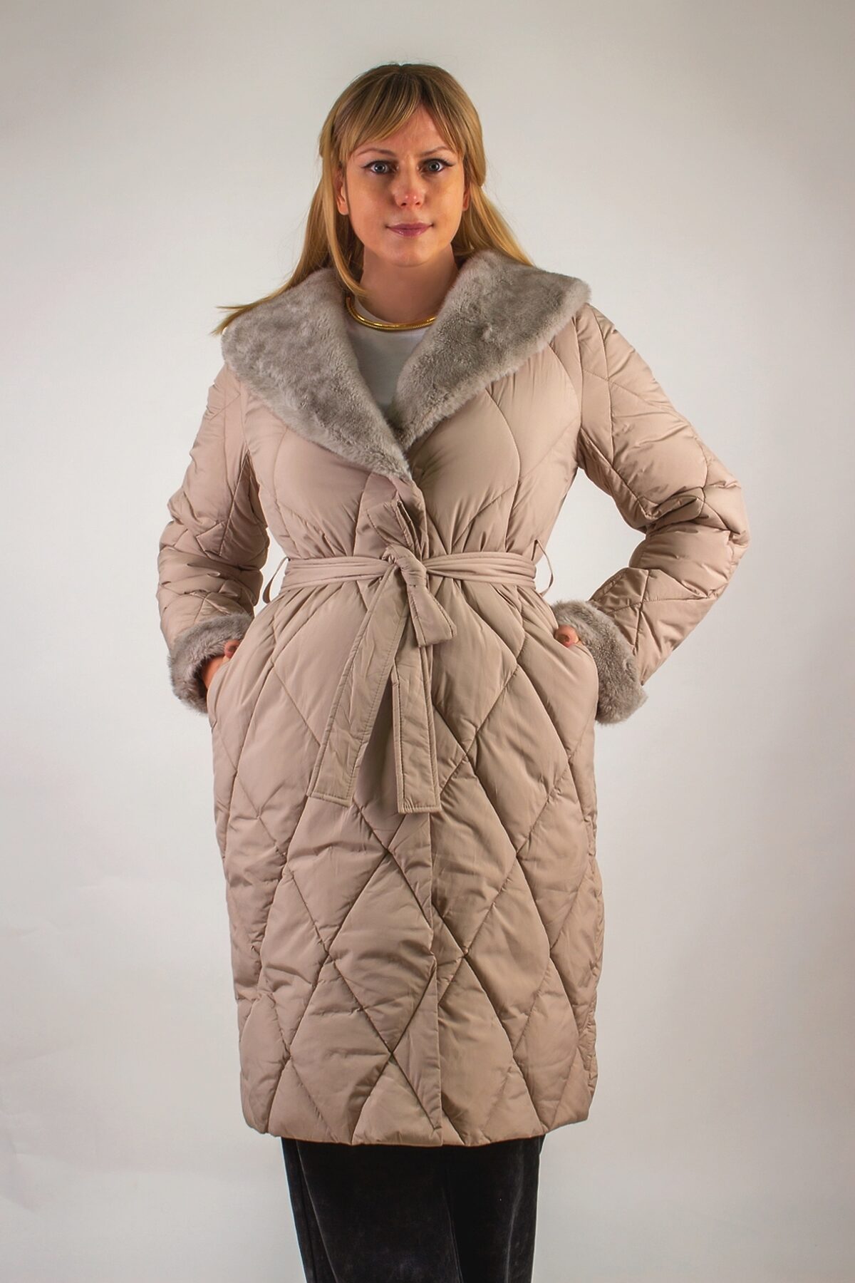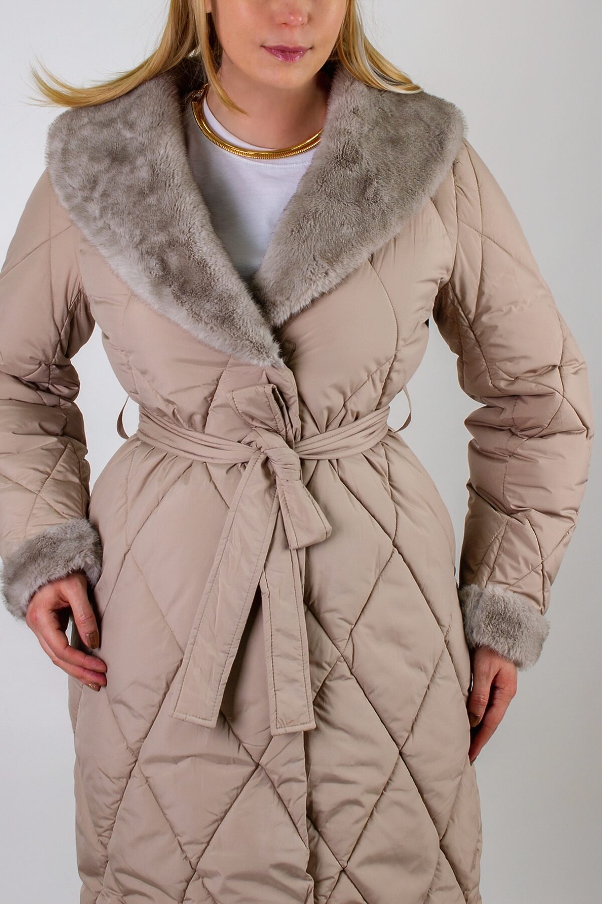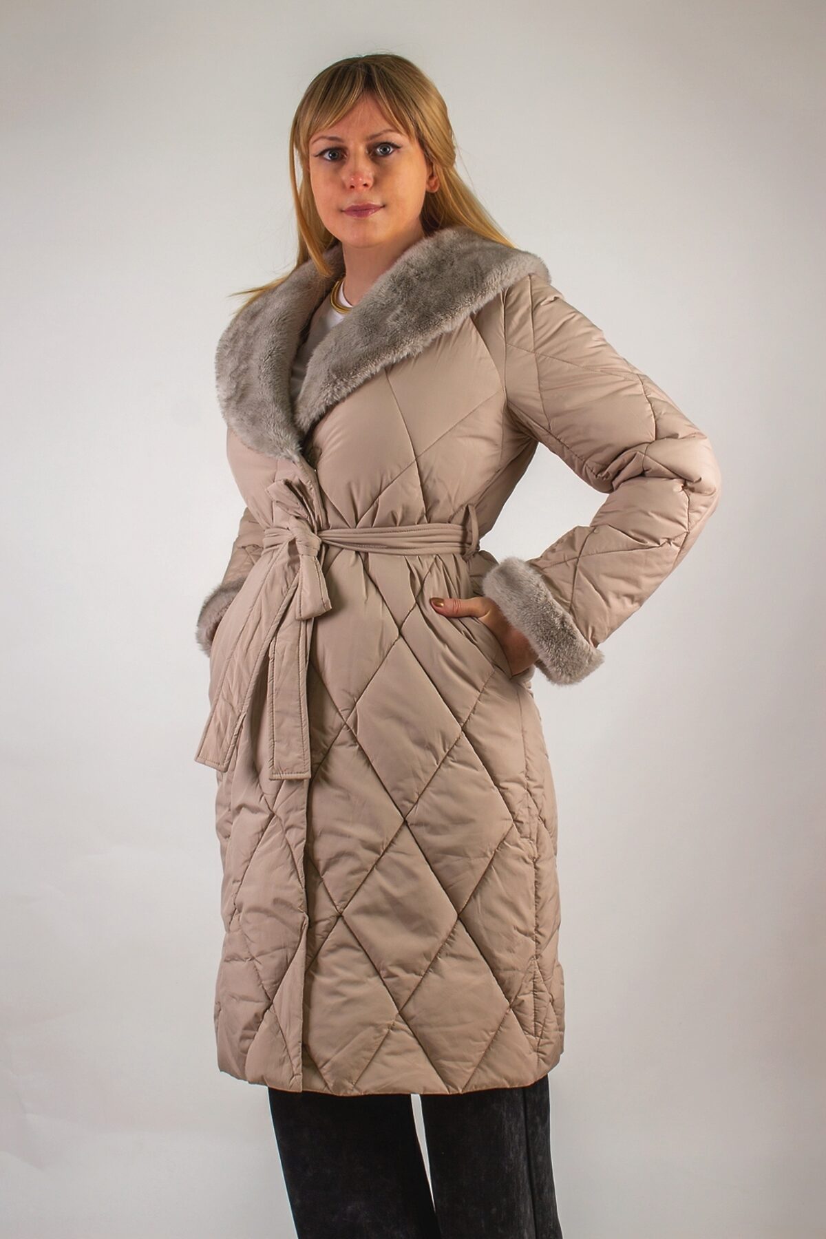 Стеганое пальто с меховой отделкой арт. 23153, евро-зима, демисезон. это сочетание утончённого городского стиля и продуманной функциональности. Модель с утеплителем оптимальной плотности, что позволяет комфортно чувствовать себя при температурах до 10С . Демисезонная адаптивность делает пальто универсальным решением для межсезонья, когда погода переменчива. Верх выполнен из износостойкого полиэстера с водоотталкивающей пропиткой, сохраняющей лёгкость и не дающей влаге скапливаться на поверхности. Диагональная стёжка ромбом равномерно распределяет наполнитель, предотвращая холодные зоны и деформацию изделия после стирок. Модель легко стирается в деликатном режиме, не теряя формы и цвета. Отложной воротник и отделка манжет декорированы искусственным мехом серого оттенка под норку, придающим акцент и уютный объём у лица и на рукавах. Такой приём не просто украшает изделие, но и защищает от ветра и холода. Трикотажные рукава на манжетах обеспечивают свободу движений и создают дополнительный тепловой барьер. Пальто застёгивается на двухзамковую молнию с защитной планкой на кнопках конструкция надёжна, удобна в эксплуатации и защищает от продувания. Акцентным дополнением служит съёмный пояс в тон, подчёркивающий линию талии и создающий изящный силуэт песочные часы. По бокам расположены два скрытых кармана-листочки с застёжками-кнопками, чтобы ценные мелочи и смартфон всегда были под рукой. Бежевый оттенок фасона универсален: он гармонирует с яркими и нейтральными образами, легко комбинируется с шарфами, шапками и обувью любого стиля. Это пальто станет вашим верным спутником в городе и на загородных прогулках, обеспечивая комфорт и безупречный внешний вид. Арт. 23153 выбор современных женщин, ценящих качество, тепло и элегантность в каждой детали.