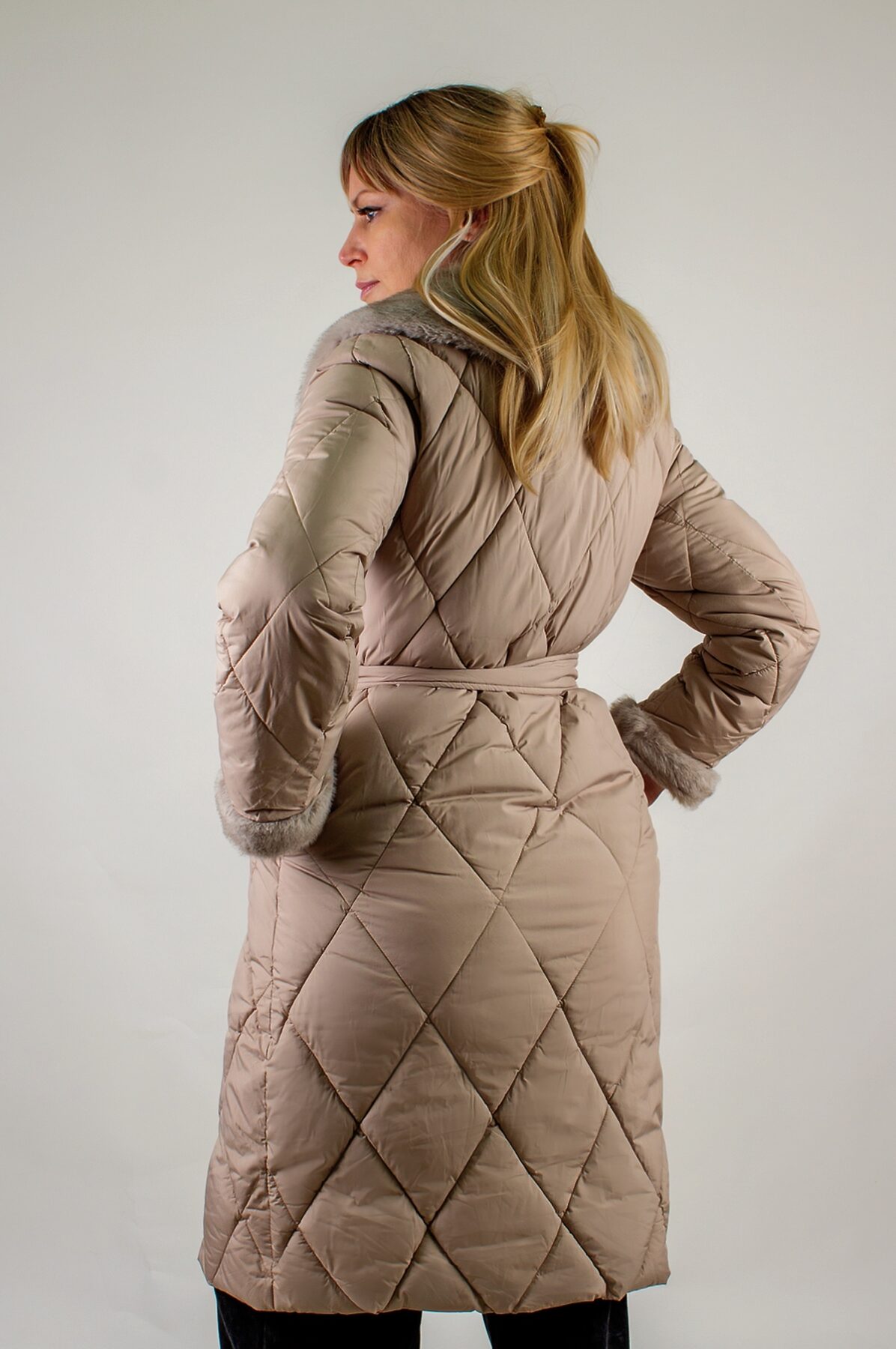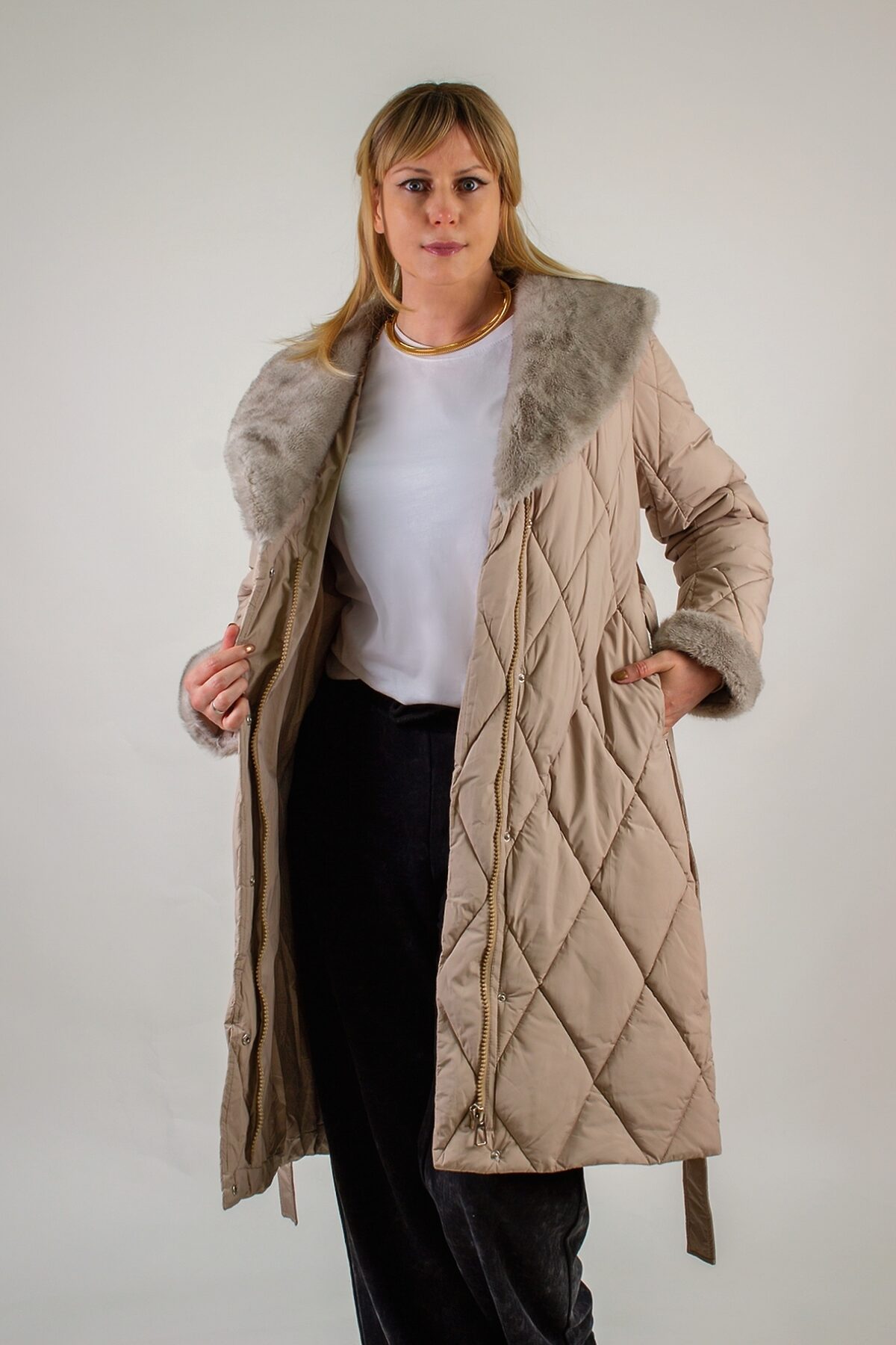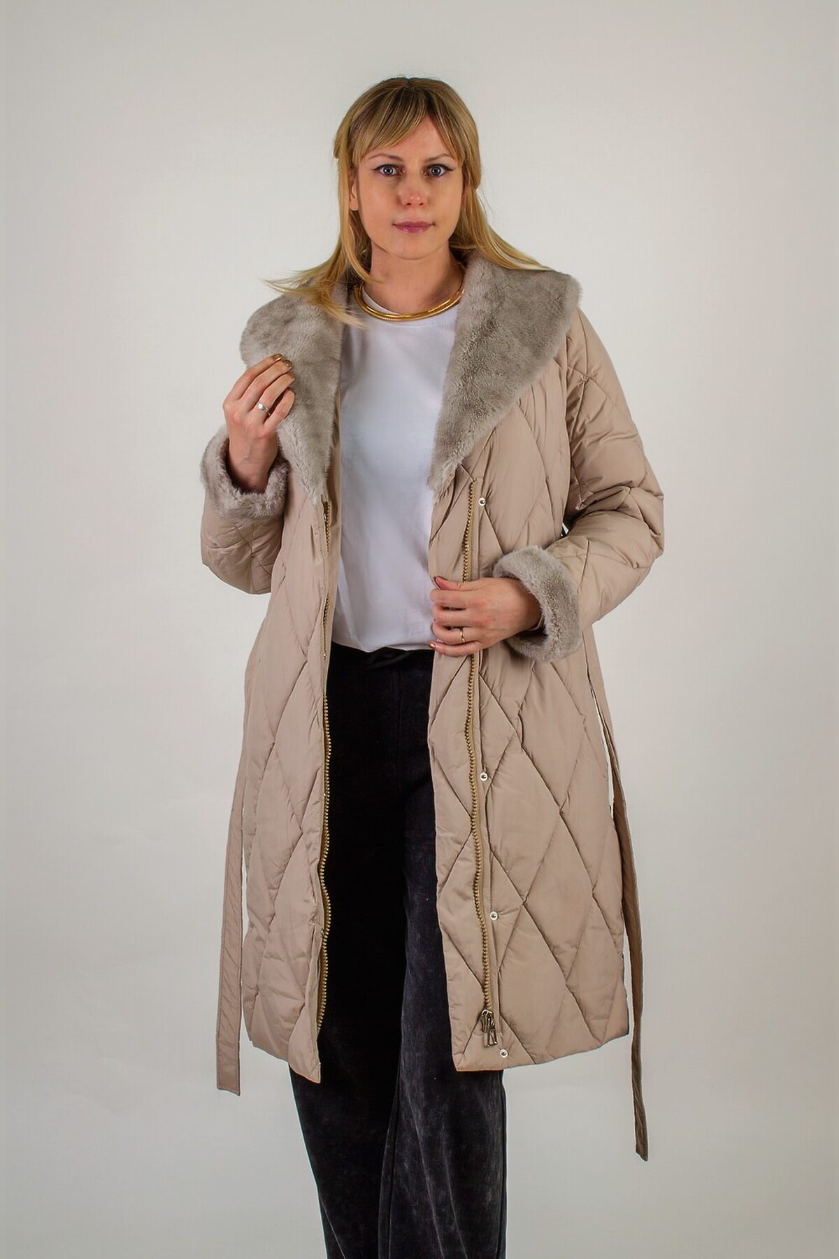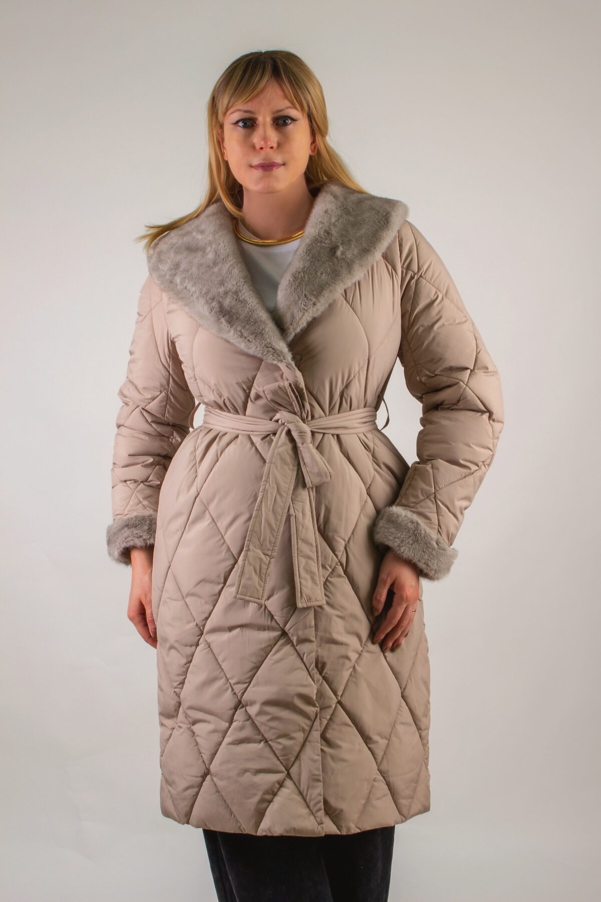 Стеганое пальто с меховой отделкой арт. 23153, евро-зима, демисезон. это сочетание утончённого городского стиля и продуманной функциональности. Модель с утеплителем оптимальной плотности, что позволяет комфортно чувствовать себя при температурах до 10С . Демисезонная адаптивность делает пальто универсальным решением для межсезонья, когда погода переменчива. Верх выполнен из износостойкого полиэстера с водоотталкивающей пропиткой, сохраняющей лёгкость и не дающей влаге скапливаться на поверхности. Диагональная стёжка ромбом равномерно распределяет наполнитель, предотвращая холодные зоны и деформацию изделия после стирок. Модель легко стирается в деликатном режиме, не теряя формы и цвета. Отложной воротник и отделка манжет декорированы искусственным мехом серого оттенка под норку, придающим акцент и уютный объём у лица и на рукавах. Такой приём не просто украшает изделие, но и защищает от ветра и холода. Трикотажные рукава на манжетах обеспечивают свободу движений и создают дополнительный тепловой барьер. Пальто застёгивается на двухзамковую молнию с защитной планкой на кнопках конструкция надёжна, удобна в эксплуатации и защищает от продувания. Акцентным дополнением служит съёмный пояс в тон, подчёркивающий линию талии и создающий изящный силуэт песочные часы. По бокам расположены два скрытых кармана-листочки с застёжками-кнопками, чтобы ценные мелочи и смартфон всегда были под рукой. Бежевый оттенок фасона универсален: он гармонирует с яркими и нейтральными образами, легко комбинируется с шарфами, шапками и обувью любого стиля. Это пальто станет вашим верным спутником в городе и на загородных прогулках, обеспечивая комфорт и безупречный внешний вид. Арт. 23153 выбор современных женщин, ценящих качество, тепло и элегантность в каждой детали.