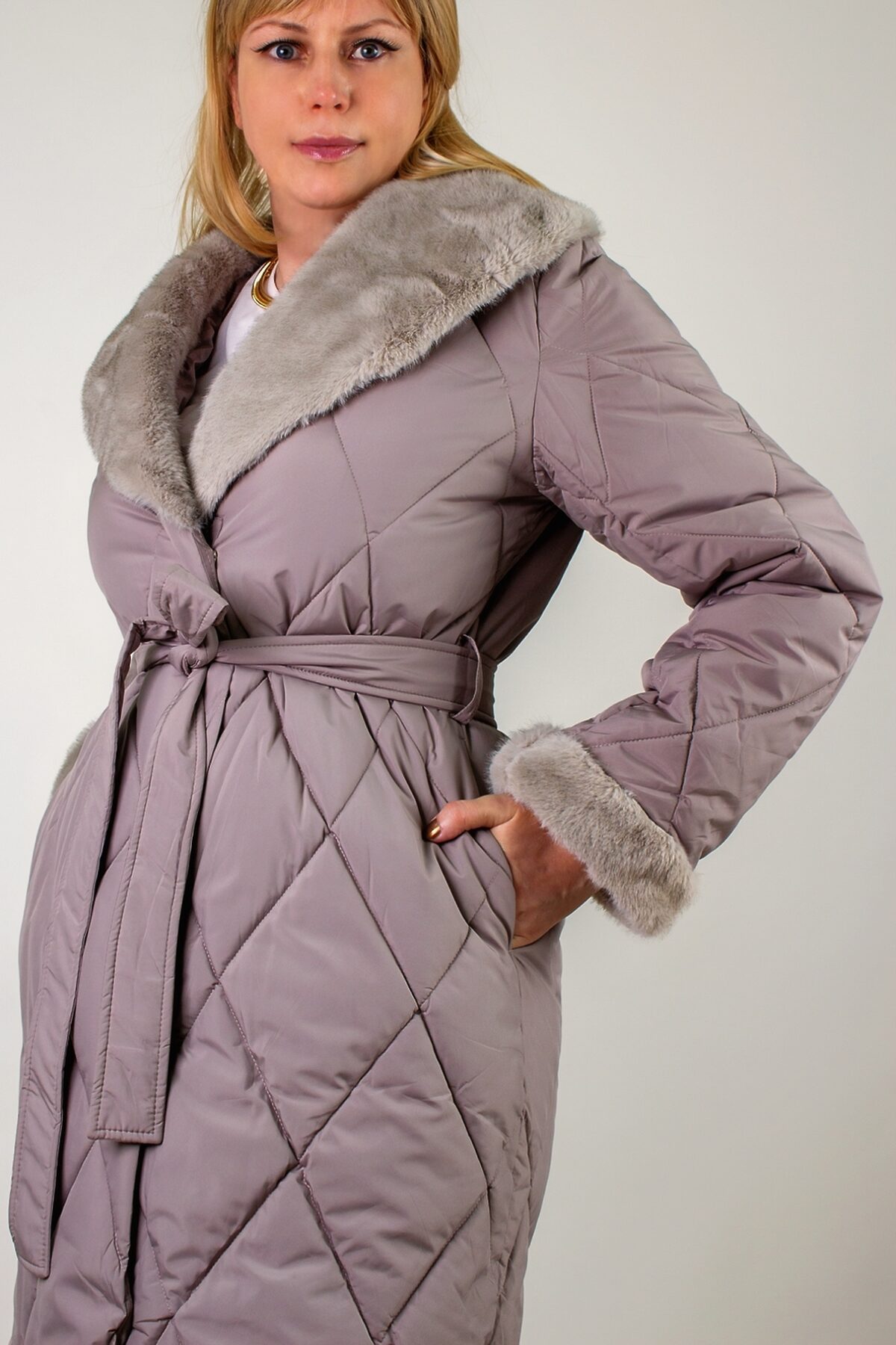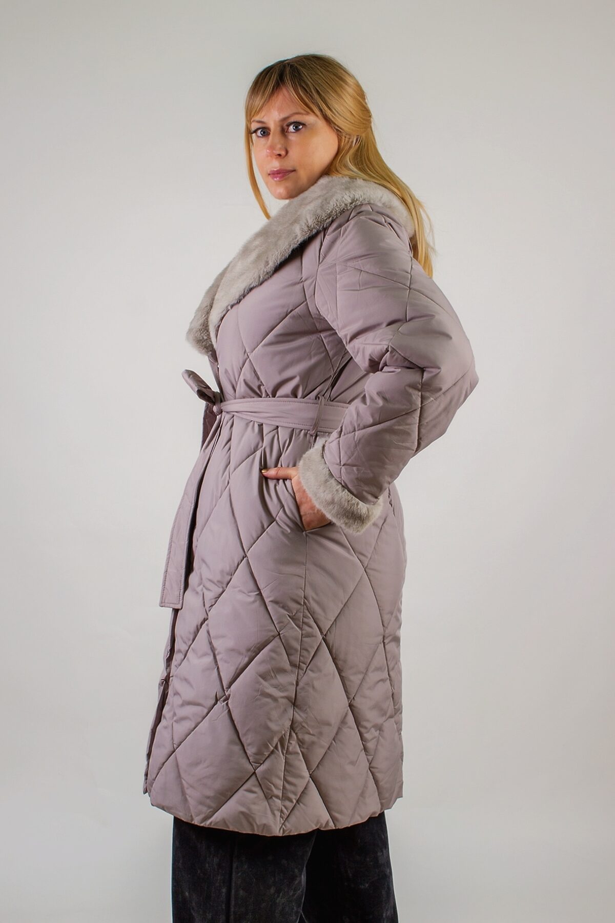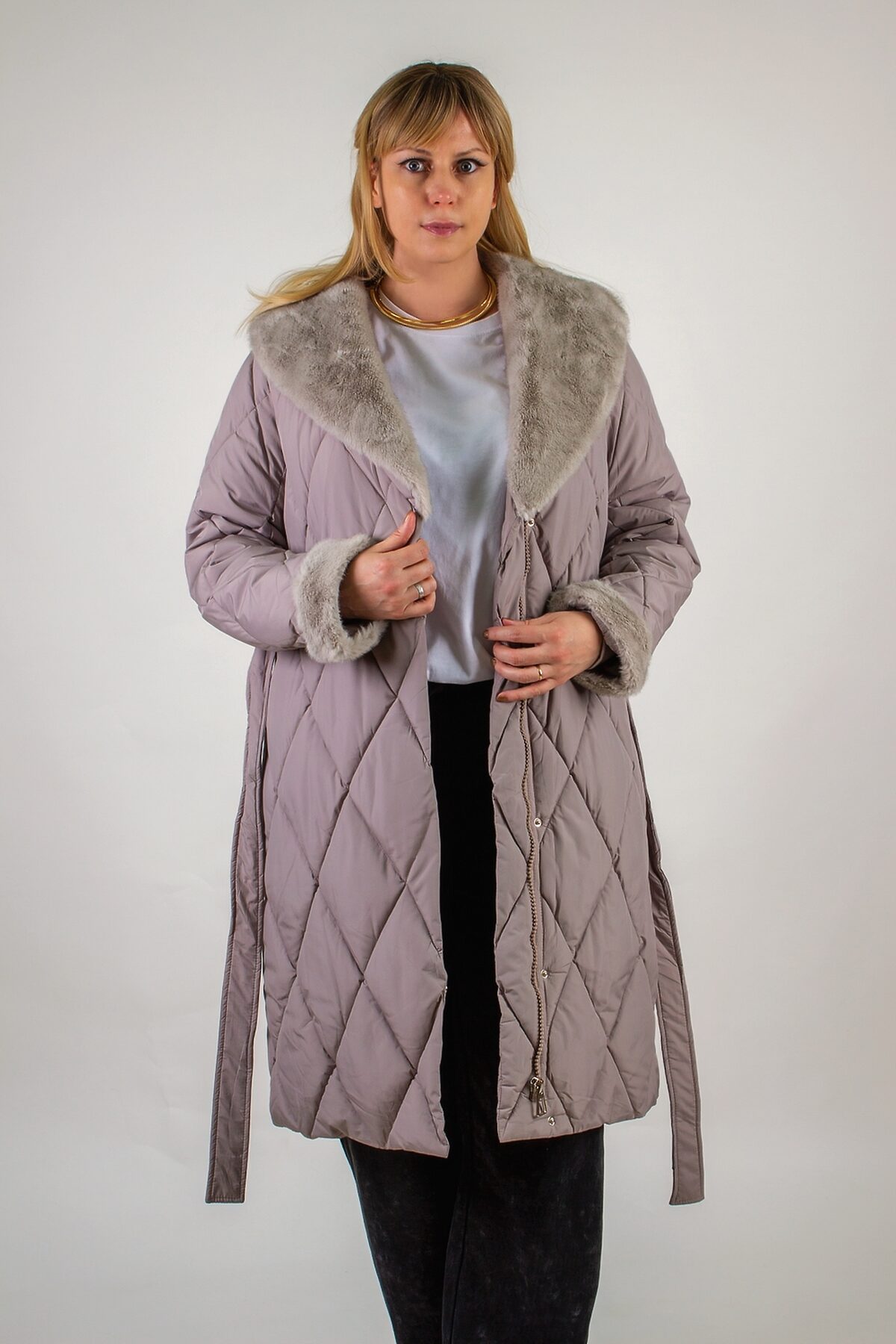 Стеганое пальто с меховой отделкой арт. 23153, евро-зима, демисезон. это сочетание утончённого городского стиля и продуманной функциональности. Модель с утеплителем оптимальной плотности, что позволяет комфортно чувствовать себя при температурах до 10С . Демисезонная адаптивность делает пальто универсальным решением для межсезонья, когда погода переменчива. Верх выполнен из износостойкого полиэстера с водоотталкивающей пропиткой, сохраняющей лёгкость и не дающей влаге скапливаться на поверхности. Диагональная стёжка ромбом равномерно распределяет наполнитель, предотвращая холодные зоны и деформацию изделия после стирок. Модель легко стирается в деликатном режиме, не теряя формы и цвета. Отложной воротник и отделка манжет декорированы искусственным мехом серого оттенка под норку, придающим акцент и уютный объём у лица и на рукавах. Такой приём не просто украшает изделие, но и защищает от ветра и холода. Трикотажные рукава на манжетах обеспечивают свободу движений и создают дополнительный тепловой барьер. Пальто застёгивается на двухзамковую молнию с защитной планкой на кнопках конструкция надёжна, удобна в эксплуатации и защищает от продувания. Акцентным дополнением служит съёмный пояс в тон, подчёркивающий линию талии и создающий изящный силуэт песочные часы. По бокам расположены два скрытых кармана-листочки с застёжками-кнопками, чтобы ценные мелочи и смартфон всегда были под рукой. Бежевый оттенок фасона универсален: он гармонирует с яркими и нейтральными образами, легко комбинируется с шарфами, шапками и обувью любого стиля. Это пальто станет вашим верным спутником в городе и на загородных прогулках, обеспечивая комфорт и безупречный внешний вид. Арт. 23153 выбор современных женщин, ценящих качество, тепло и элегантность в каждой детали.