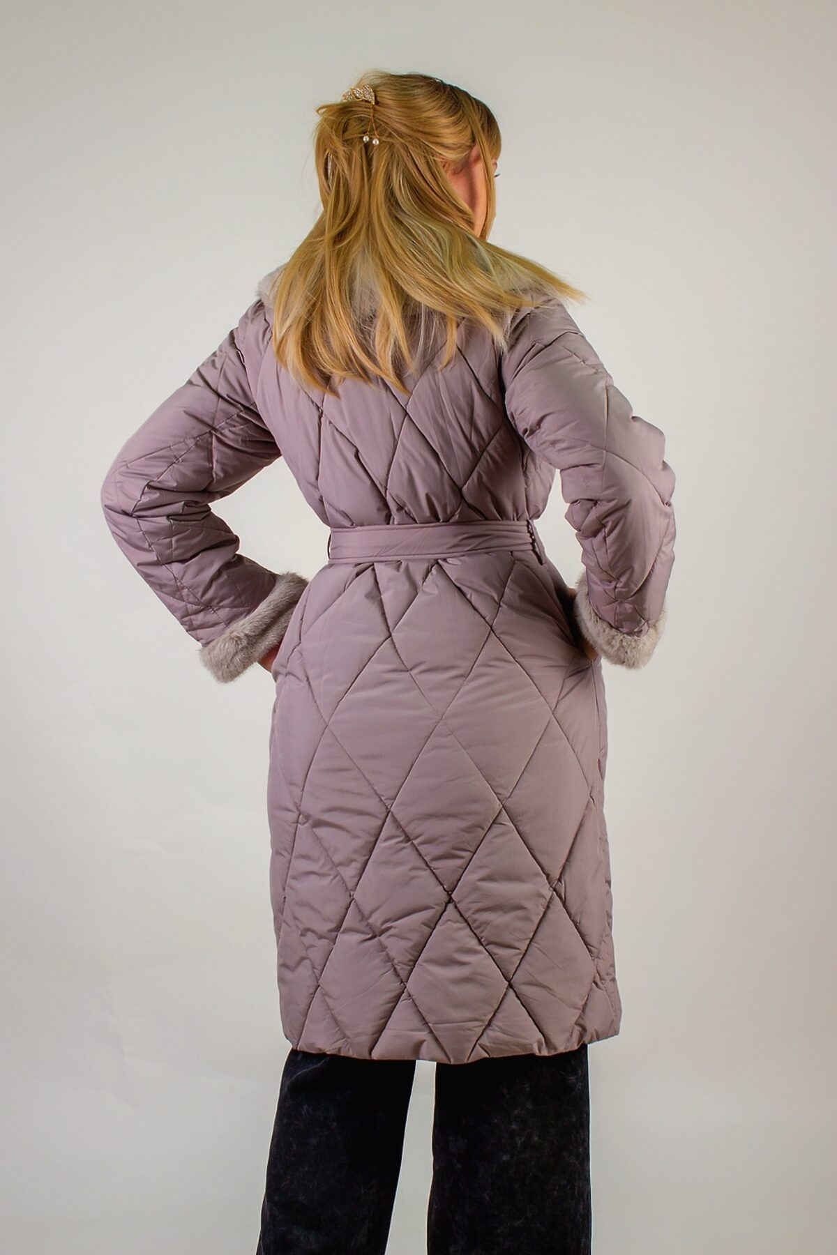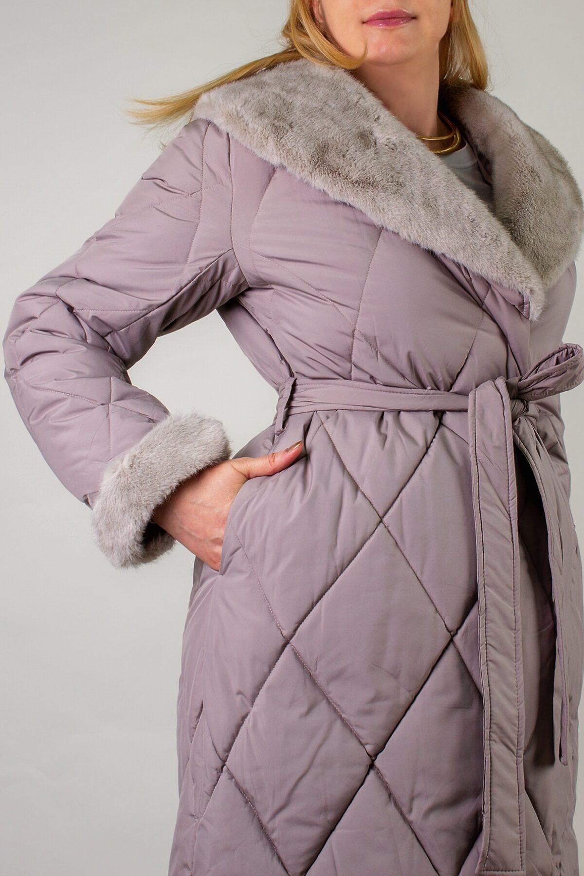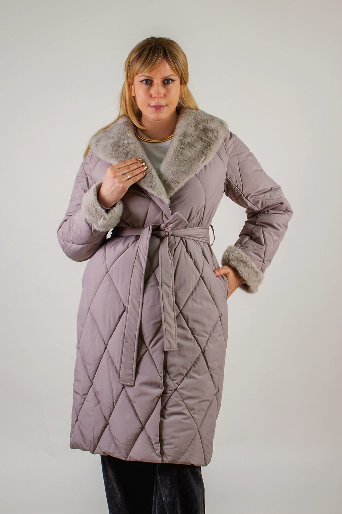 Стеганое пальто с меховой отделкой арт. 23153, евро-зима, демисезон. это сочетание утончённого городского стиля и продуманной функциональности. Модель с утеплителем оптимальной плотности, что позволяет комфортно чувствовать себя при температурах до 10С . Демисезонная адаптивность делает пальто универсальным решением для межсезонья, когда погода переменчива. Верх выполнен из износостойкого полиэстера с водоотталкивающей пропиткой, сохраняющей лёгкость и не дающей влаге скапливаться на поверхности. Диагональная стёжка ромбом равномерно распределяет наполнитель, предотвращая холодные зоны и деформацию изделия после стирок. Модель легко стирается в деликатном режиме, не теряя формы и цвета. Отложной воротник и отделка манжет декорированы искусственным мехом серого оттенка под норку, придающим акцент и уютный объём у лица и на рукавах. Такой приём не просто украшает изделие, но и защищает от ветра и холода. Трикотажные рукава на манжетах обеспечивают свободу движений и создают дополнительный тепловой барьер. Пальто застёгивается на двухзамковую молнию с защитной планкой на кнопках конструкция надёжна, удобна в эксплуатации и защищает от продувания. Акцентным дополнением служит съёмный пояс в тон, подчёркивающий линию талии и создающий изящный силуэт песочные часы. По бокам расположены два скрытых кармана-листочки с застёжками-кнопками, чтобы ценные мелочи и смартфон всегда были под рукой. Бежевый оттенок фасона универсален: он гармонирует с яркими и нейтральными образами, легко комбинируется с шарфами, шапками и обувью любого стиля. Это пальто станет вашим верным спутником в городе и на загородных прогулках, обеспечивая комфорт и безупречный внешний вид. Арт. 23153 выбор современных женщин, ценящих качество, тепло и элегантность в каждой детали.