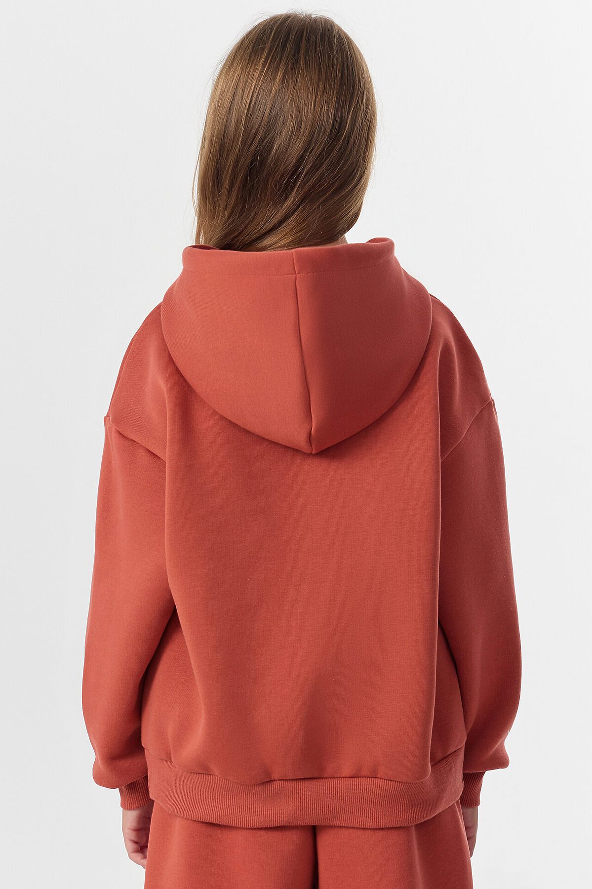 Анорак свободного силуэта, оверсайз. Плечо приспущено. Горловина округлой формы с капюшоном. Капюшон со средним швом и подкладкой из трикотажного кулирного полотна. Рукав свободный, длинный с отрезной манжетой из трикотажного полотна рибаны 2*2. В боковых швах, смещенных в сторону переда, обработаны карманы. По нижнему срезу притачной пояс из трикотажного полотна рибаны.