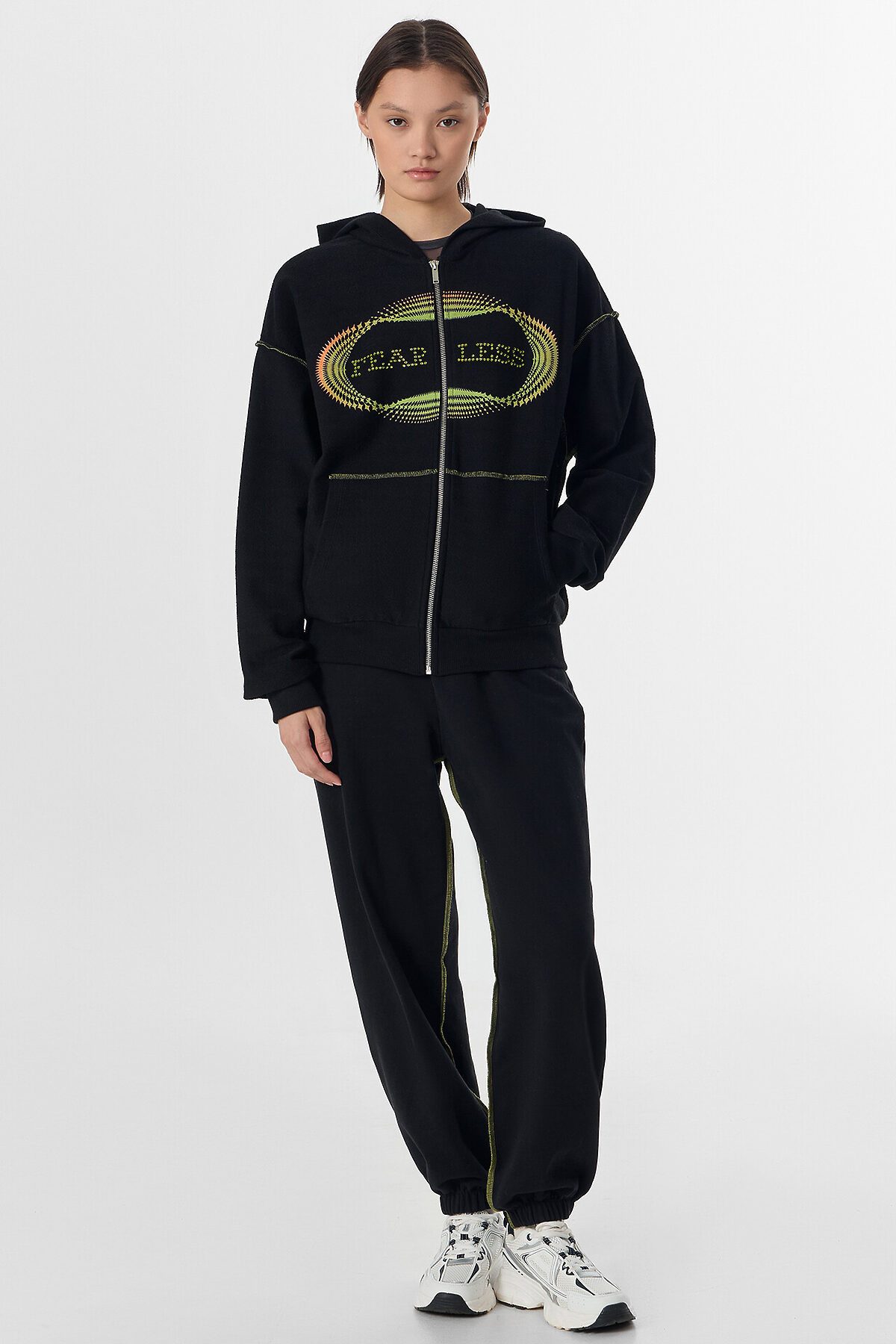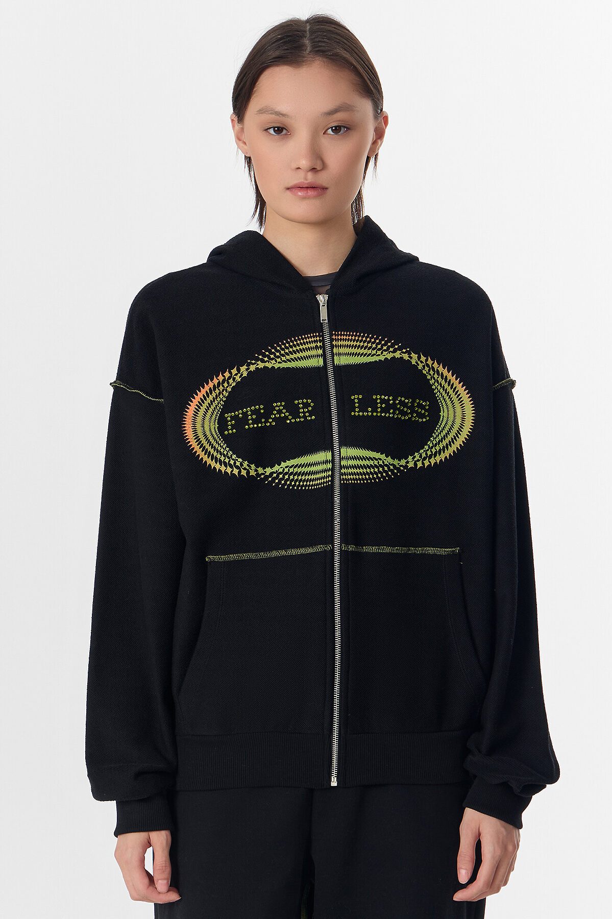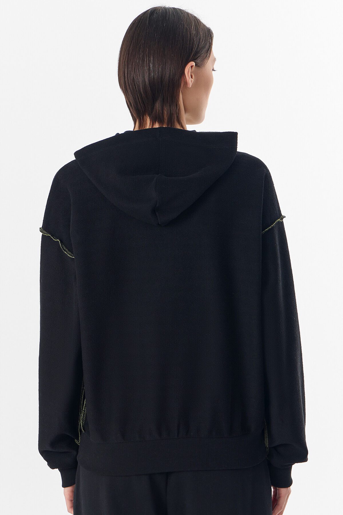Толстовка женская свободного силуэта. Перед и спинка цельнокроеные. Рукав втачной, длинный, спущенный. По низу изделия и рукавов пояс и манжеты из рибаны. Толстовка с капюшоном и центральной застежкой с молнией (OpenEnd Standart Metal №5, 5,9мм). По центру изделия накладные карманы. Толстовка двусторонняя, боковые швы, швы рукавов и кармана вывернуты наружу.