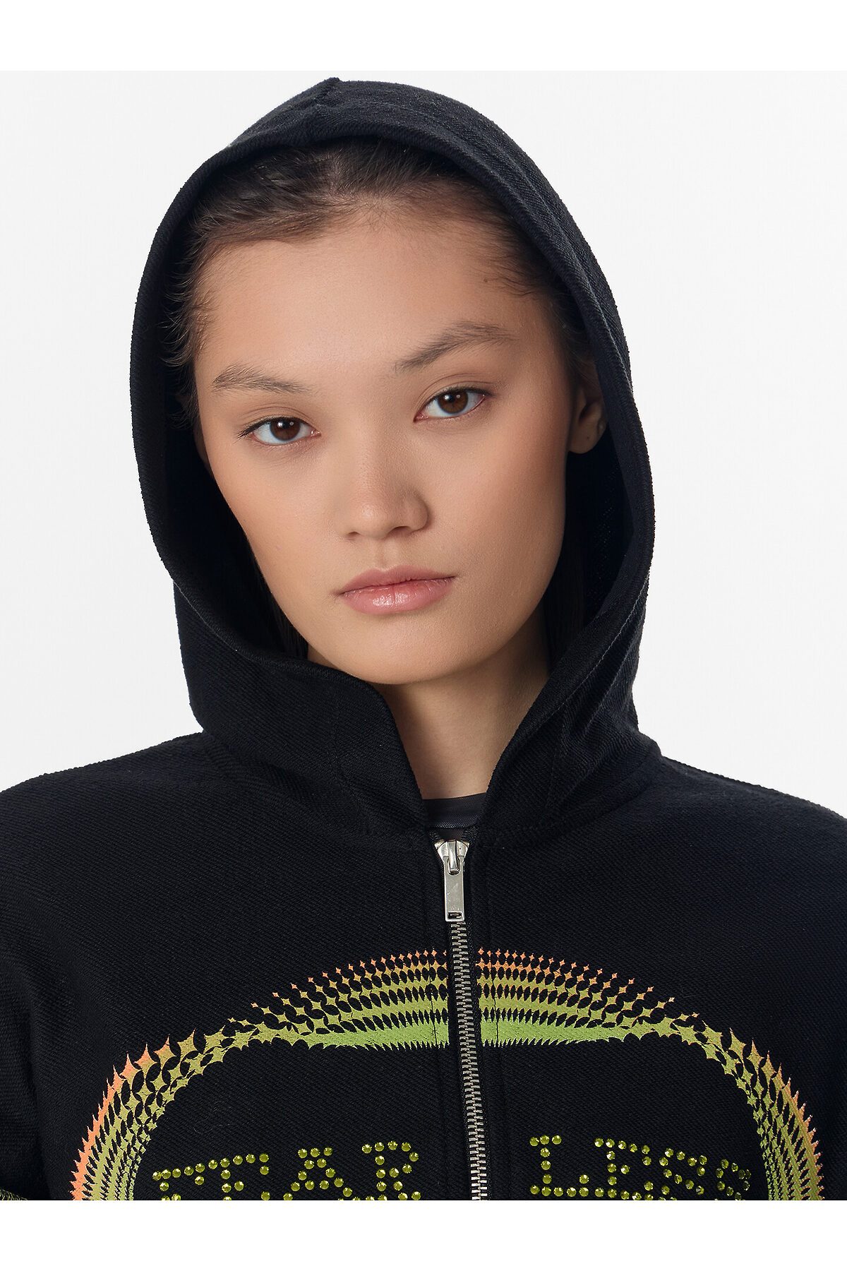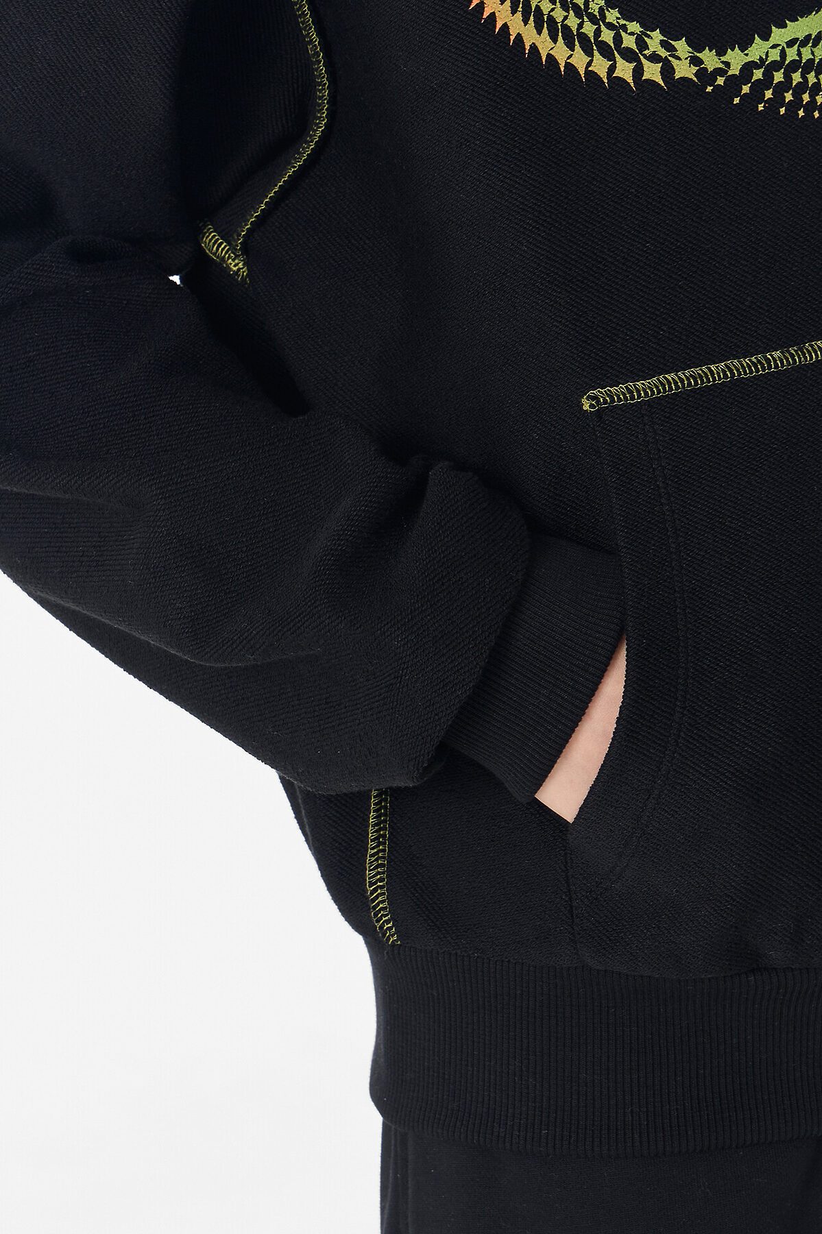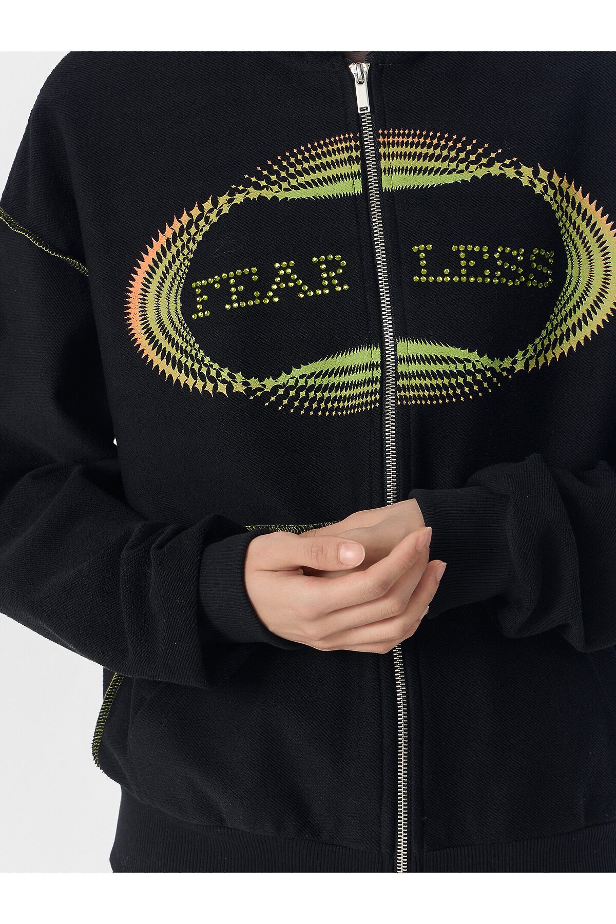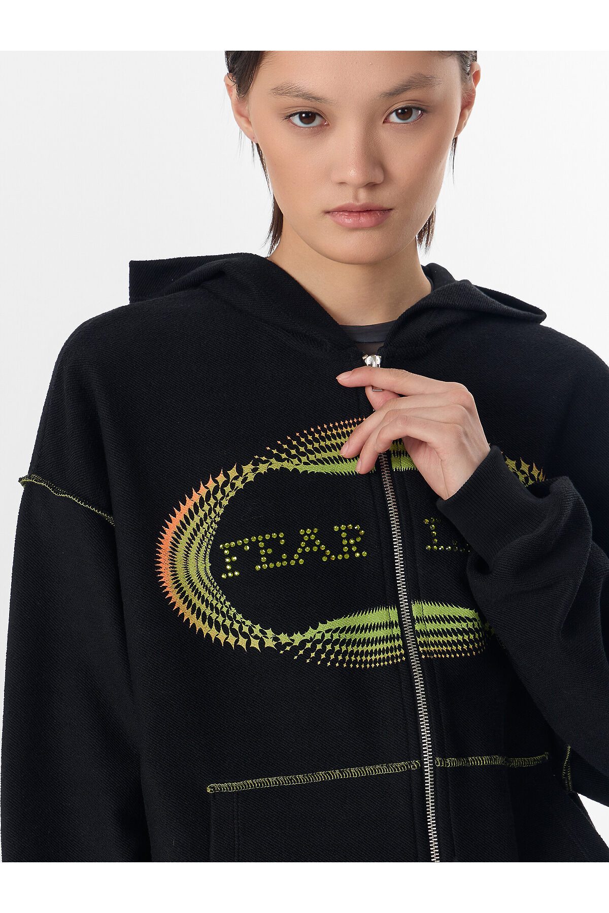 Толстовка женская свободного силуэта. Перед и спинка цельнокроеные. Рукав втачной, длинный, спущенный. По низу изделия и рукавов пояс и манжеты из рибаны. Толстовка с капюшоном и центральной застежкой с молнией (OpenEnd Standart Metal №5, 5,9мм). По центру изделия накладные карманы. Толстовка двусторонняя, боковые швы, швы рукавов и кармана вывернуты наружу.