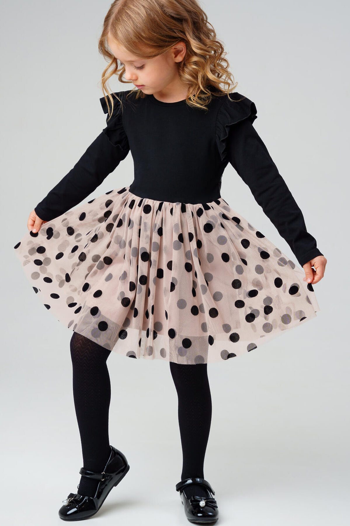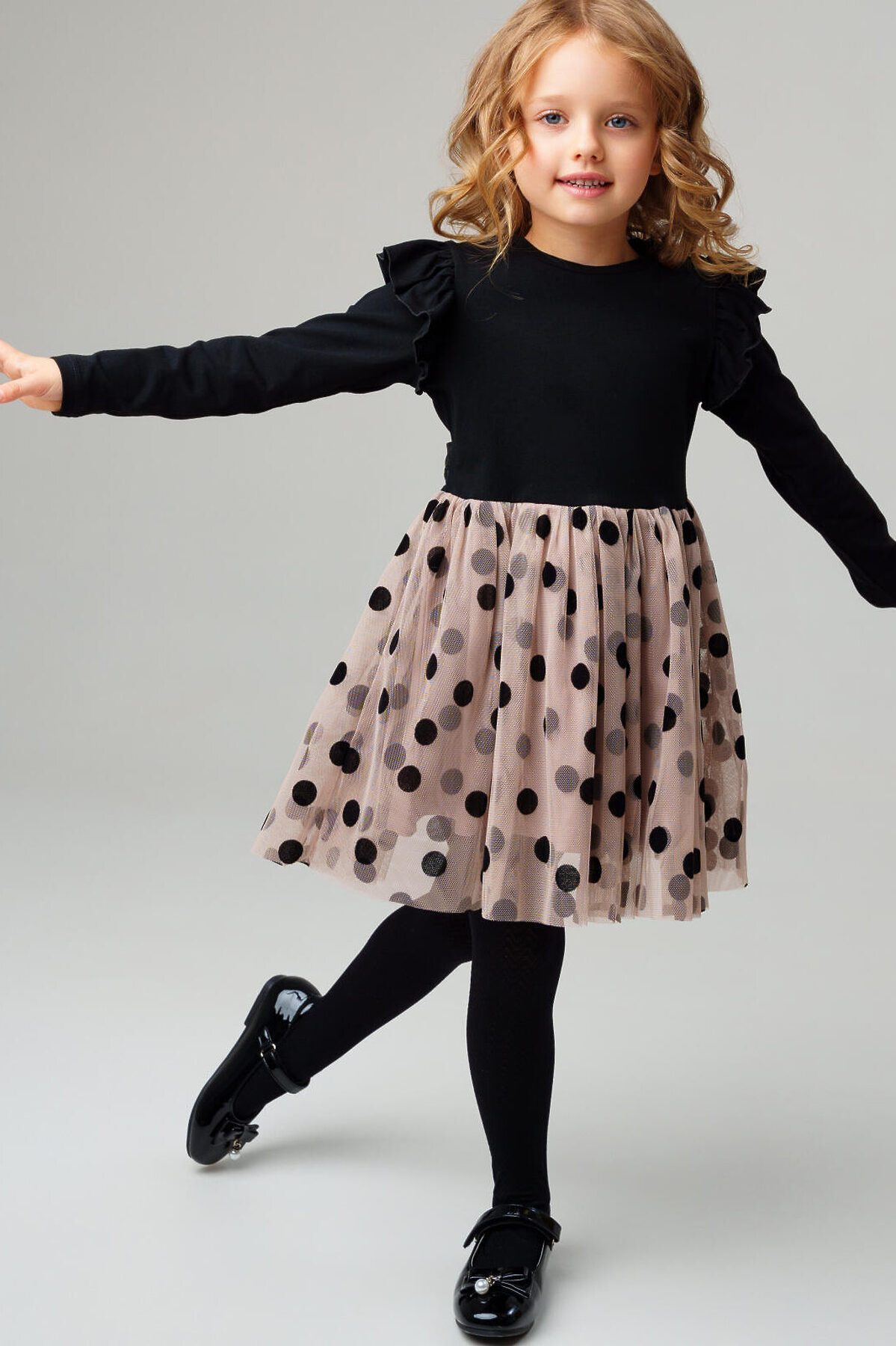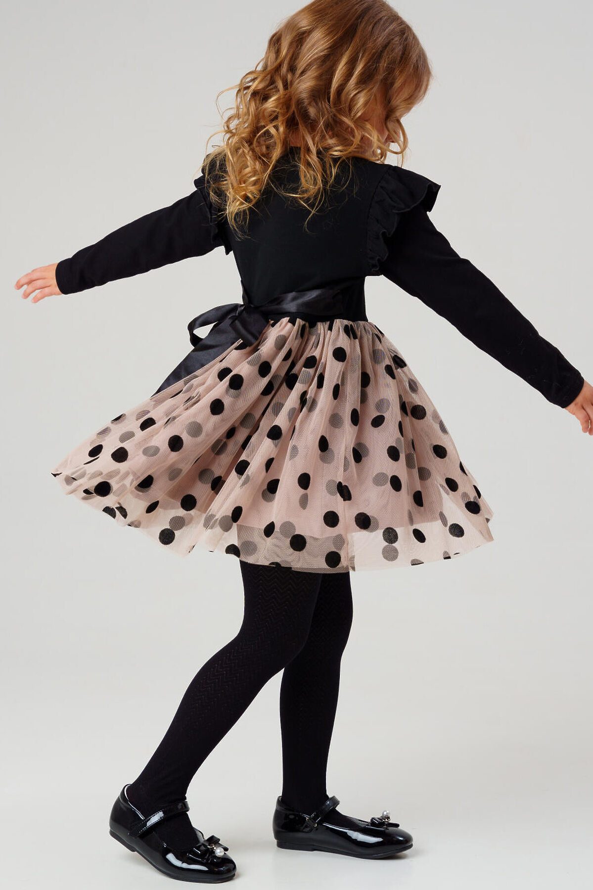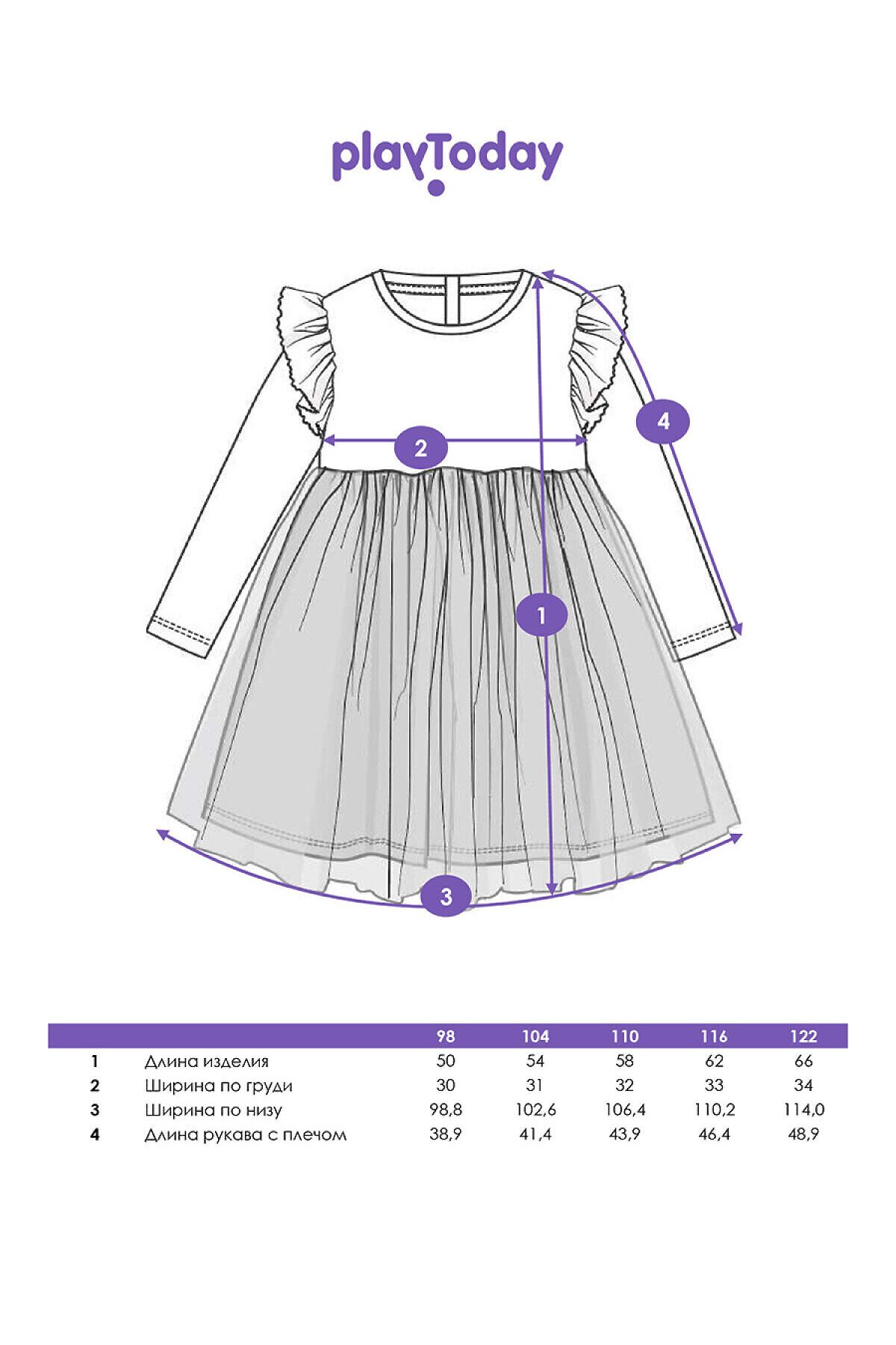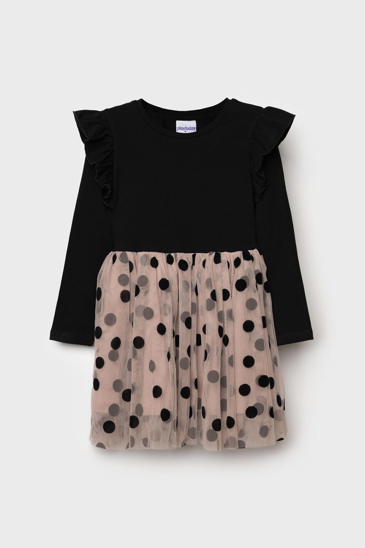 Трикотажное платье для девочки с пышной юбкой из фатина от PlayToday — нежность и стиль в одном образе. Преимущества модели: + мягкий трикотаж — комфортен к телу, не стесняет движений + юбка из сетки с декором — эффектная и воздушная, придаёт образу праздничность + классическая посадка — хорошо сидит по фигуре + пояс с бантом сзади — стильный акцент и удобная фиксация + идеально подходит как платье для девочки на праздник, так и для детского сада или дня рождения Это платье создано для тех, кто хочет выглядеть нарядно каждый день. Удобный трикотажный верх сочетается с воздушной юбкой из сетки с бархатными горошинами. Такой образ подойдёт и для праздника, и для повседневной сказки. Когда и как носить: Платье подойдёт для утренников, фотосессий, семейных мероприятий, похода в гости или театра. Также отлично смотрится как наряд на каждый день — лёгкий, удобный и очень красивый. Советы по стилю: Сочетайте с балетками, колготками и ободком — и получите завершённый праздничный образ. В прохладную погоду добавьте кардиган или жакет. Модель рассчитана на девочек от 3 до 7 лет.