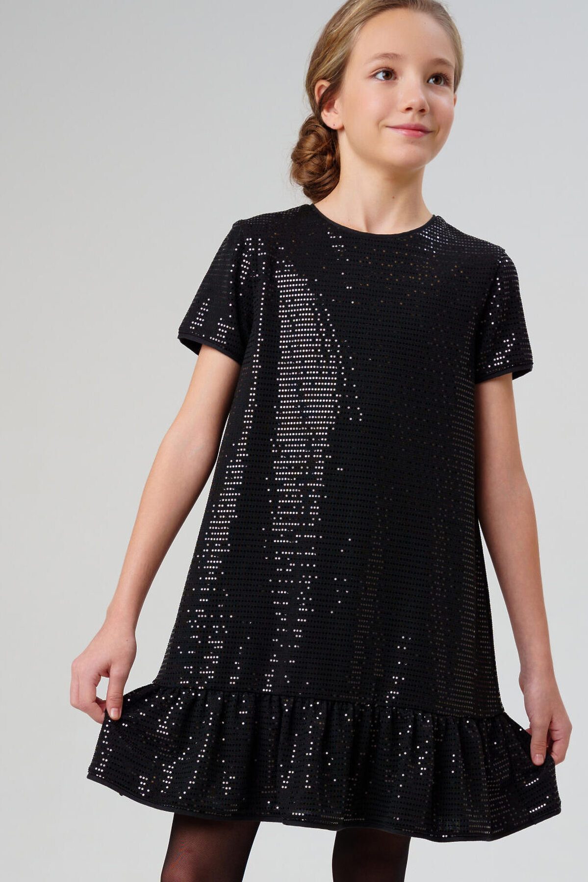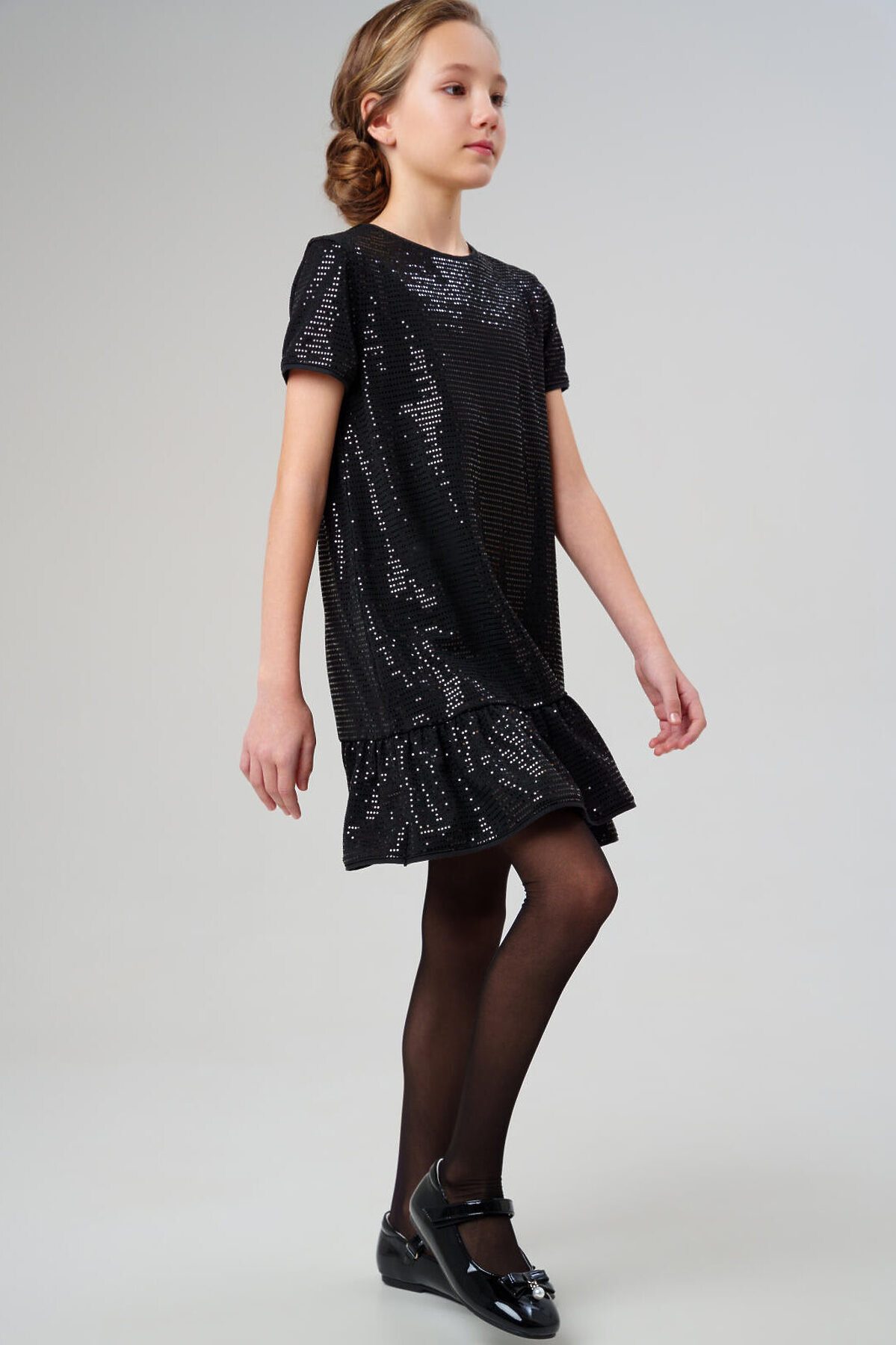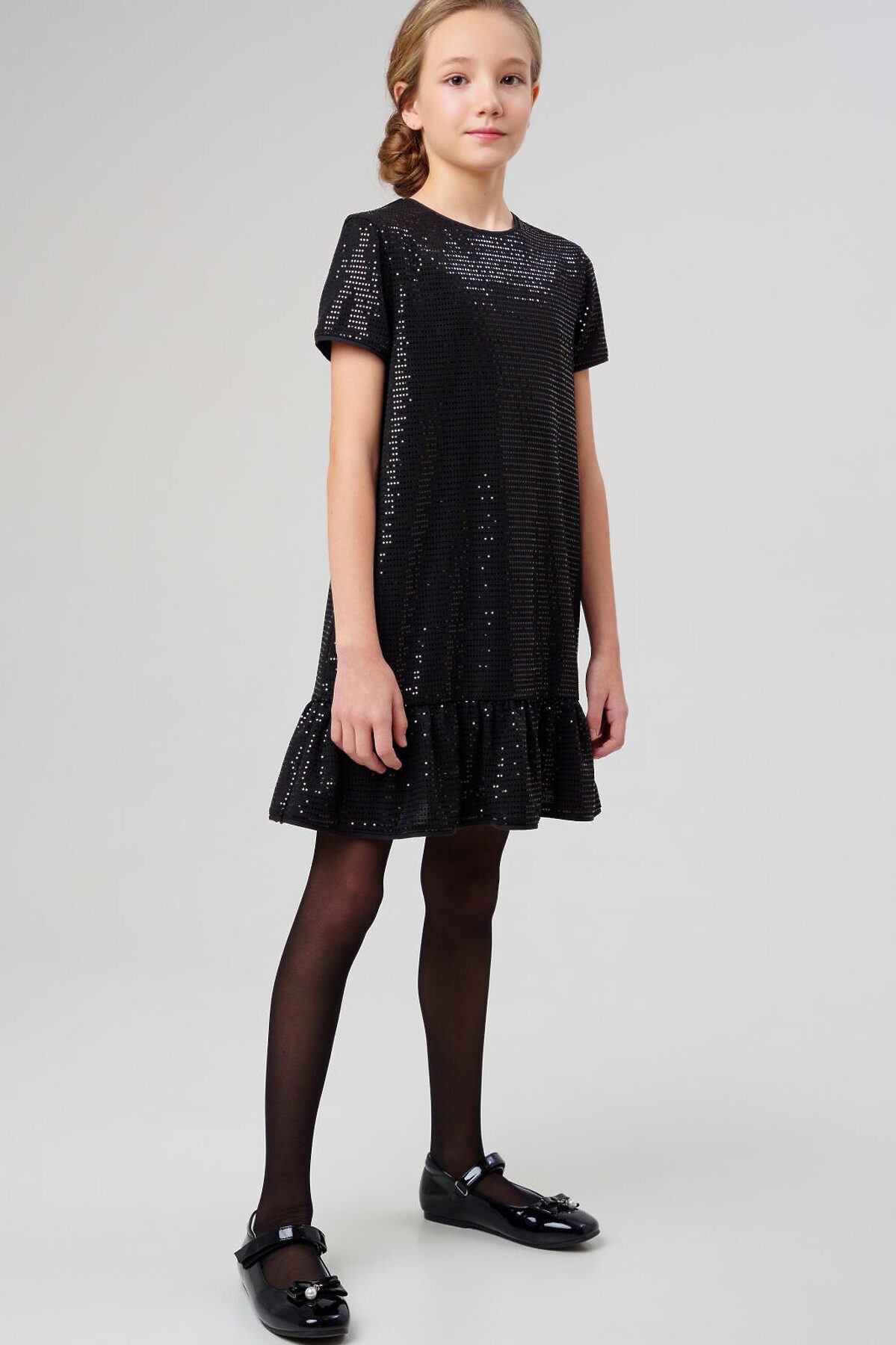 Модное чёрное платье для девочки от PlayToday — стильная модель для праздников и особых случаев. Платье выполнено из мягкого трикотажа с мерцающими пайетками, которые создают эффектное сияние при движении. Укороченный рукав и волан по низу добавляют лёгкости и женственности силуэту. Преимущества модели: + нарядное платье с пайетками — блестящий акцент для праздничного образа + мягкая трикотажная ткань с эластаном — комфорт и свобода движений + внутренняя подкладка из хлопка и полиэстера — приятна к телу и не вызывает дискомфорта + волан по низу — трендовая деталь, создающая лёгкий и игривый силуэт + застёжка на пуговицу на спинке — удобно надевать и снимать Когда и как носить: Идеально подойдёт для Нового года, дня рождения, школьного праздника, фотосессии или театра. Платье универсальное — уместно и на торжестве, и в повседневных выходных образах. Советы по стилю: Сочетайте с туфлями, балетками или лаконичными ботинками от PlayToday. Для прохладной погоды добавьте плотные колготки и укороченный жакет или кожаную куртку. Размерный ряд: 128–170 см — подойдёт девочкам младшего и старшего школьного возраста. Праздничное платье PlayToday — блеск, комфорт и настроение праздника в каждом движении.