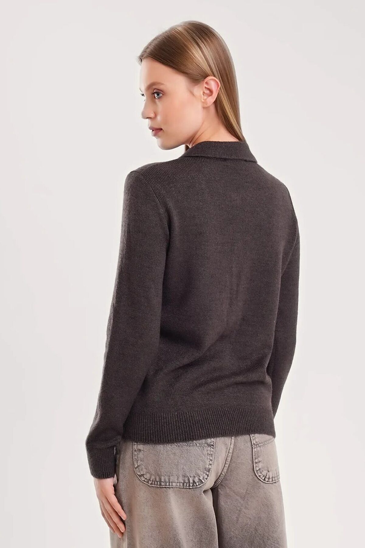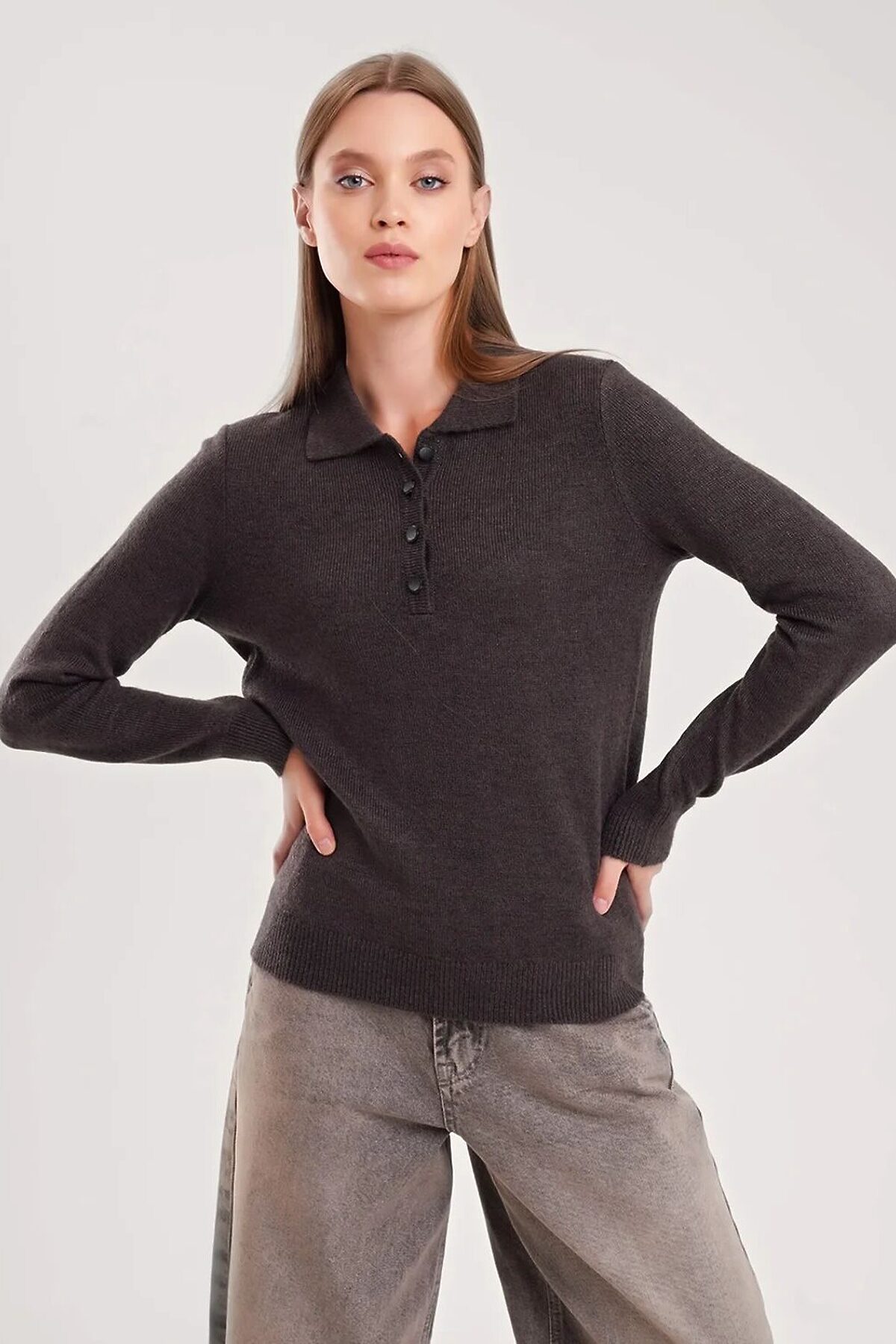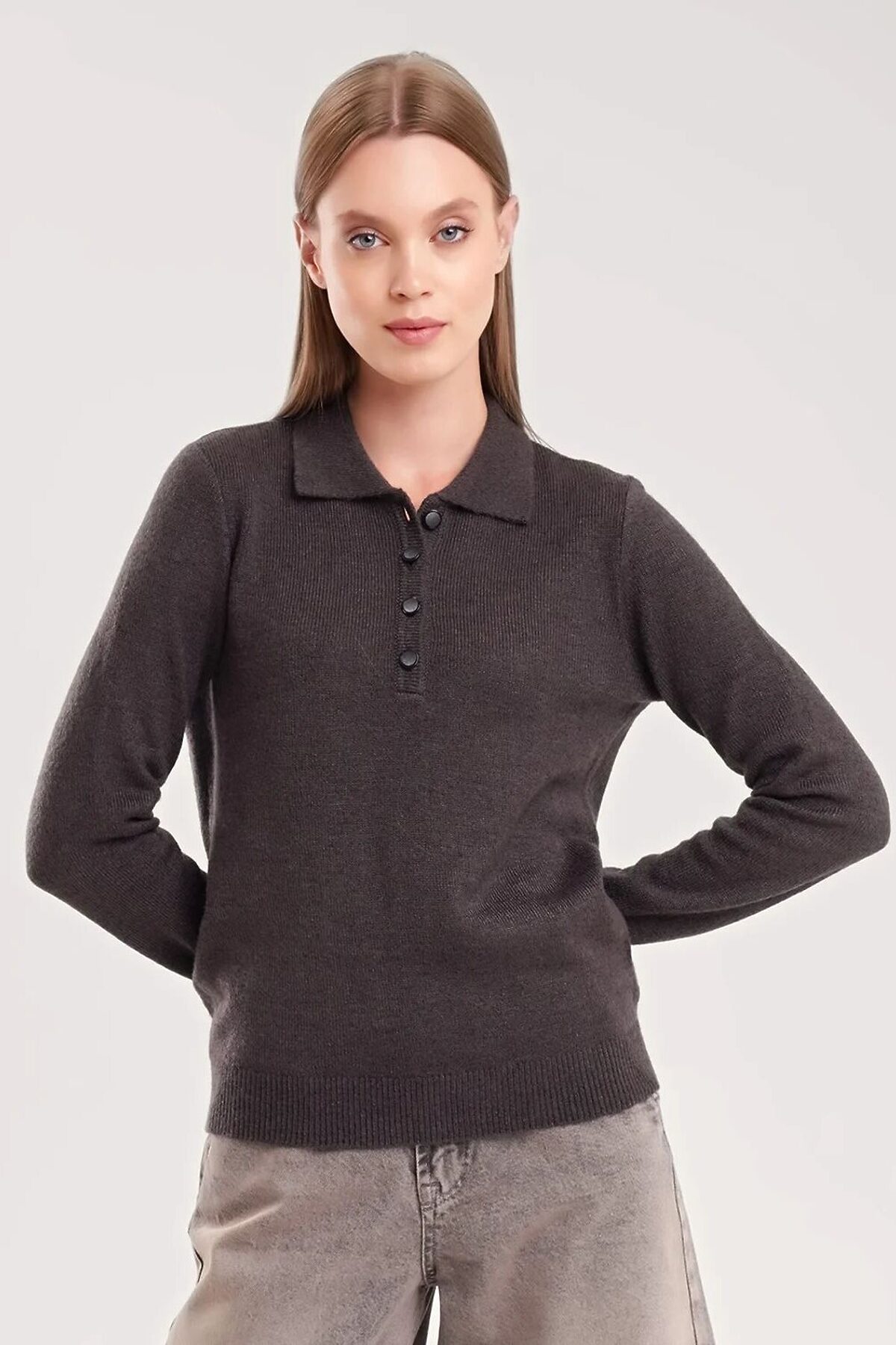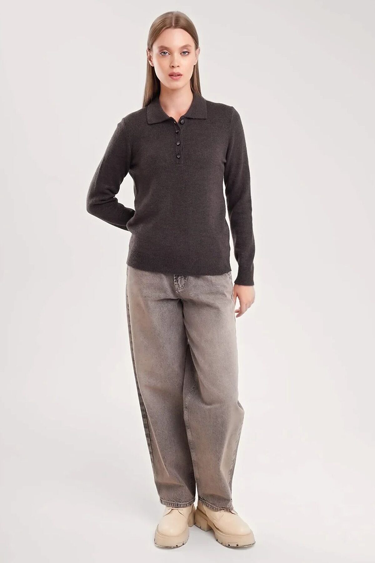 Вязаный джемпер умеренного объема из акриловой пряжи с добавлением шерсти, переплетение гладь. Втачной длинный рукав, по горловине отложной воротник с функциональной планкой и пуговицами. По низу изделия и рукавов манжеты.