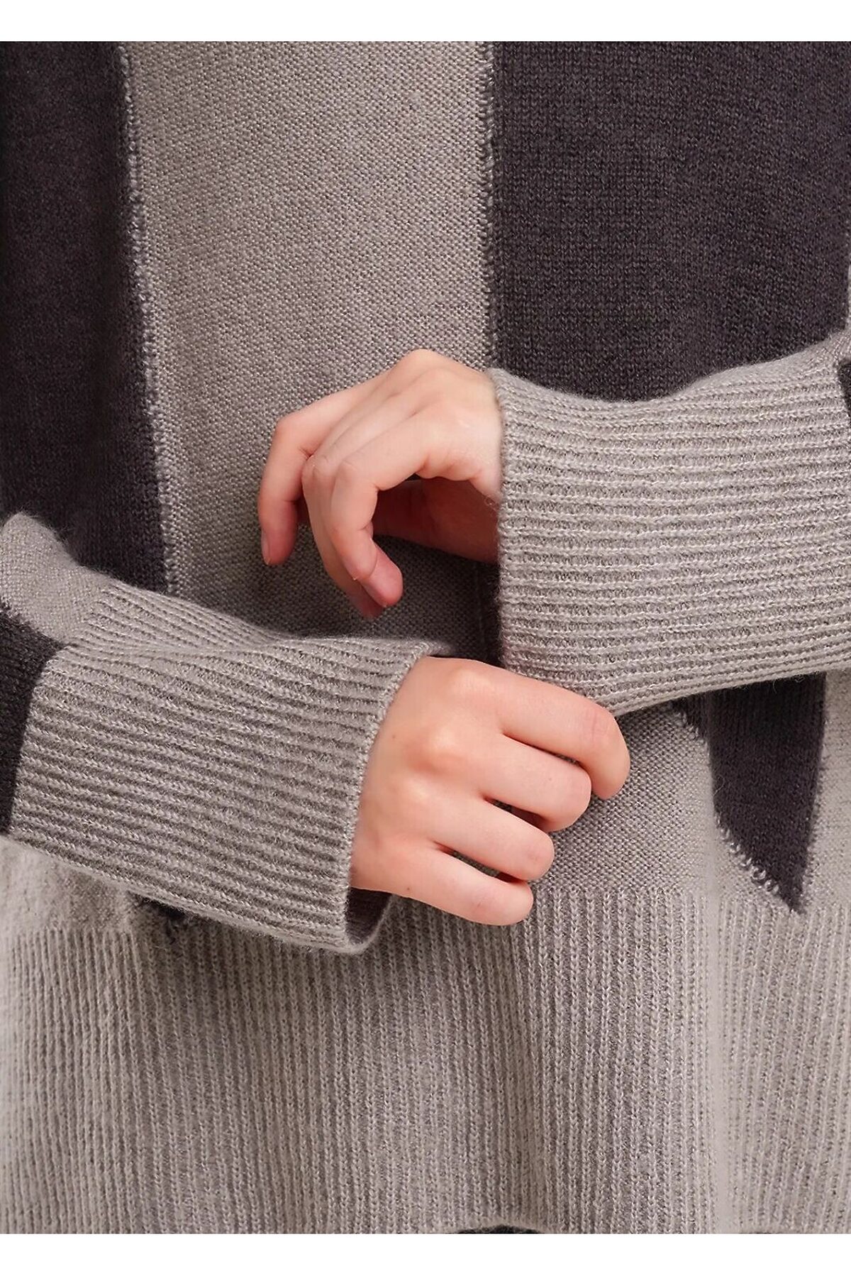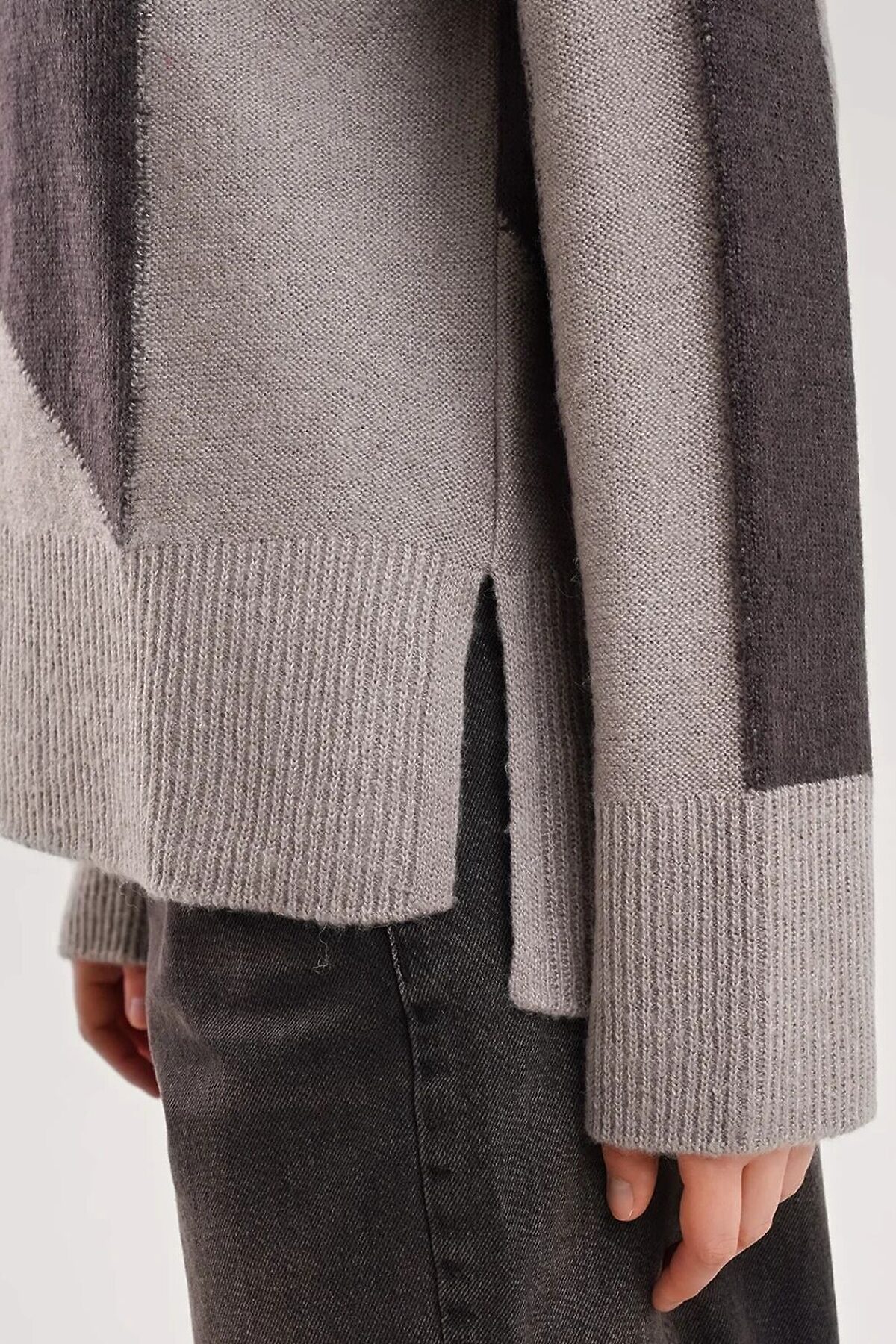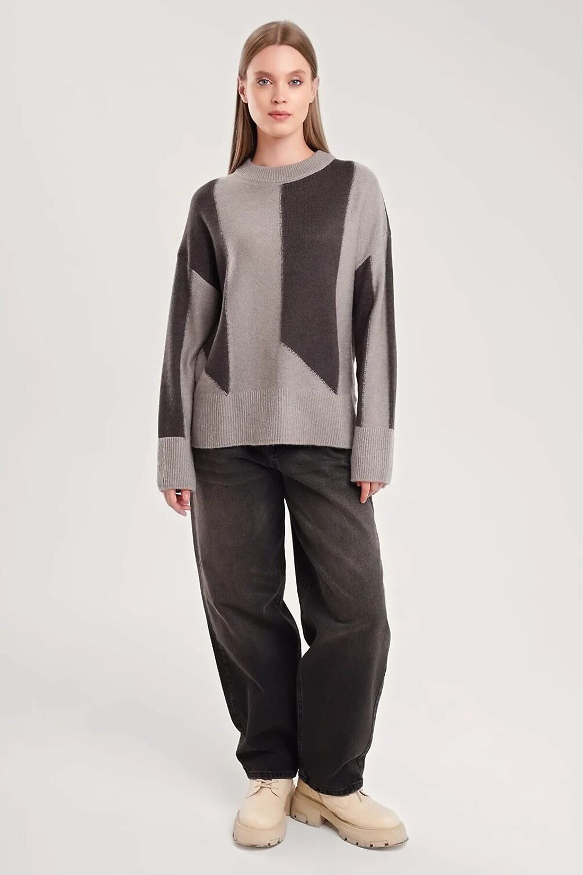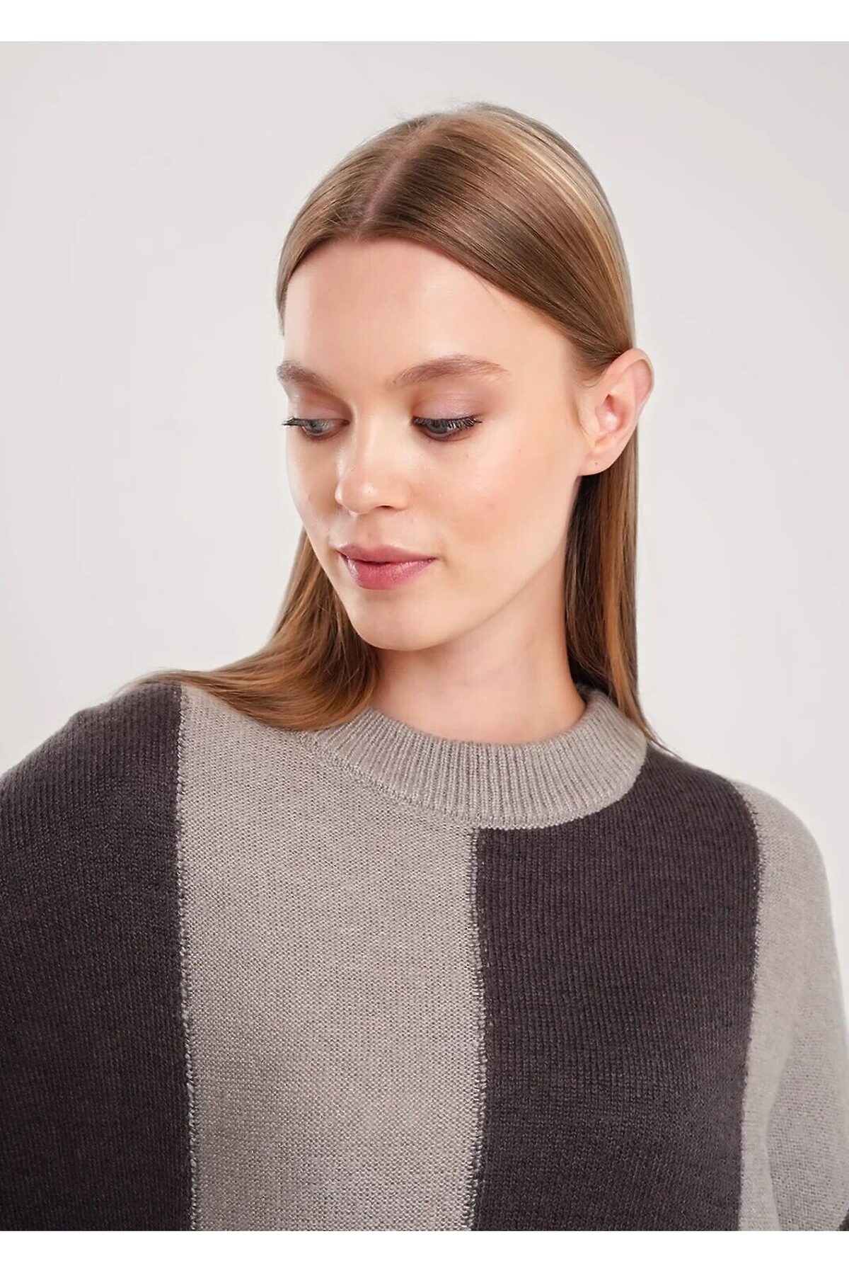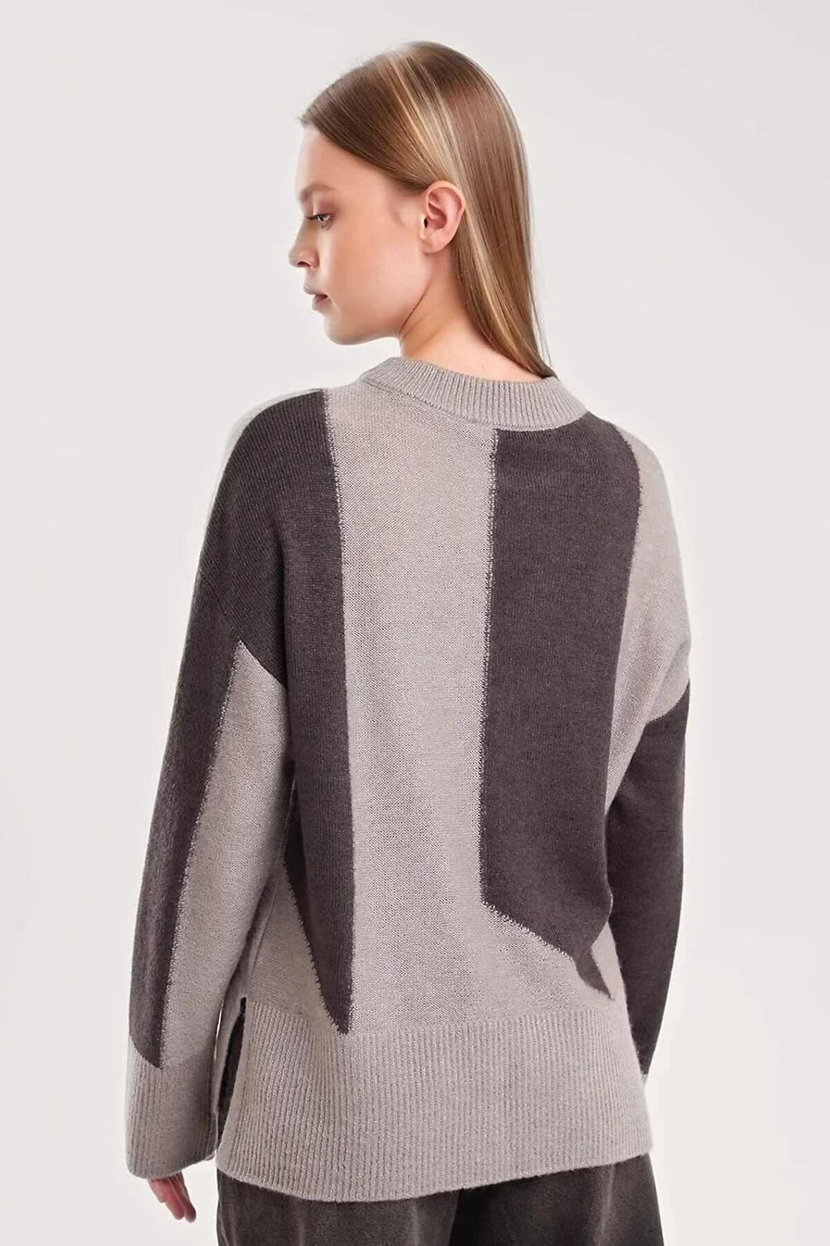 Вязаный джемпер умеренного объема из акриловой пряжи с добавлением шерсти, переплетение гладь (изнаночные петли). Спущенный длинный рукав, округлая горловина с бейкой. По низу изделия и рукавов широкие манжеты. По бокам разрезы.