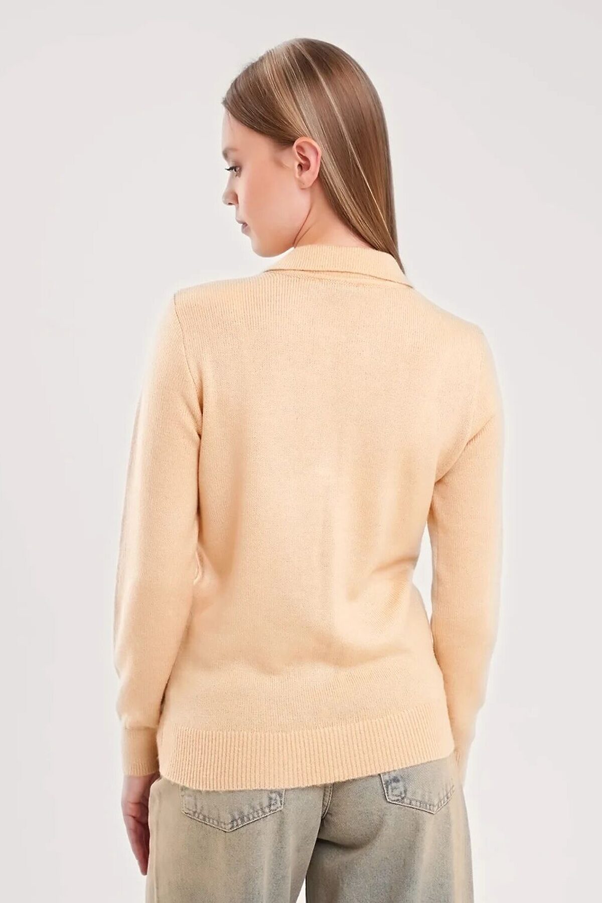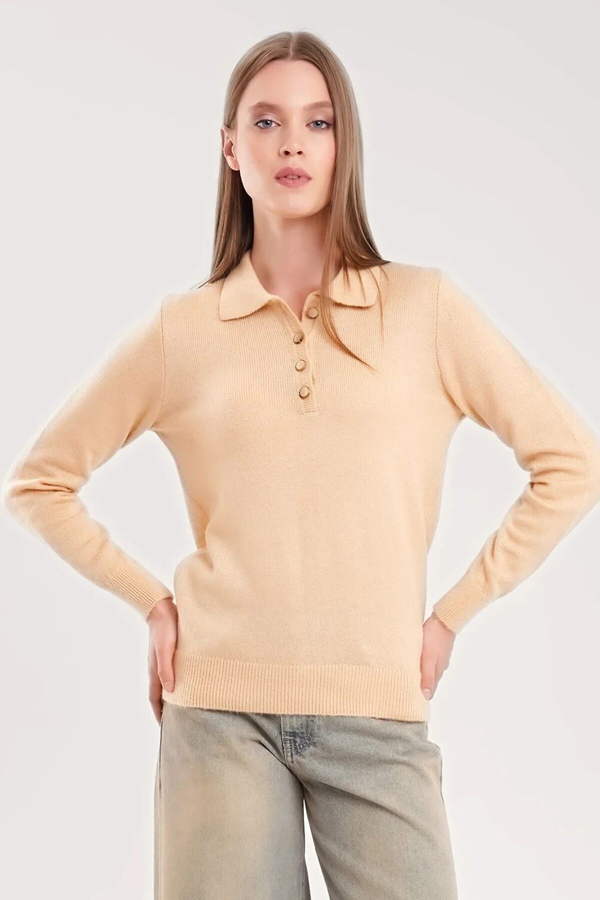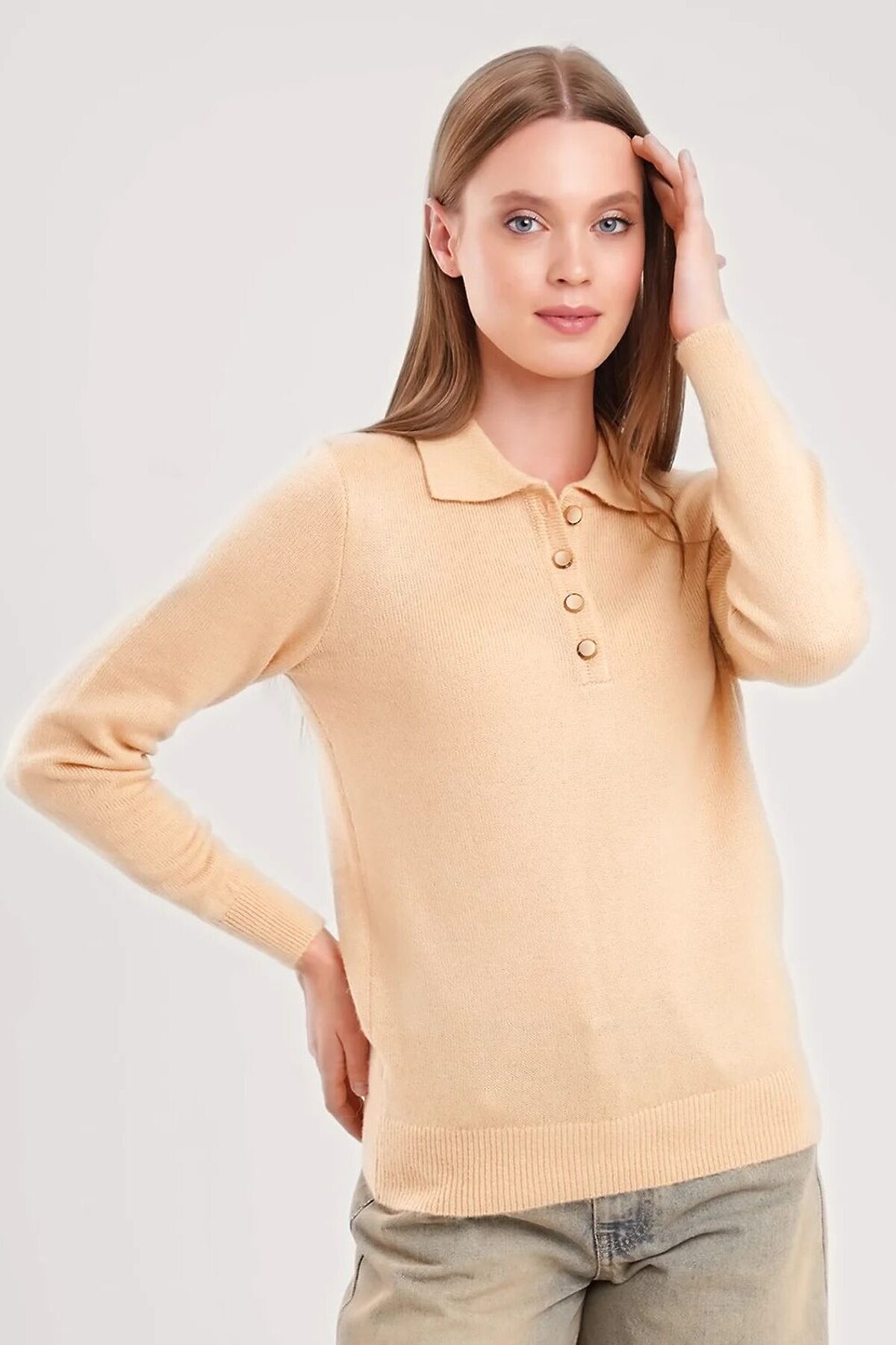 Вязаный джемпер умеренного объема из акриловой пряжи с добавлением шерсти, переплетение гладь. Втачной длинный рукав, по горловине отложной воротник с функциональной планкой и пуговицами. По низу изделия и рукавов манжеты.