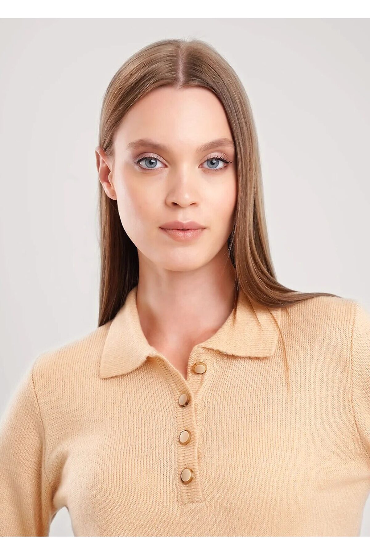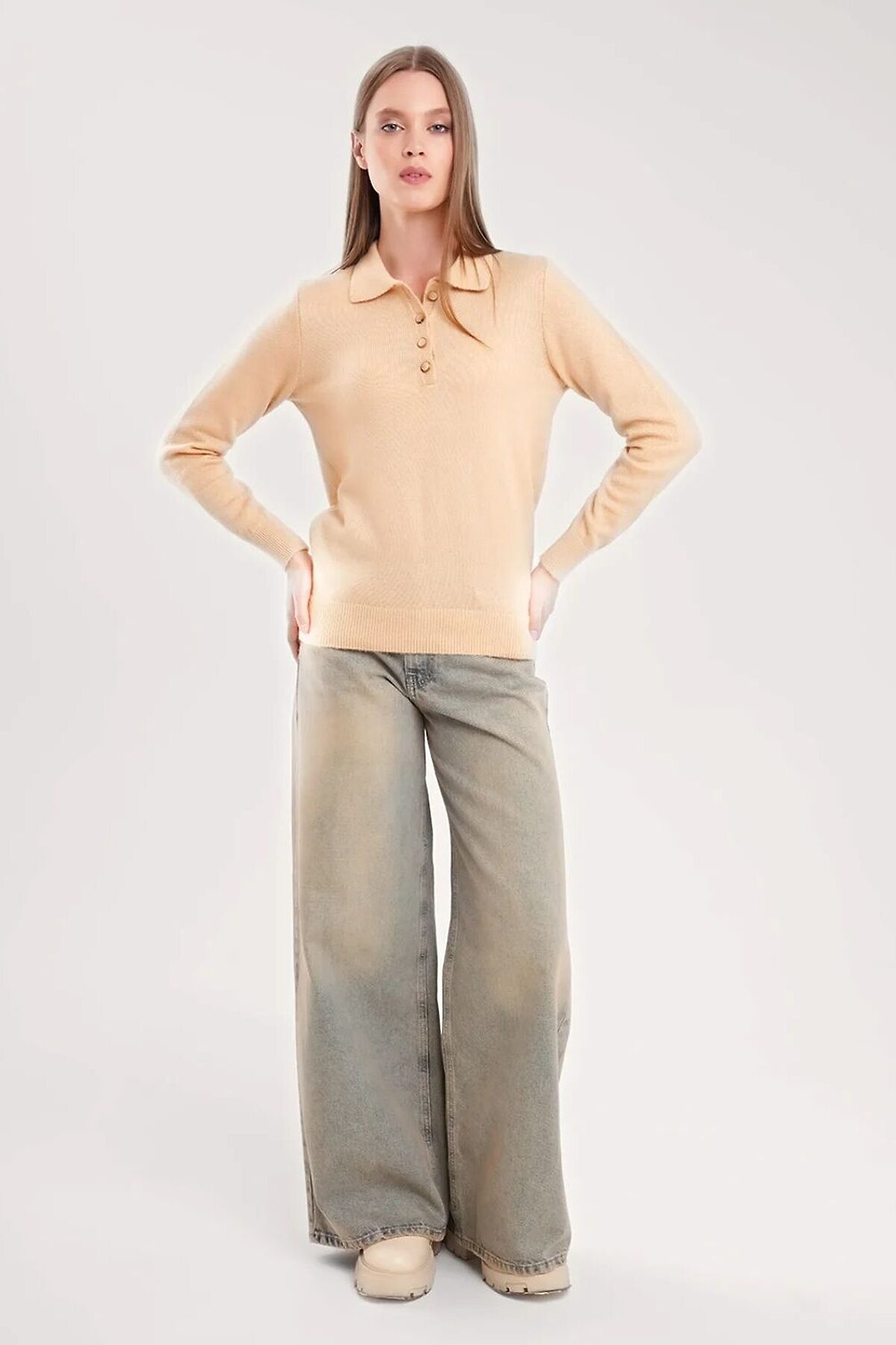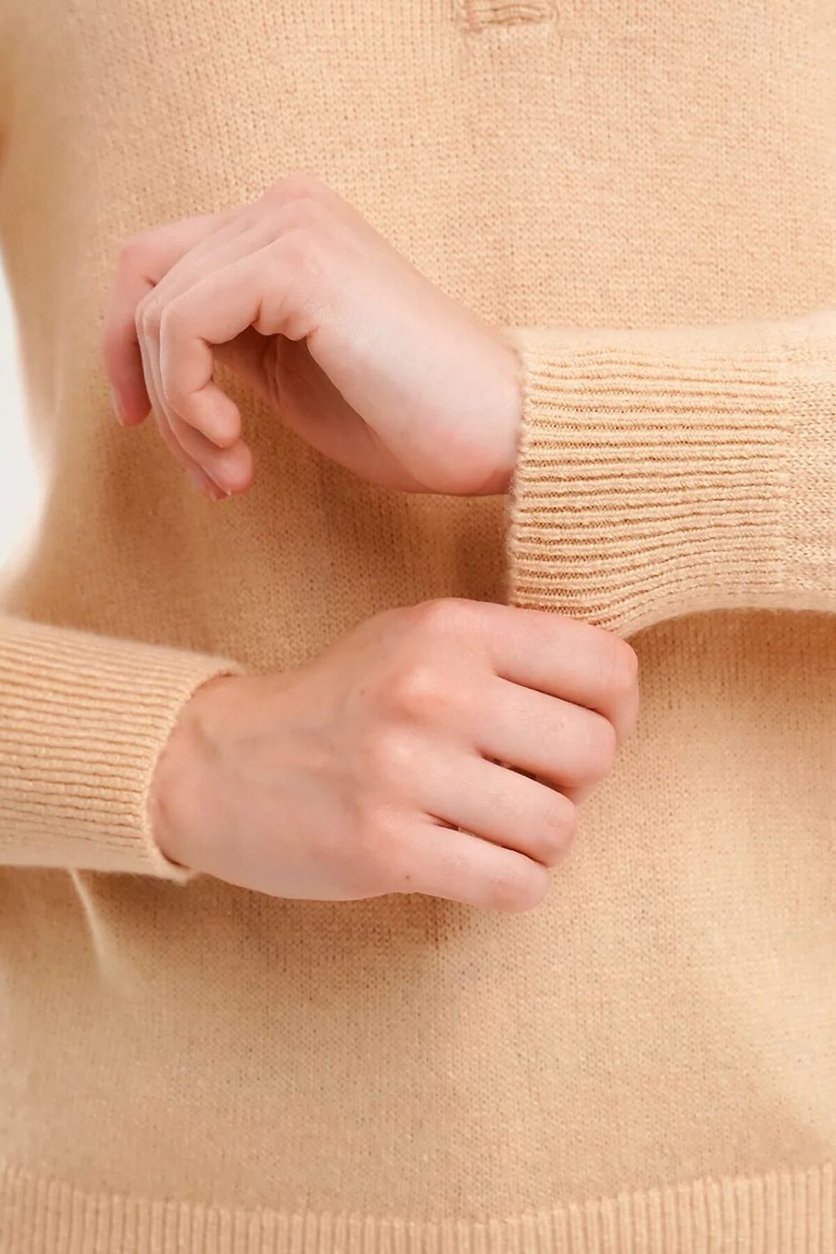 Вязаный джемпер умеренного объема из акриловой пряжи с добавлением шерсти, переплетение гладь. Втачной длинный рукав, по горловине отложной воротник с функциональной планкой и пуговицами. По низу изделия и рукавов манжеты.