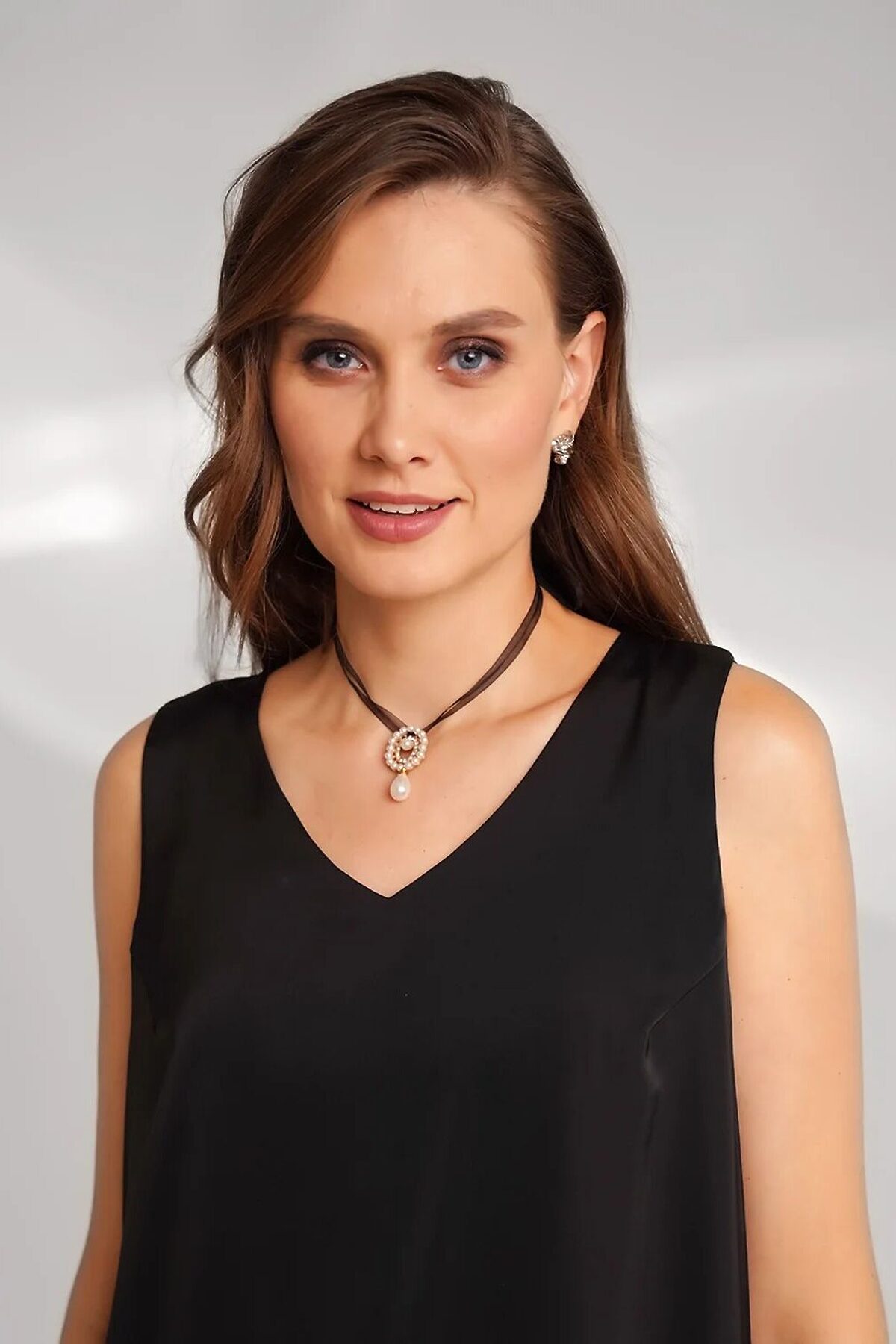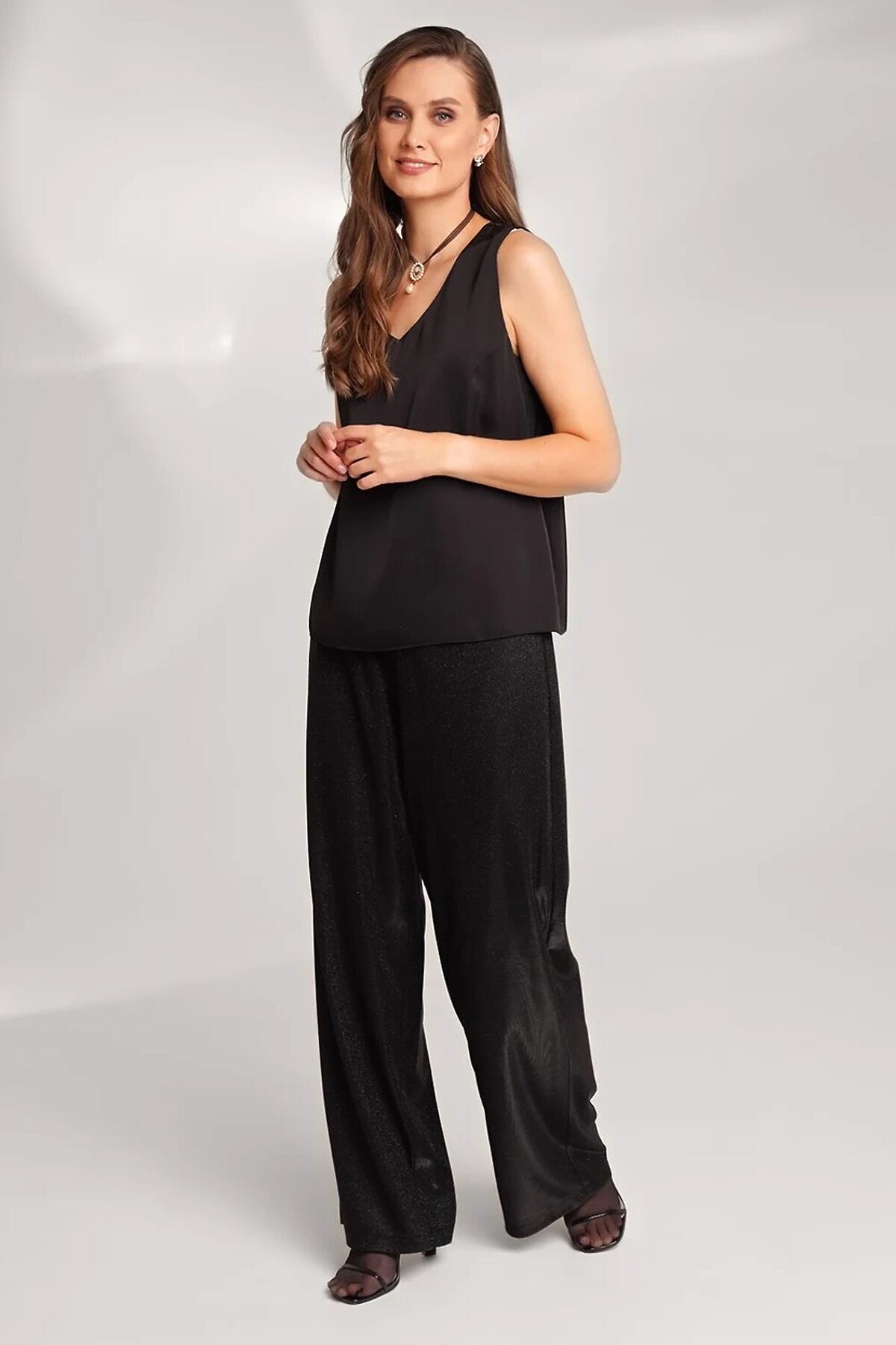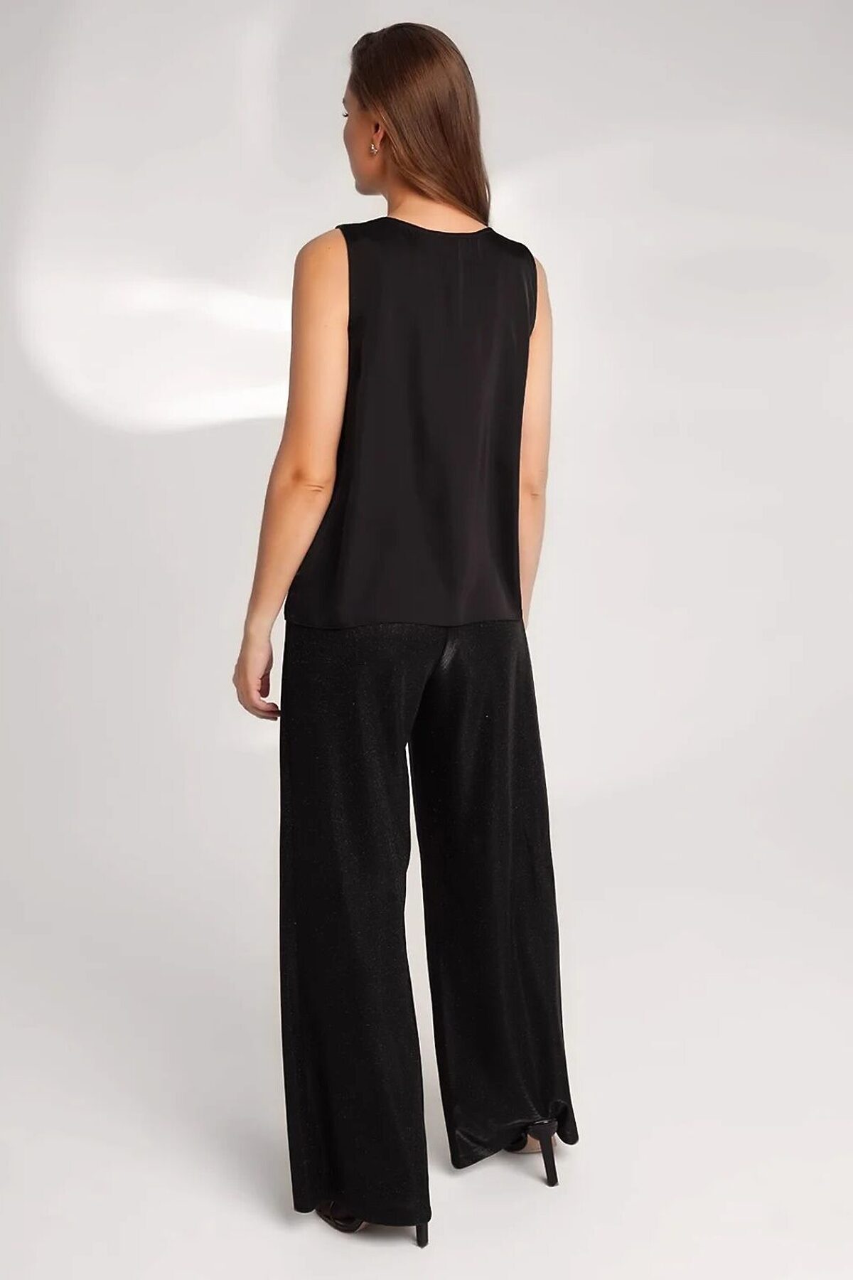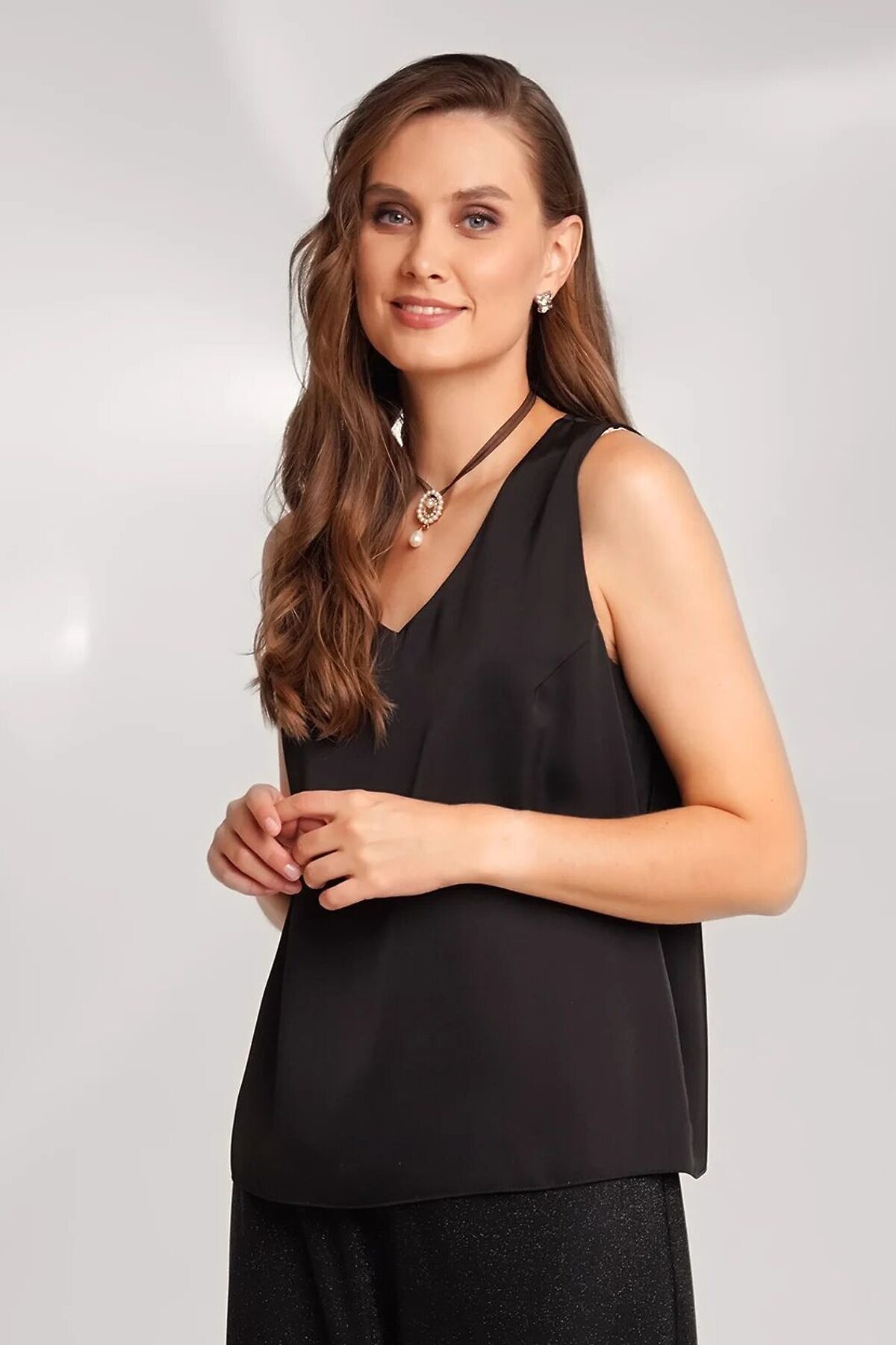 Блузка среднего объема из текстильного полотна атлас стрейч, без рукавов, на широкой бретели. Передняя деталь двойная. По горловине спинки внутренняя окантовка.