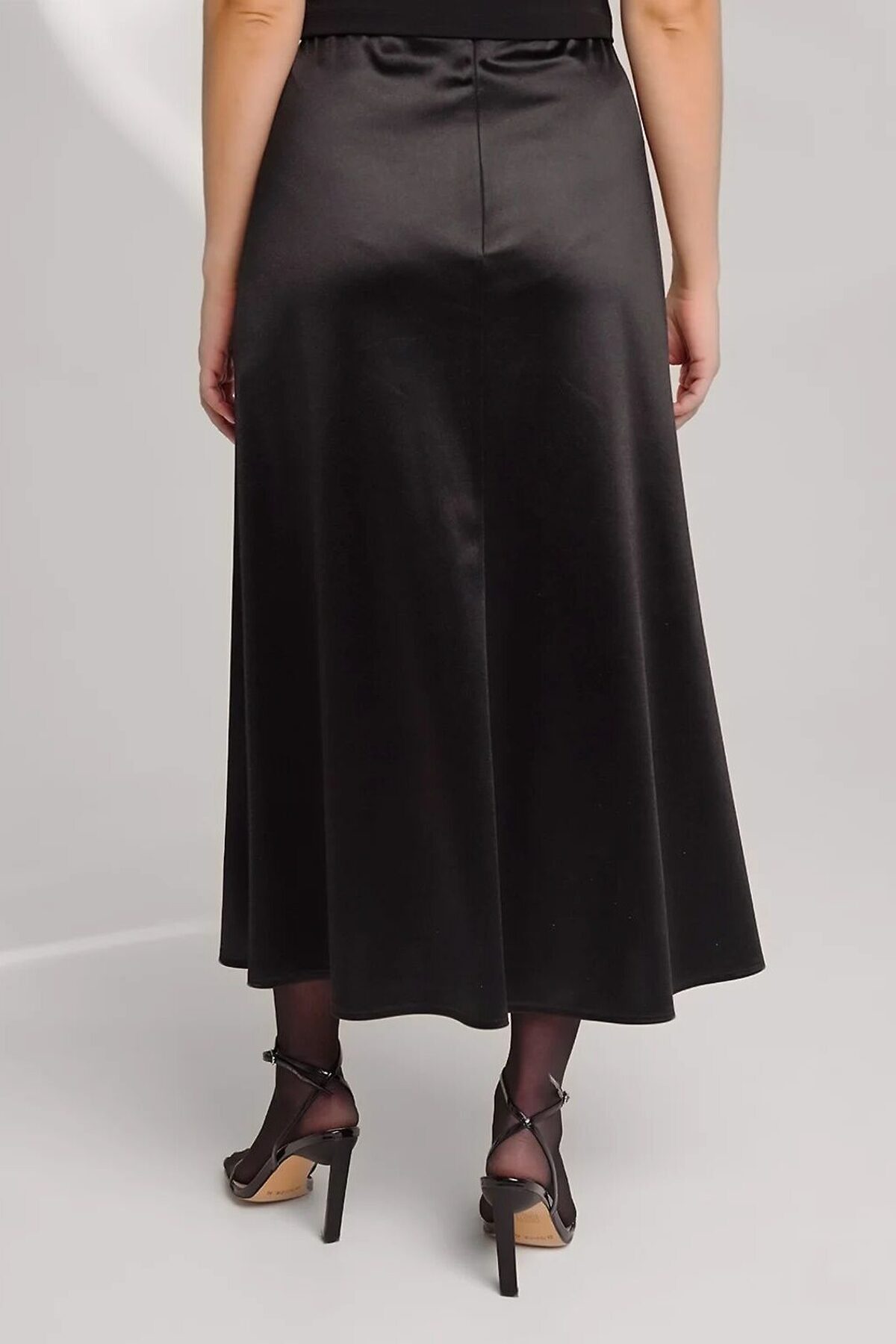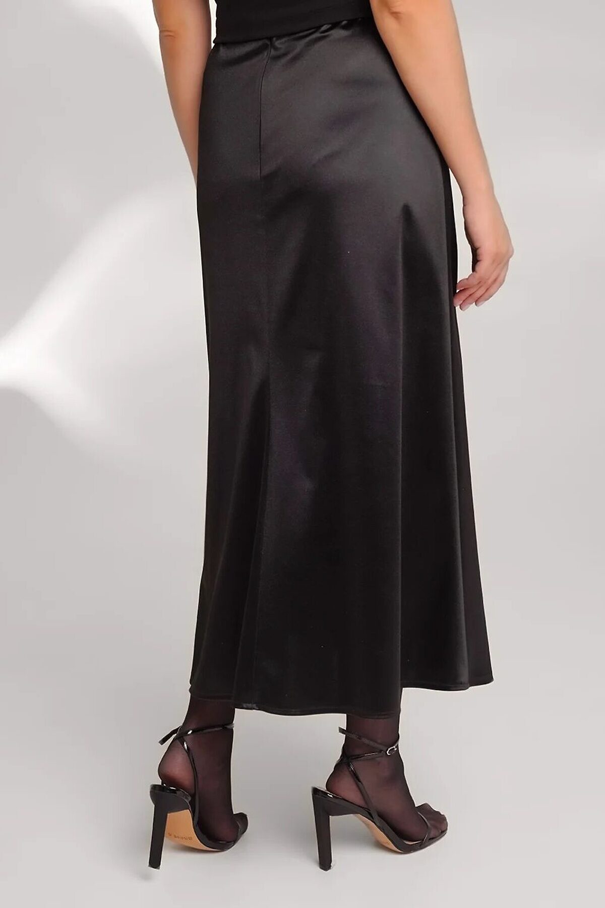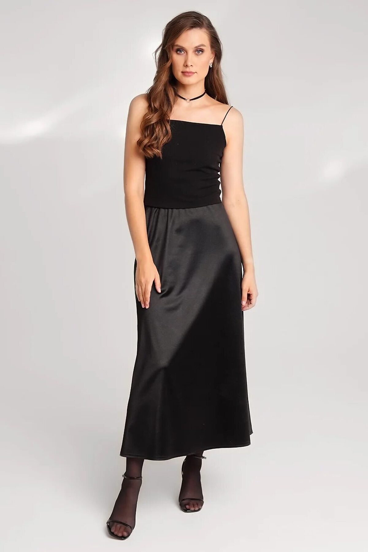 Юбка миди расклешенного силуэта из плотного текстильного полотна под "масло". По талии внутренняя обтачка с резинкой. По спинке средний шов с потайной молнией.