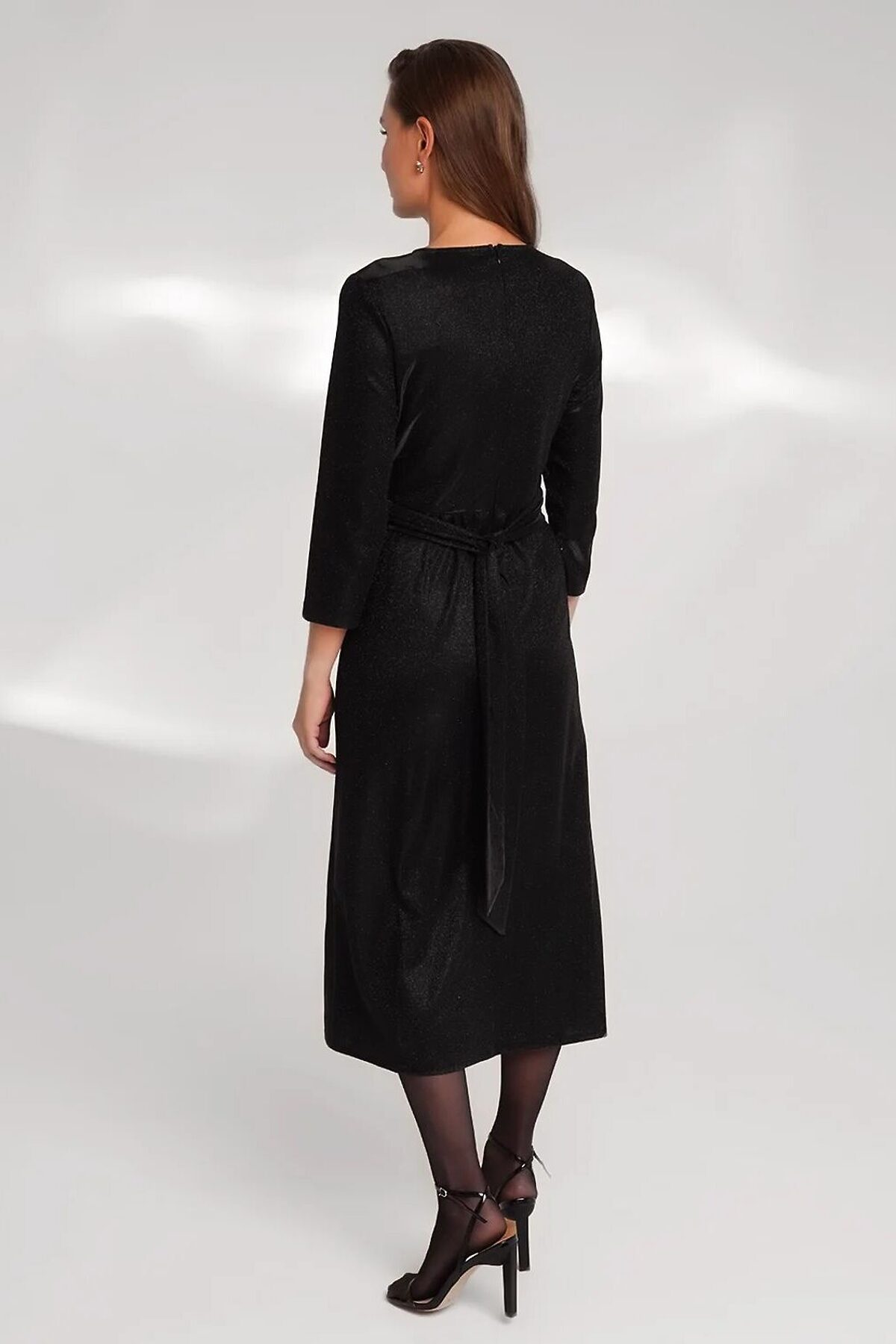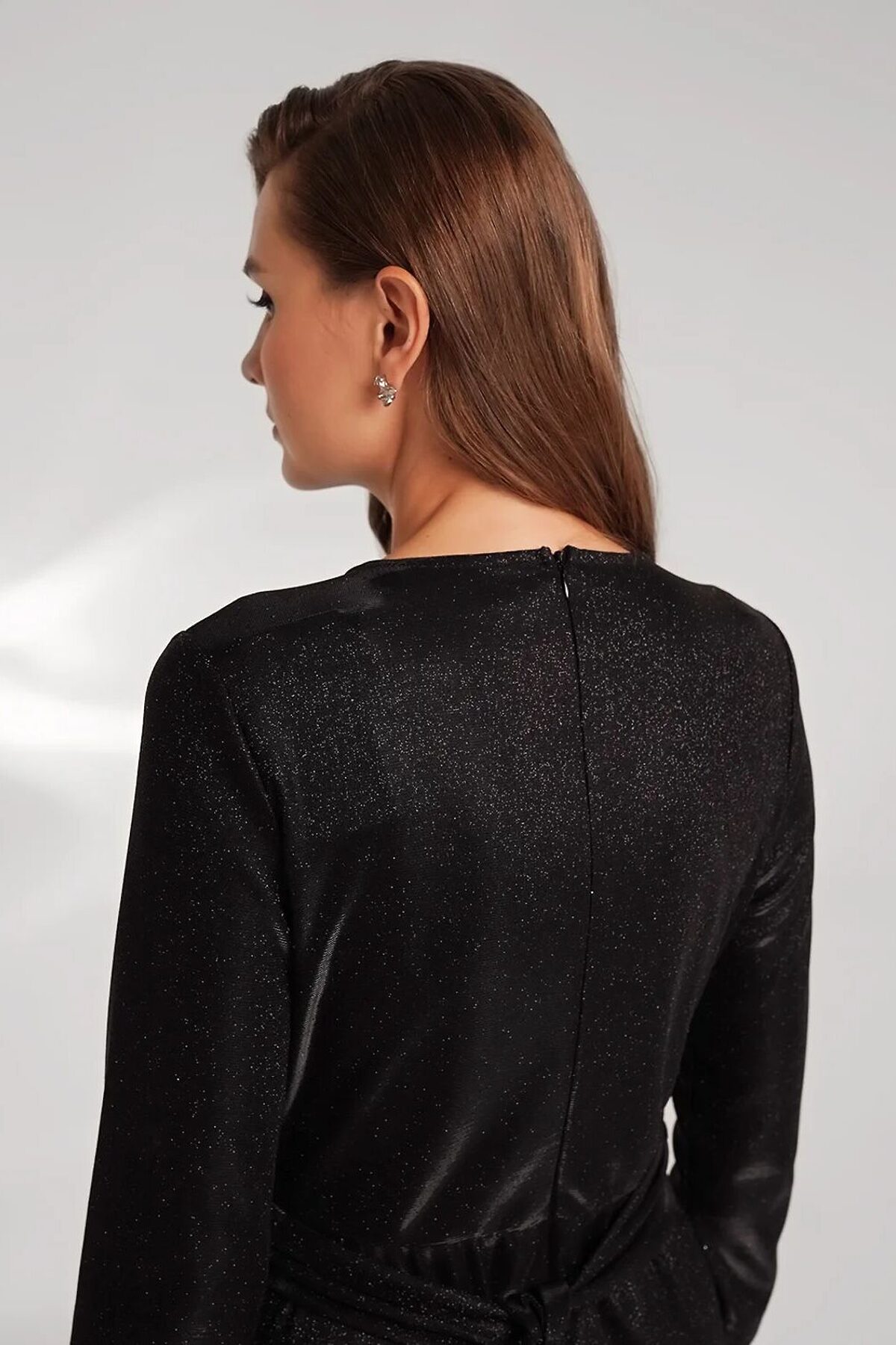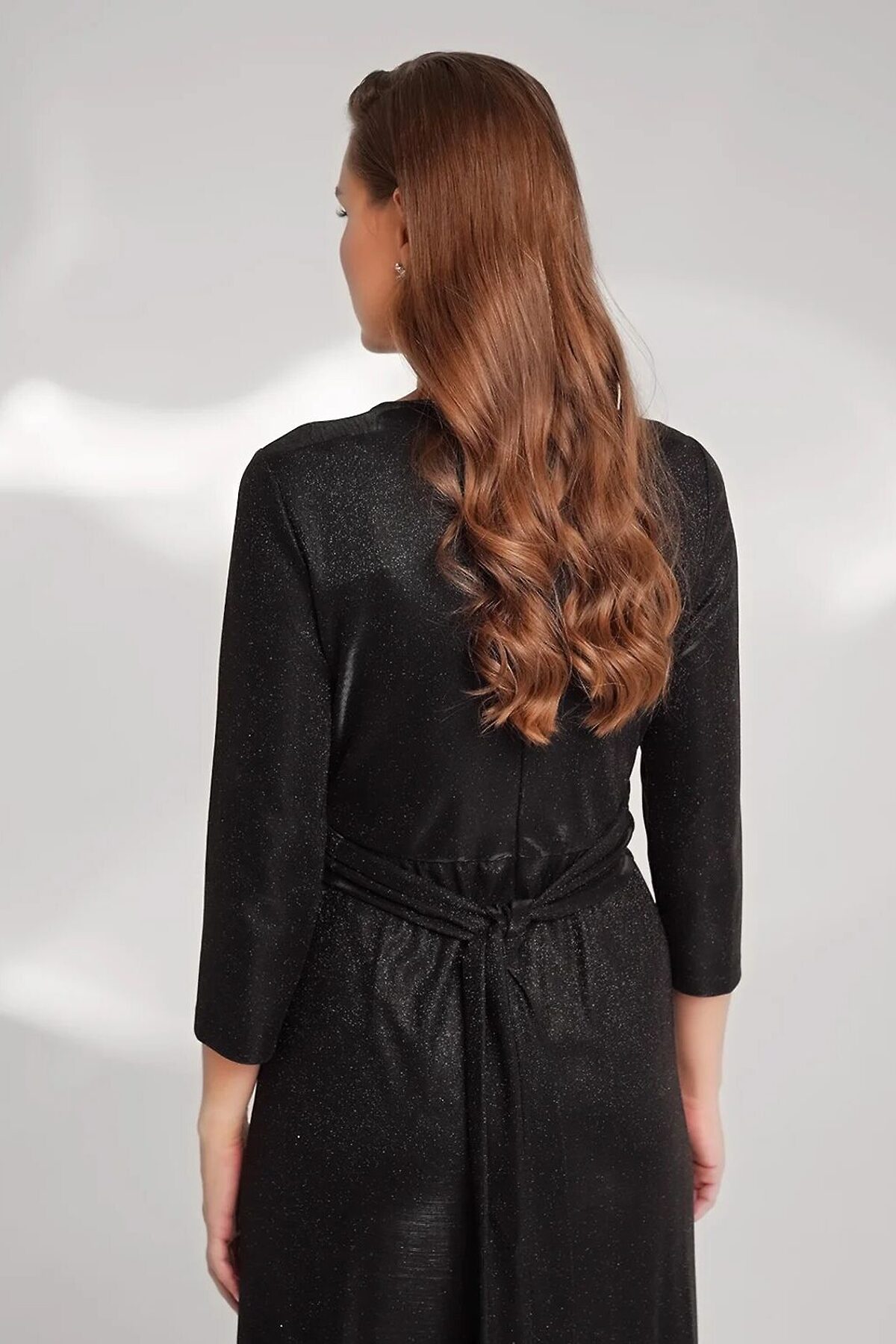 Платье из трикотажного полотна с блеском. Втачной рукав длиной 7/8. Округлая горловина. По переду средний шов до талии с имитацией запаха по груди, переходящая на спинку в завязки. По спинке рез по линии талии и средний шов с застежкой на молнию.