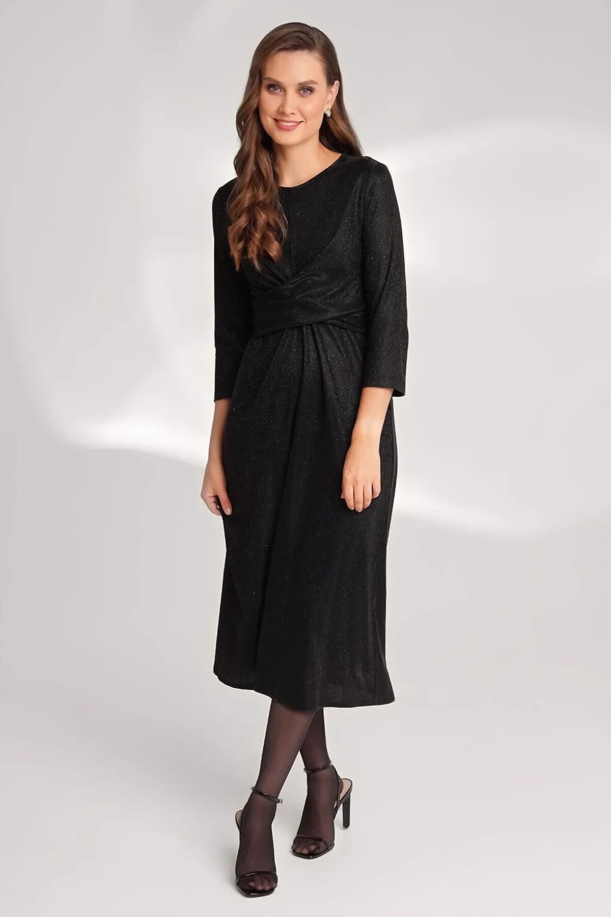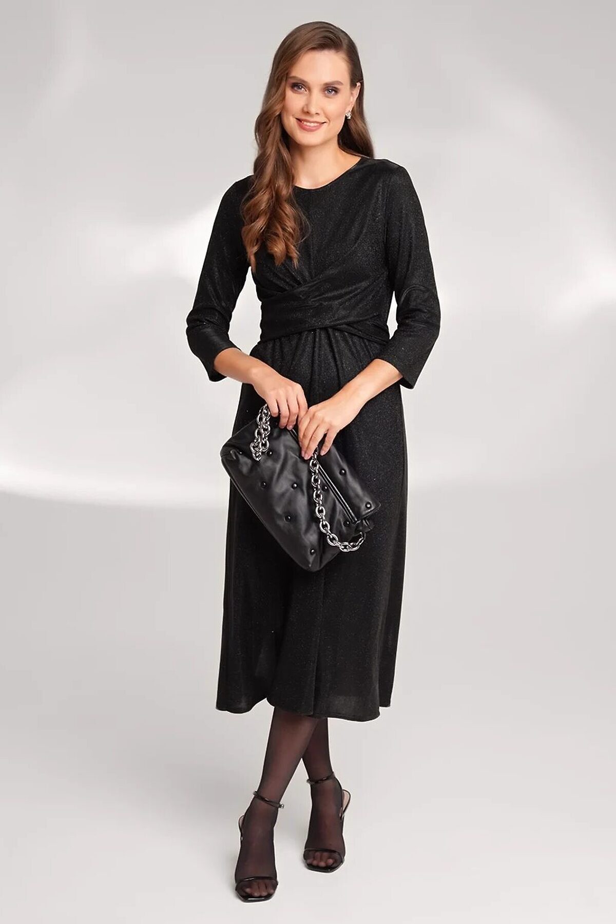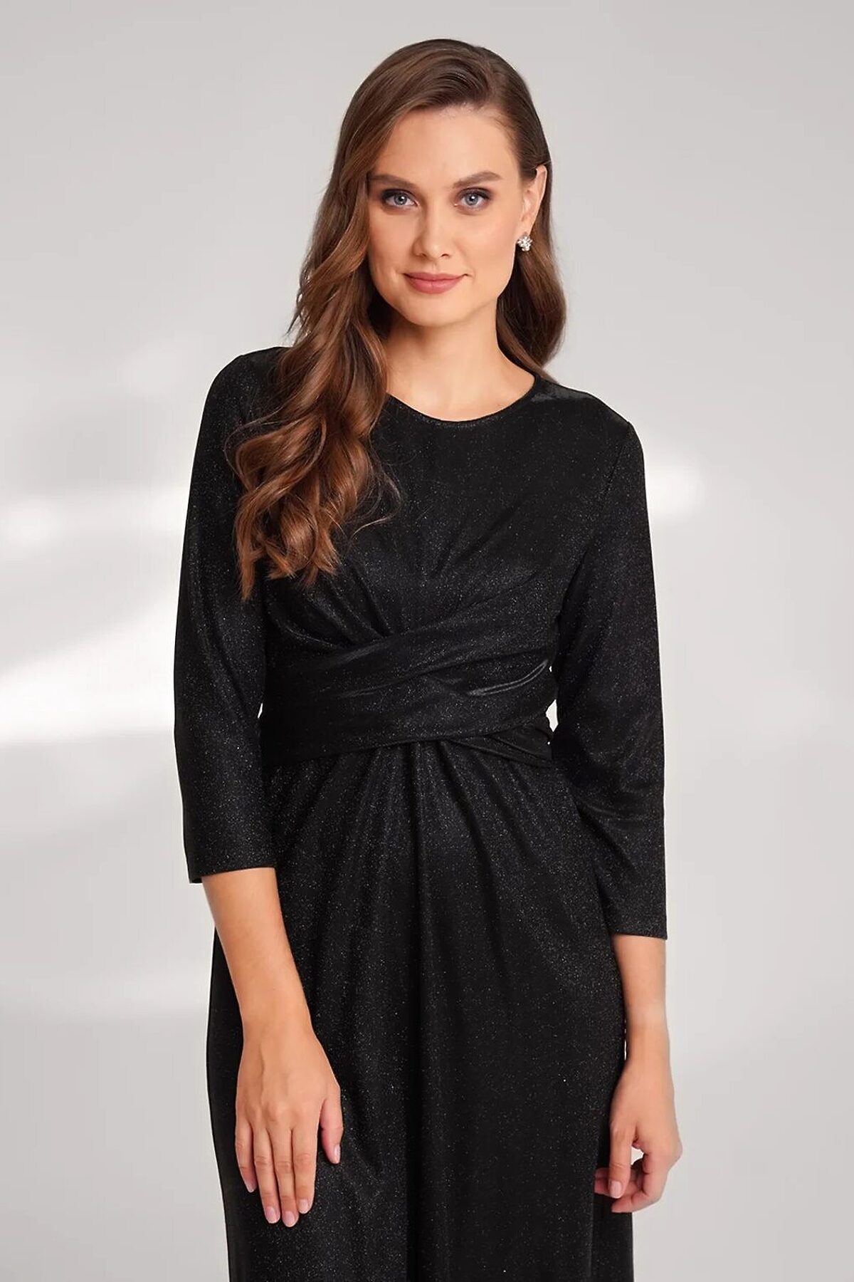 Платье из трикотажного полотна с блеском. Втачной рукав длиной 7/8. Округлая горловина. По переду средний шов до талии с имитацией запаха по груди, переходящая на спинку в завязки. По спинке рез по линии талии и средний шов с застежкой на молнию.