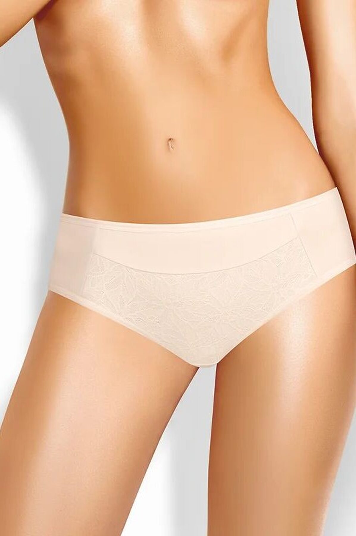 Трусы бикини женские из эластичного хлопкового полотна. По переду рез с кружевной вставкой. Обработка краев по талии и ноге окантовочная резинка.