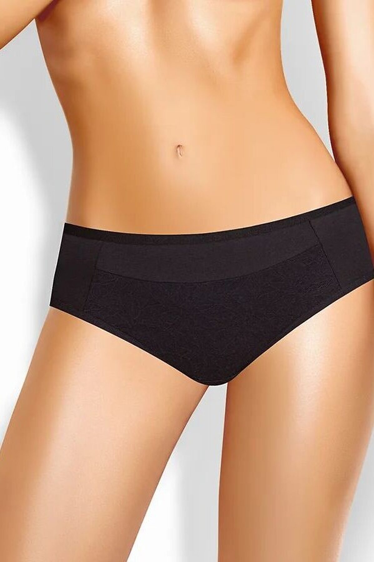 Трусы бикини женские из эластичного хлопкового полотна. По переду рез с кружевной вставкой. Обработка краев по талии и ноге окантовочная резинка.