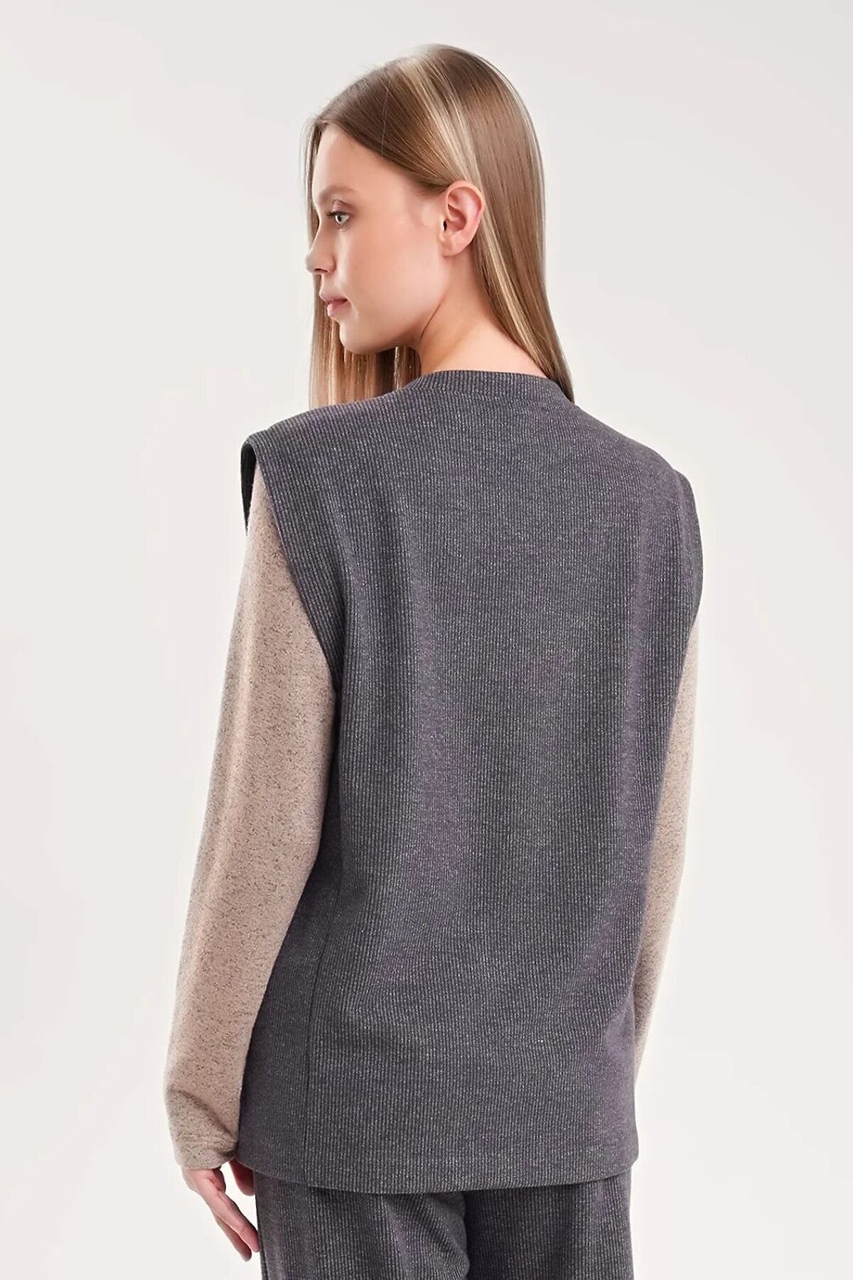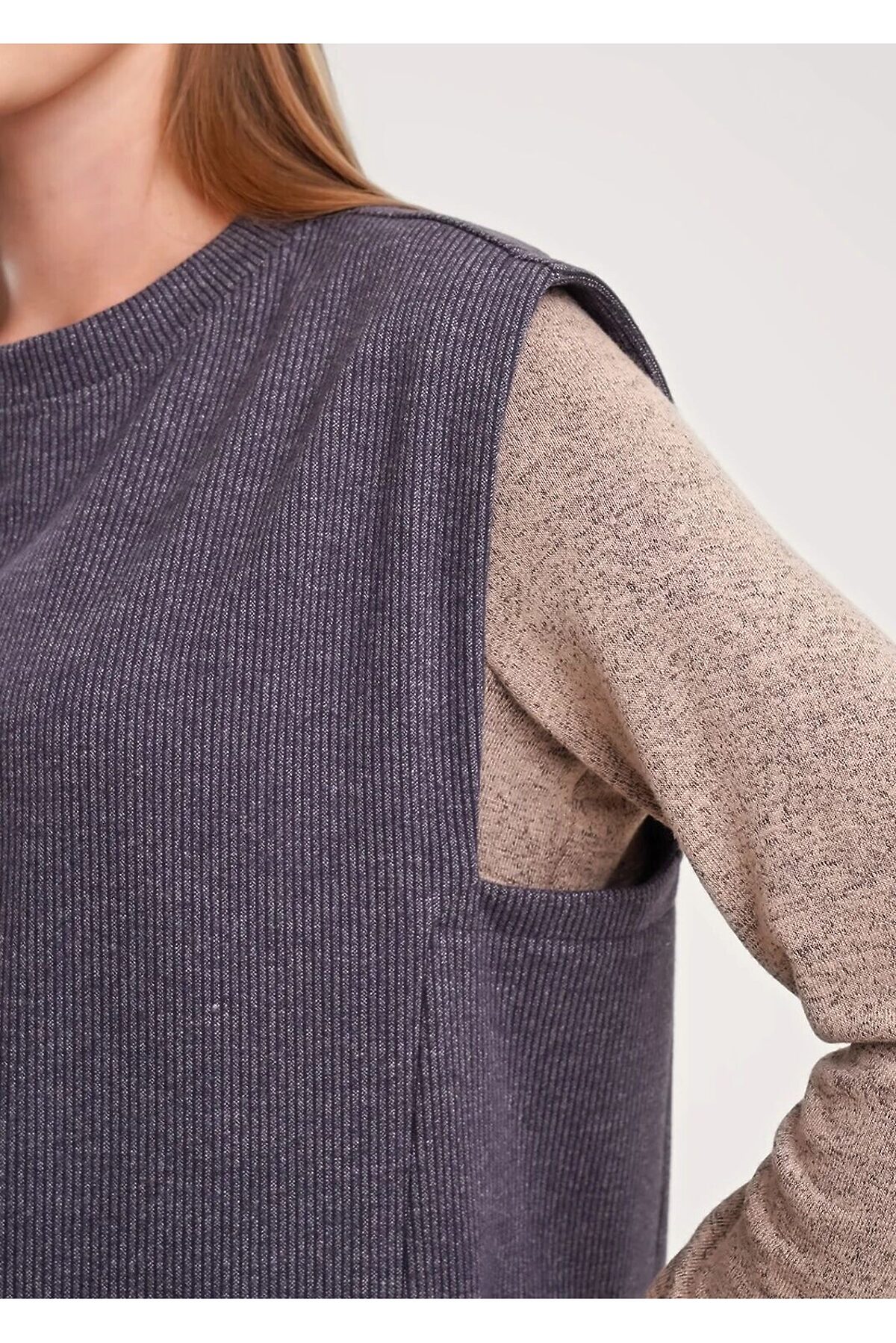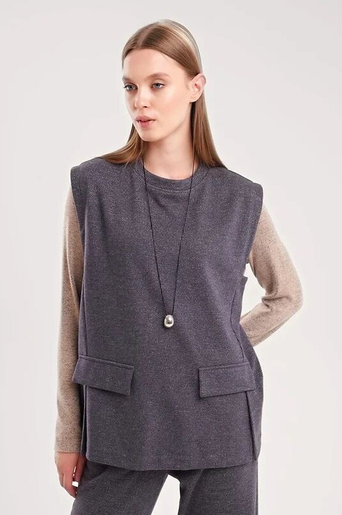 Жилет из трикотажного поливискозного полотна джерси, прямого кроя. Округлая горловина с обтачкой. По пройме подкройная обтачка. Спереди резы со шлицей и декоративными клапанами. По низу изделия потайной стежок.