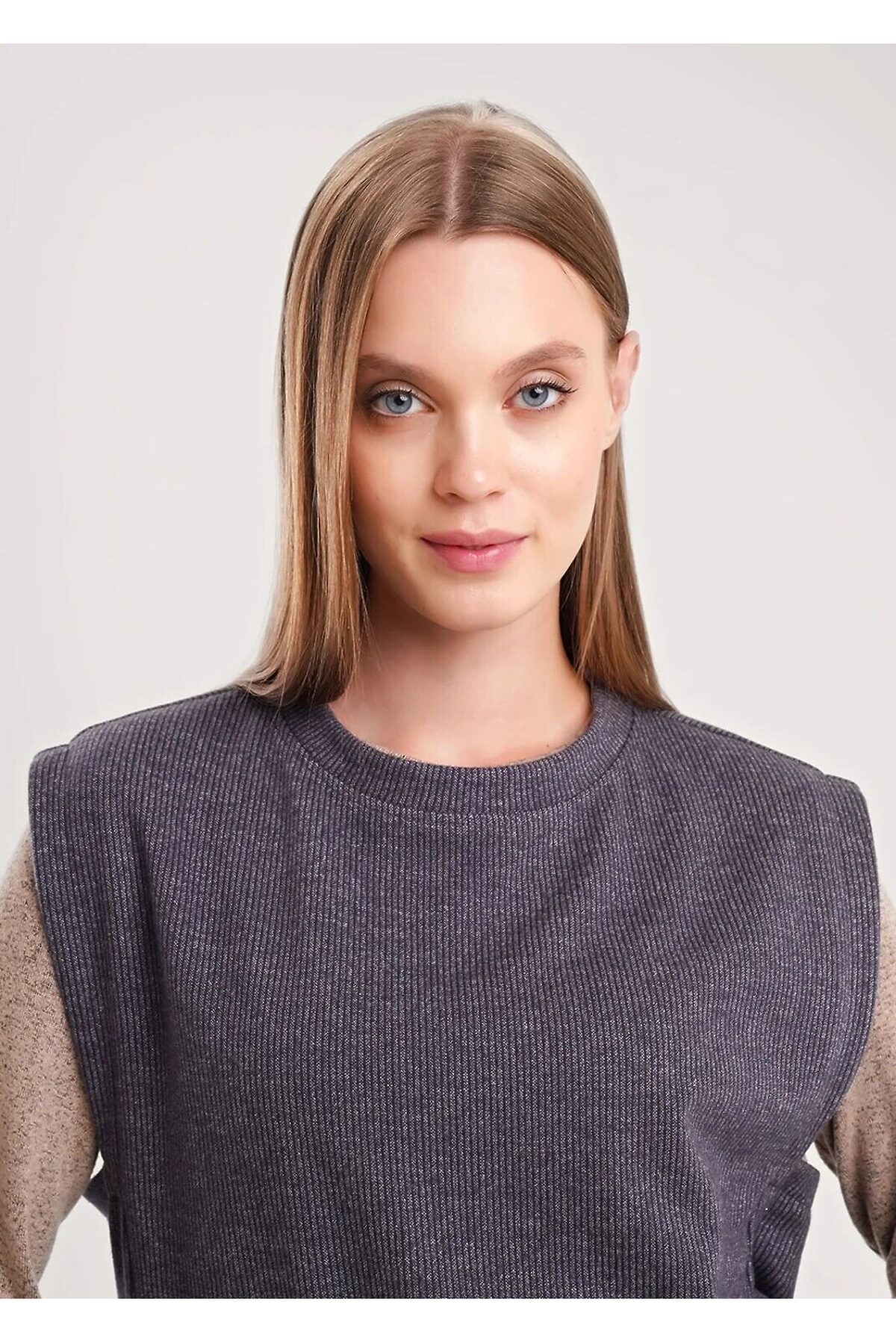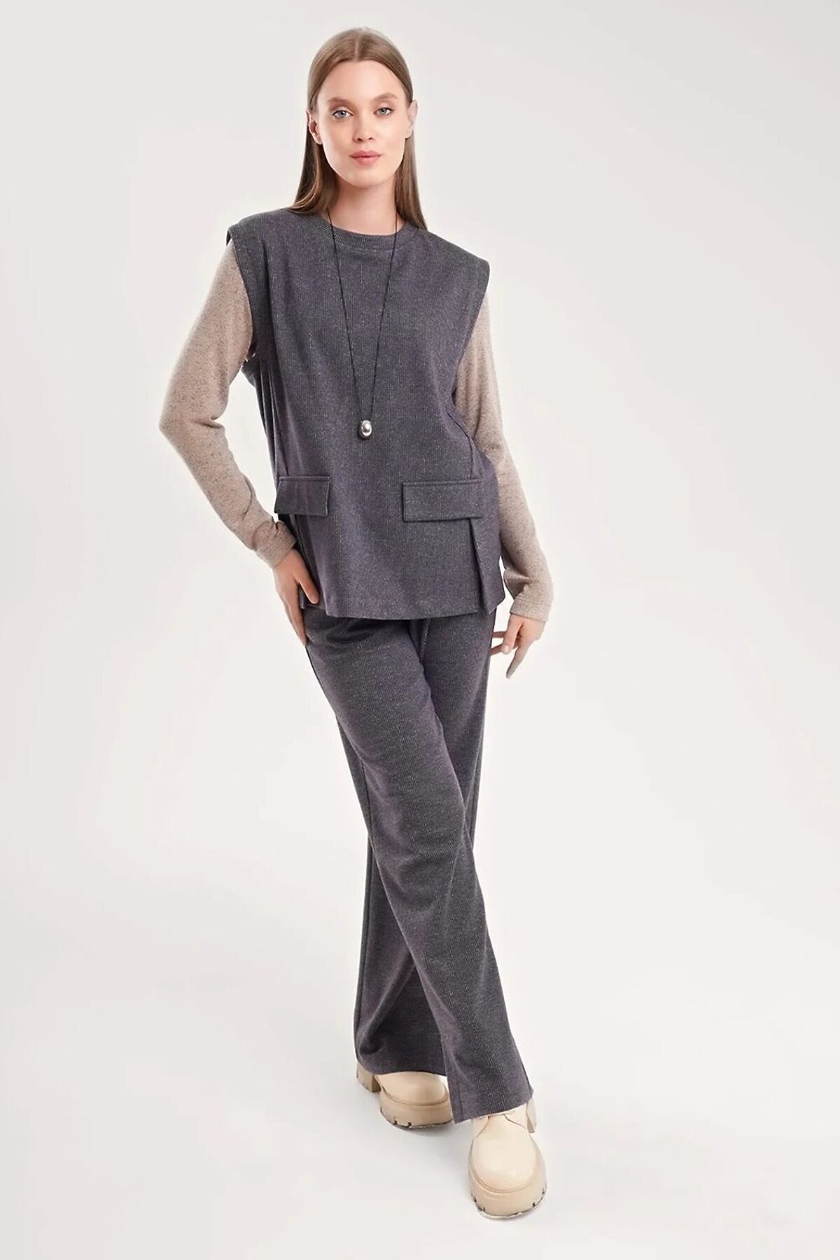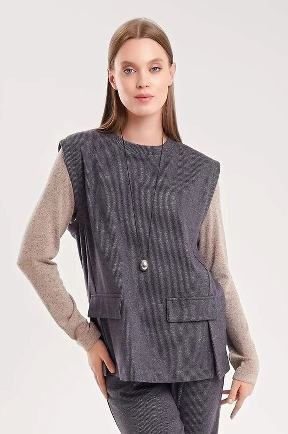 Жилет из трикотажного поливискозного полотна джерси, прямого кроя. Округлая горловина с обтачкой. По пройме подкройная обтачка. Спереди резы со шлицей и декоративными клапанами. По низу изделия потайной стежок.