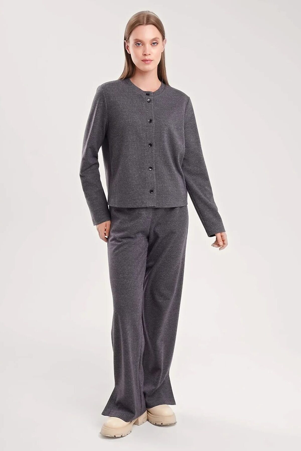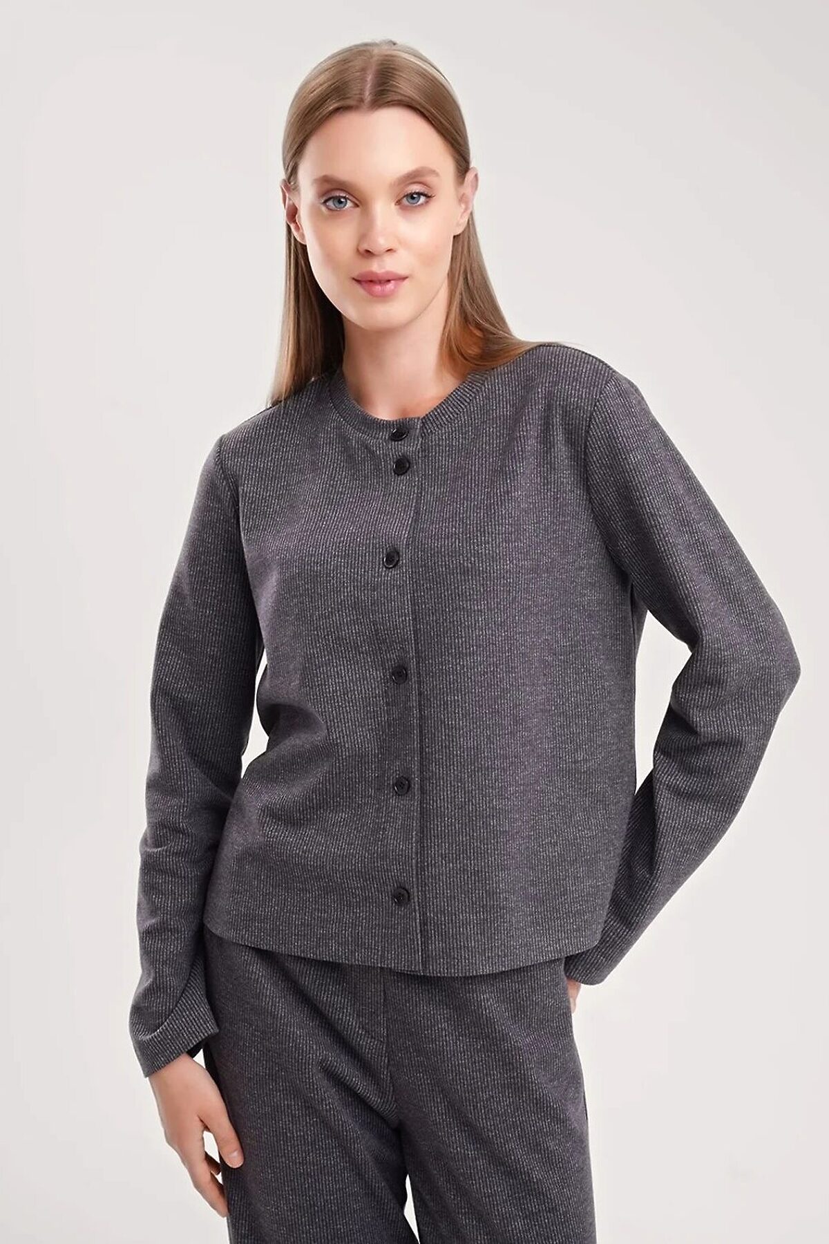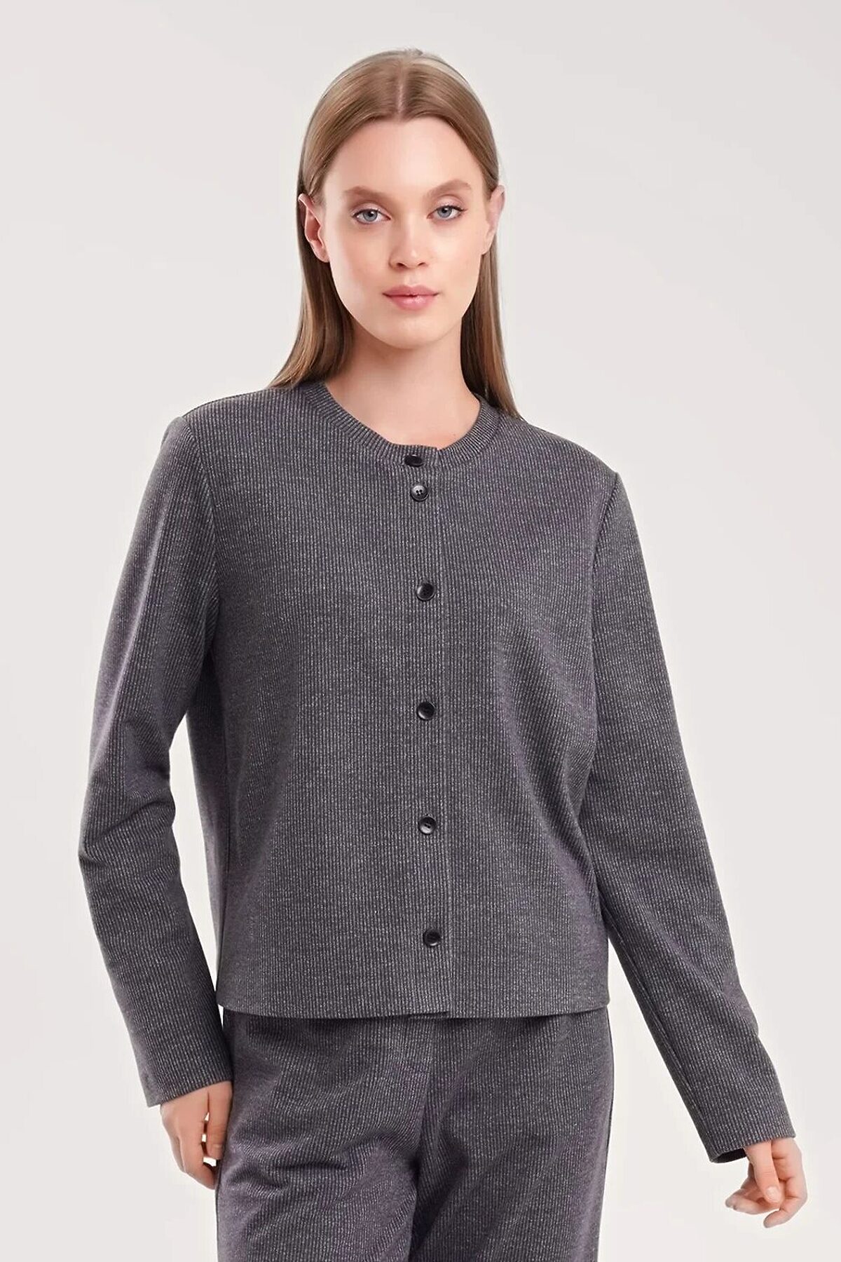 Жакет прямого кроя из трикотажного поливискозного полотна джерси с застежкой на пуговицы. Втачной длинный рукав. Округлая горловина с обтачкой. По низу рукава и изделия потайной стежок.